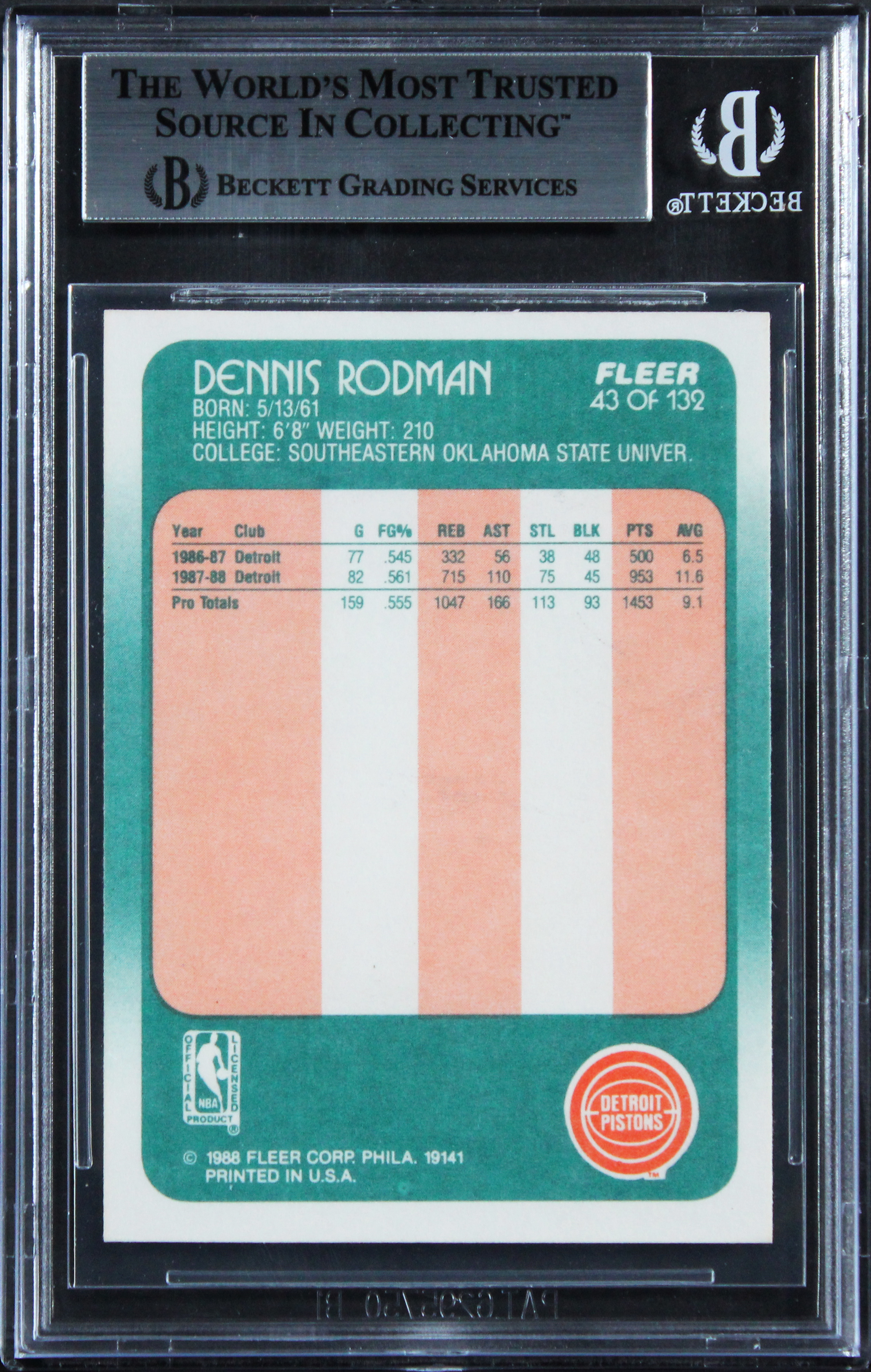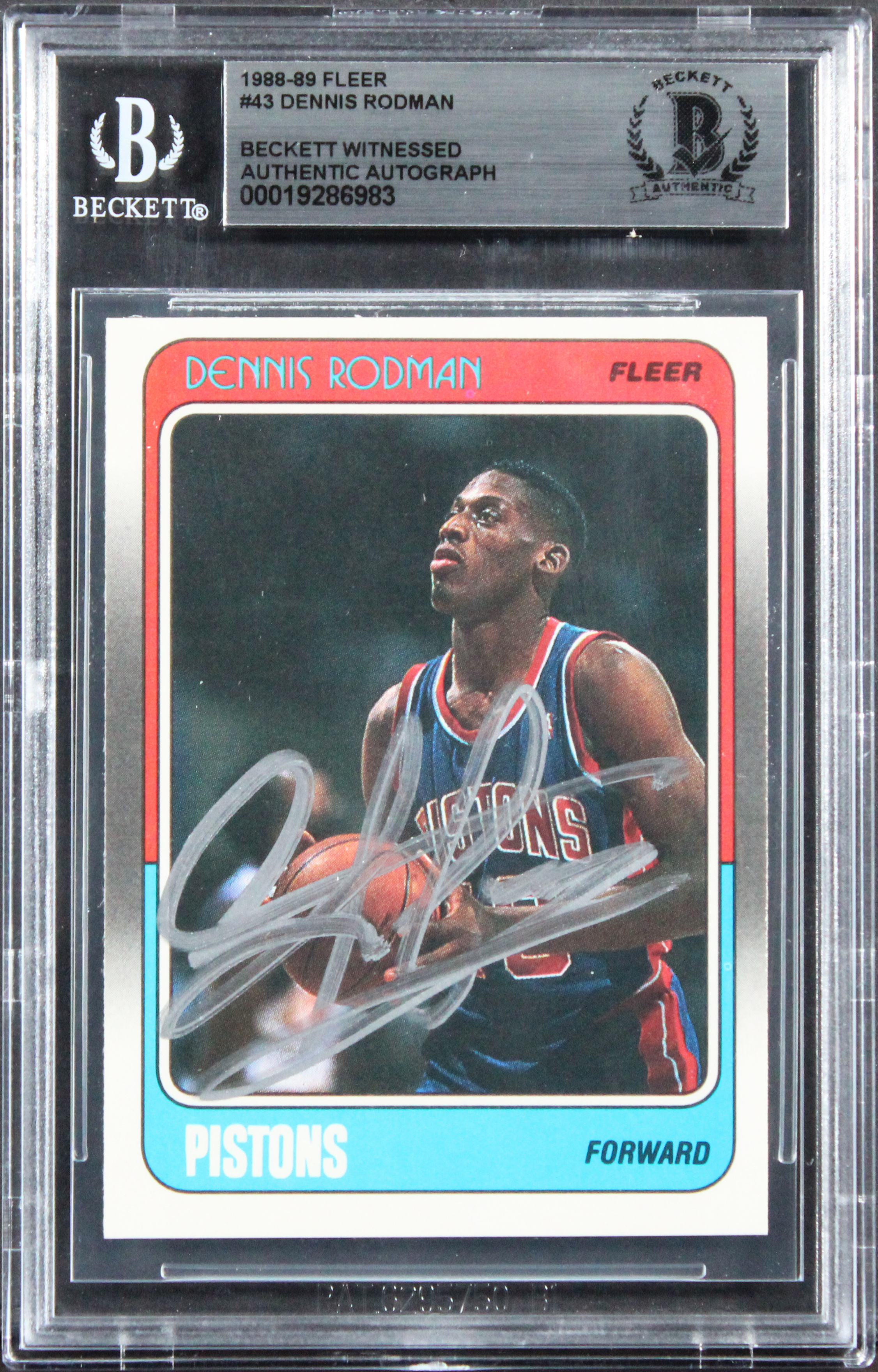 This Autographed 1988 Fleer #43 Rookie Card has been Personally Signed by Dennis Rodman of the Detroit Pistons. This item is 100% Authentic, it comes slabbed and authenticated by Beckett Authentication Services. The authenticity can be verified on Beckett Authentication Services website.