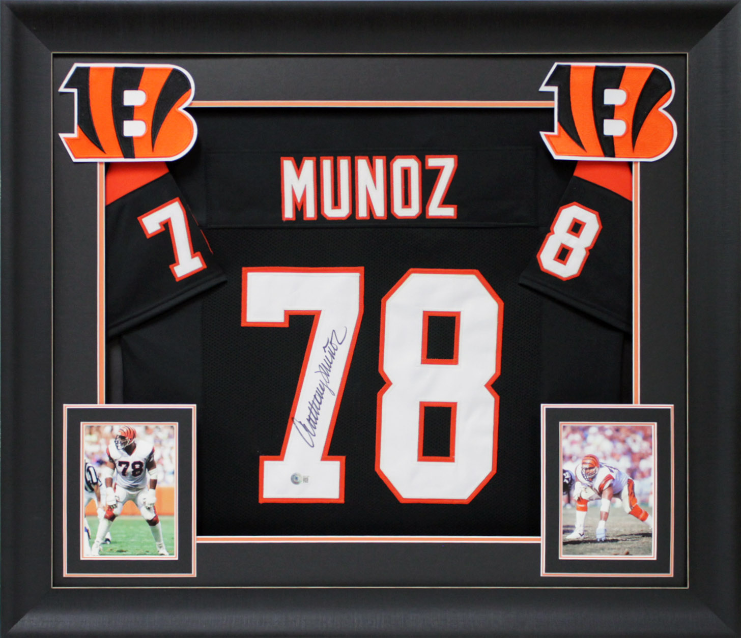 This Autographed Black Pro Style Framed Jersey has been Personally Signed by Anthony Munoz of the Cincinnati Bengals. This item is 100% Authentic to include a hologram by Beckett Authentication Services. This item may come with the new Beckett Authentication hologram that has a scannable QR code rather than the traditional COA. If you would like to have a COA, you are welcome to reach out to Beckett for a printed certification once you receive your item. This is a BAS Witnessed Protection Program item which means a Beckett Authentication Service representative was present when this item was being signed. We conducted an autograph signing with Anthony Munoz where multiples of the same item were signed. While the photographs are representative of this item, the size, placement and strength of the signature may vary. Each item is hand signed, therefore, each autograph is unique. This item can be verified through BAS Witnessed. This item has been professionally framed to overall dimensions of approximately 32 x 37 inches. This is a X-Large sized, non-branded, custom-stitched Framed Jersey. This jersey will be framed to order, it will take 3-4 days from purchase date for it to ship.