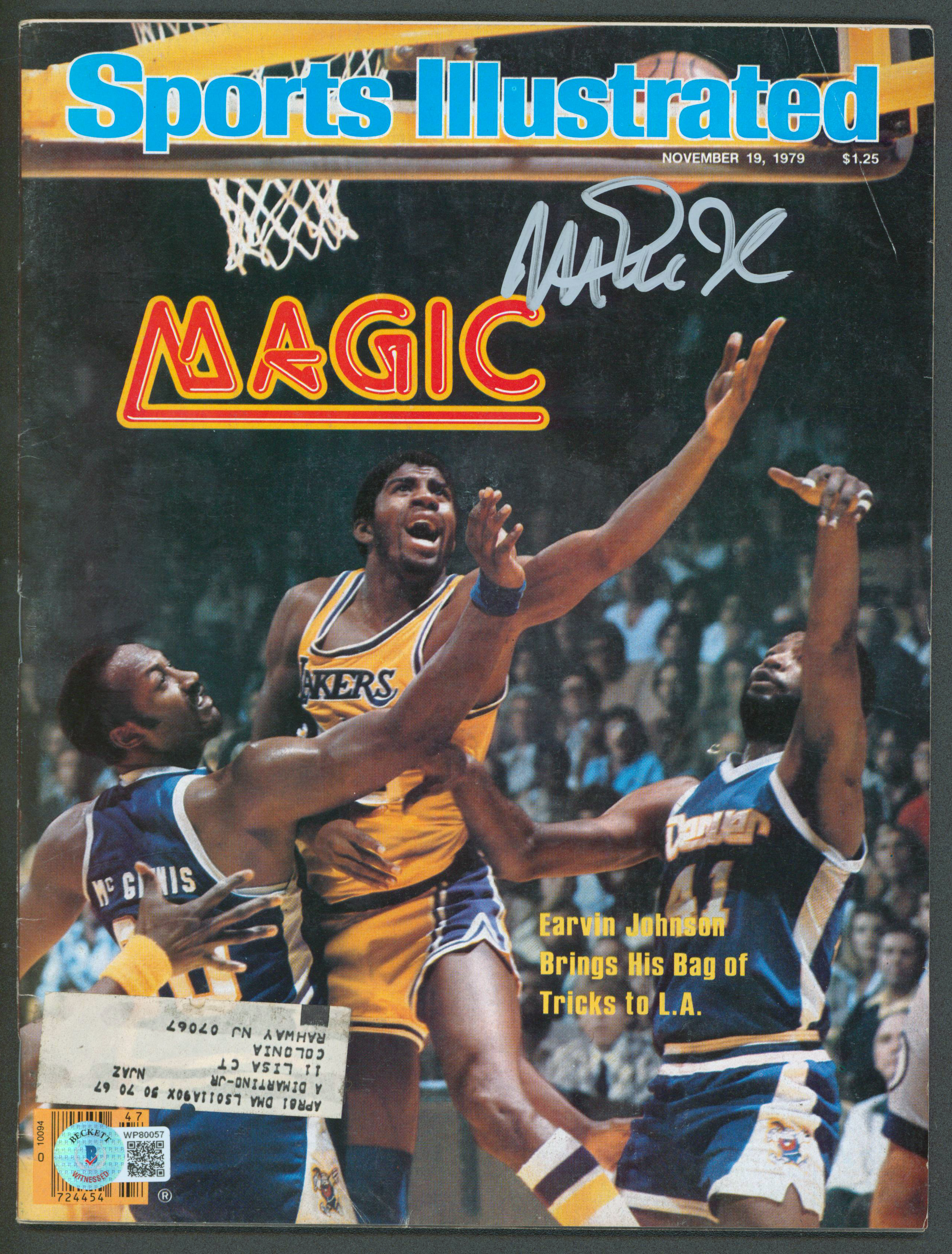 This Autographed Sports Illustrated November 19, 1979 Magazine has been Personally Signed by Magic Johnson of the Los Angeles Lakers. This item is 100% Authentic to include a hologram by Beckett Authentication Services. This item will come with the new Beckett Authentication hologram that has a scannable QR code rather than the traditional COA. If you would like to have a COA, you are welcome to reach out to Beckett for a printed certification once you receive your item. This is a BAS Witnessed Protection Program item which means a Beckett Authentication Service representative was present when this item was being signed. This is a stock item. We conducted an autograph signing with Magic Johnson and we have several of these available. The one you will receive will be of equal quality to the one pictured. This item can be verified through BAS Witnessed.