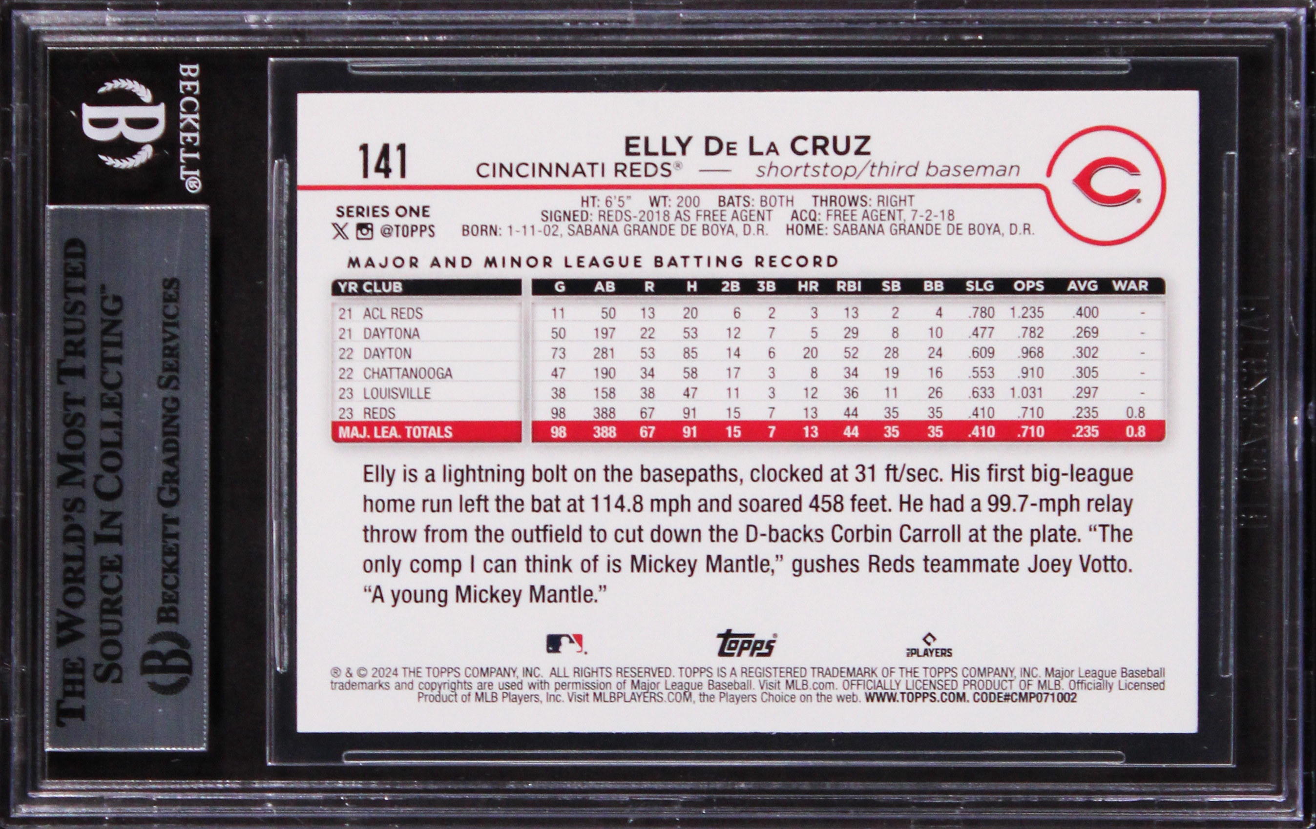 This Autographed 2024 Topps #141 Card has been Personally Signed by Elly De La Cruz of the Cincinnatti Reds. This item is 100% Authentic, it comes slabbed and authenticated by Beckett Authentication Services. The authenticity can be verified on Beckett Authentication Services website.