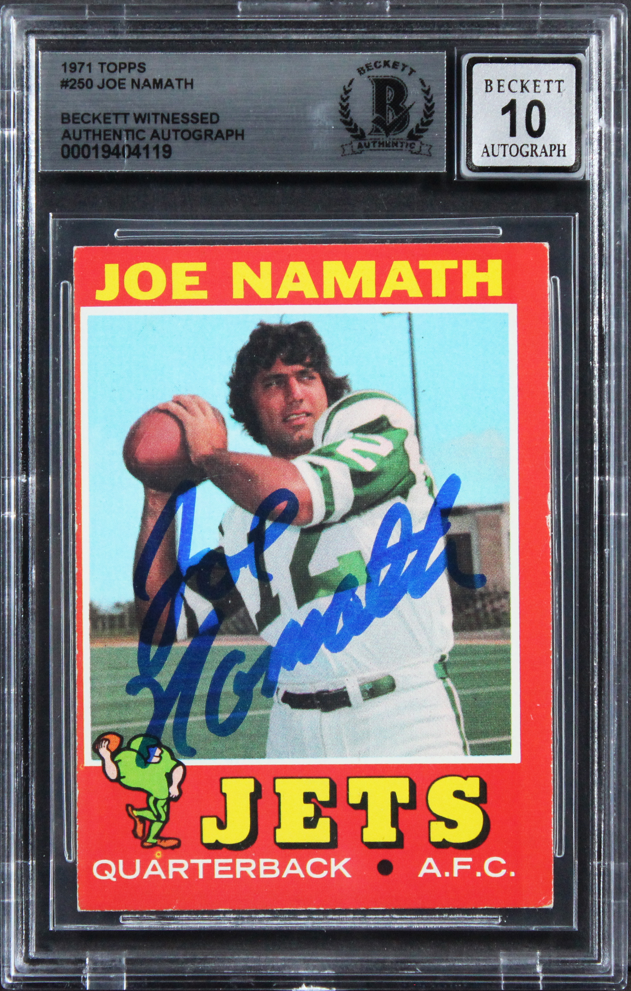 This Autographed Auto Graded Gem Mint 10! 1971 Topps #250 Card has been Personally Signed by Joe Namath of the New York Jets. This item is 100% Authentic, it comes slabbed and authenticated by Beckett Authentication Services. The authenticity can be verified on Beckett Authentication Services website.