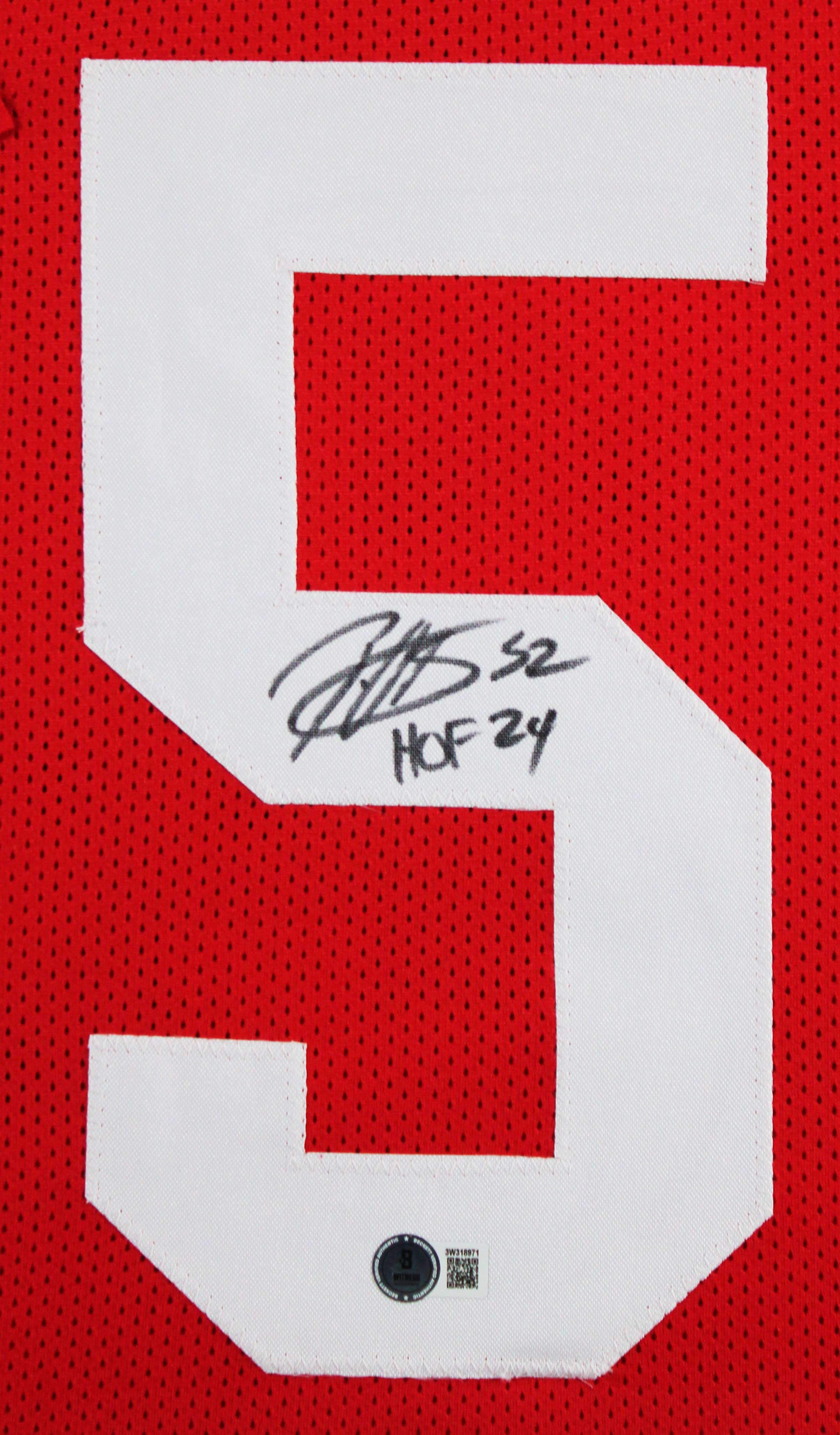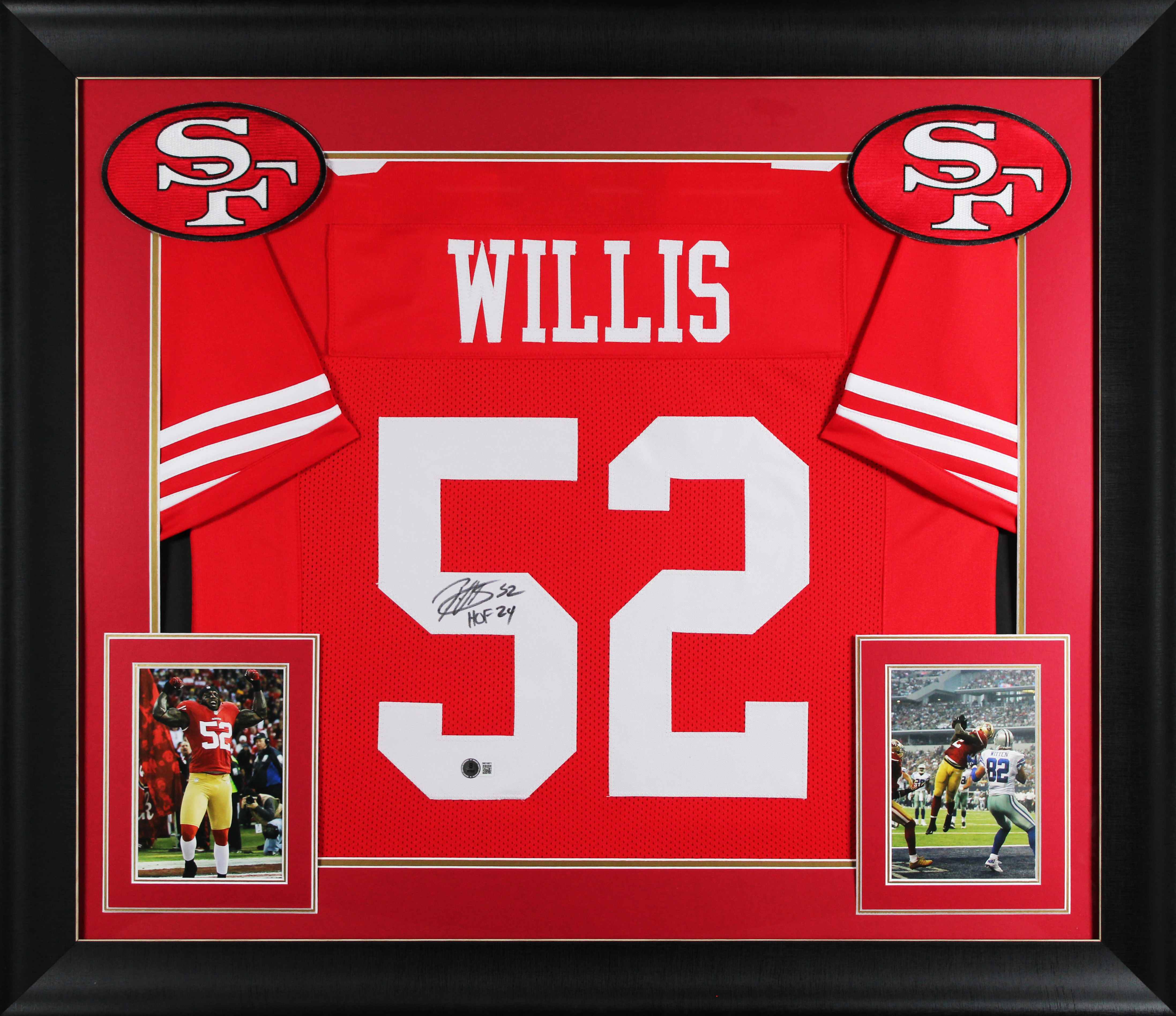 This Autographed Red Pro Style Framed Jersey with the inscription of "HOF 24" has been Personally Signed by Patrick Willis of the San Francisco 49ers. This item is 100% Authentic to include a hologram by Beckett Authentication Services. This item will come with an affixed Beckett Authentication Services (BAS) authentication sticker, which includes a scannable QR code to verify authenticity. Please note that Beckett no longer provides serial-numbered COA cards, and the attached BAS sticker will serve as the complete authentication for this item. This is a BAS Witnessed Protection Program item which means a Beckett Authentication Service representative was present when this item was being signed. We conducted an autograph signing with Patrick Willis where multiples of the same item were signed. While the photographs are representative of this item, the size, placement and strength of the signature may vary. Each item is hand signed, therefore, each autograph is unique. This item can be verified through BAS Witnessed. This item has been professionally framed to overall dimensions of approximately 32 x 37 inches. This is a X-Large sized, non-branded, custom-stitched Framed Jersey. This jersey will be framed to order, it will take approximately 4-5 business days from purchase date for it to ship.