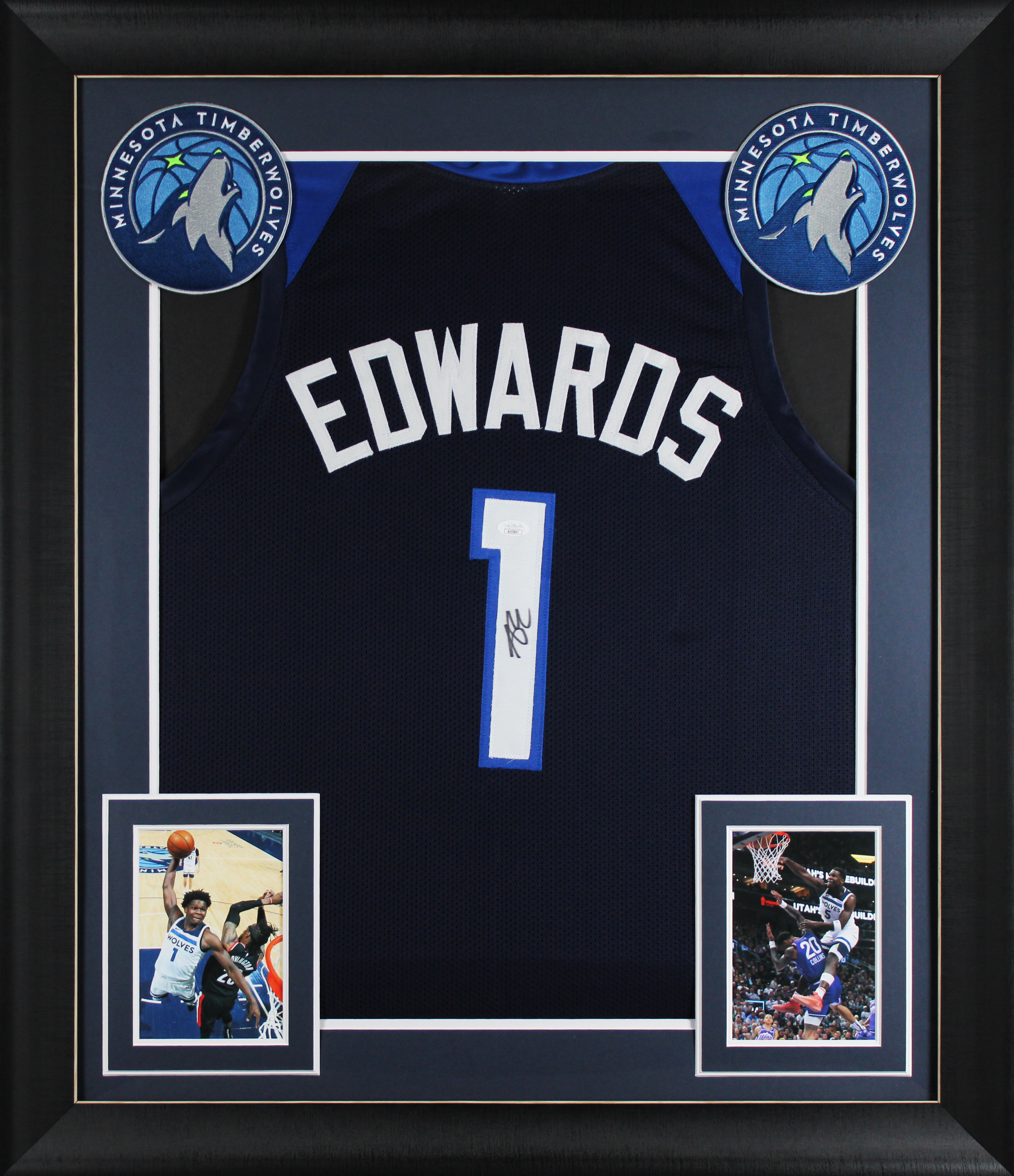This Autographed Navy Blue Pro Style Framed Jersey has been Personally Signed by Anthony Edwards of the Minnesota Timberwolves. This item is 100% Authentic to include a Certificate of Authenticity (COA) / hologram by JSA. The authenticity can be verified on JSA website. This item has been professionally framed to overall dimensions of approximately 32 x 37 inches. This is a X-Large sized, non-branded, custom-stitched Framed Jersey. The jersey numbers are sewn slightly crooked.