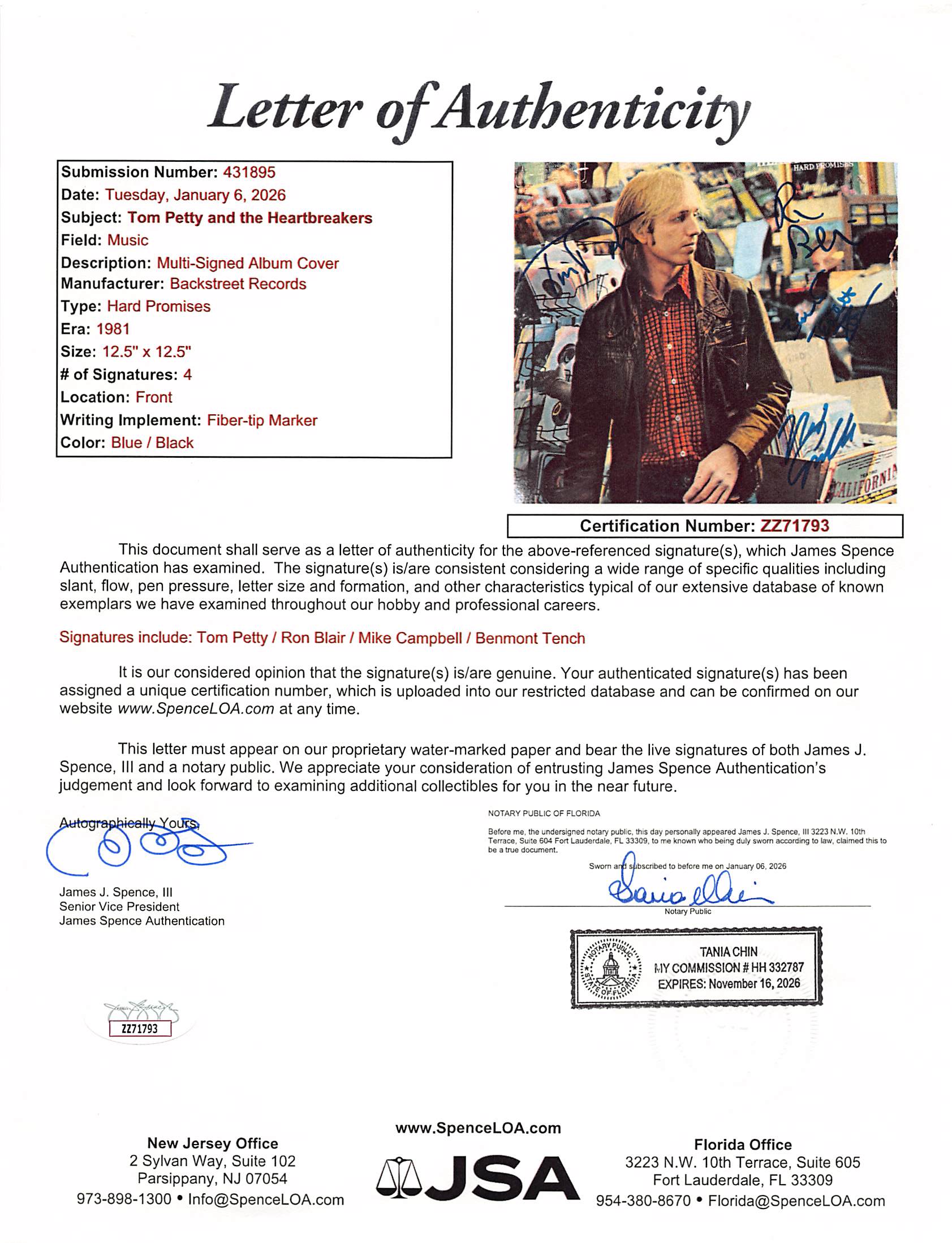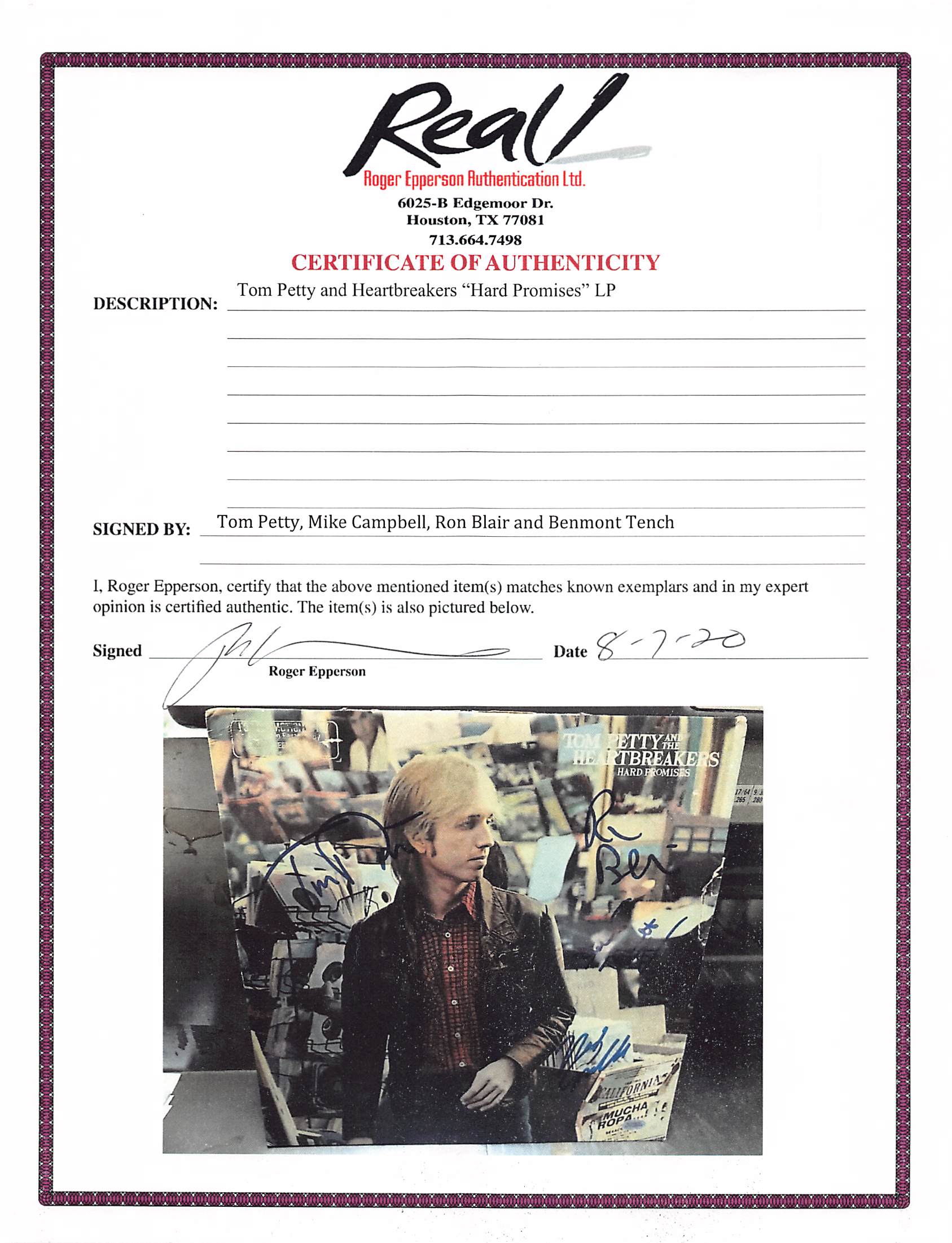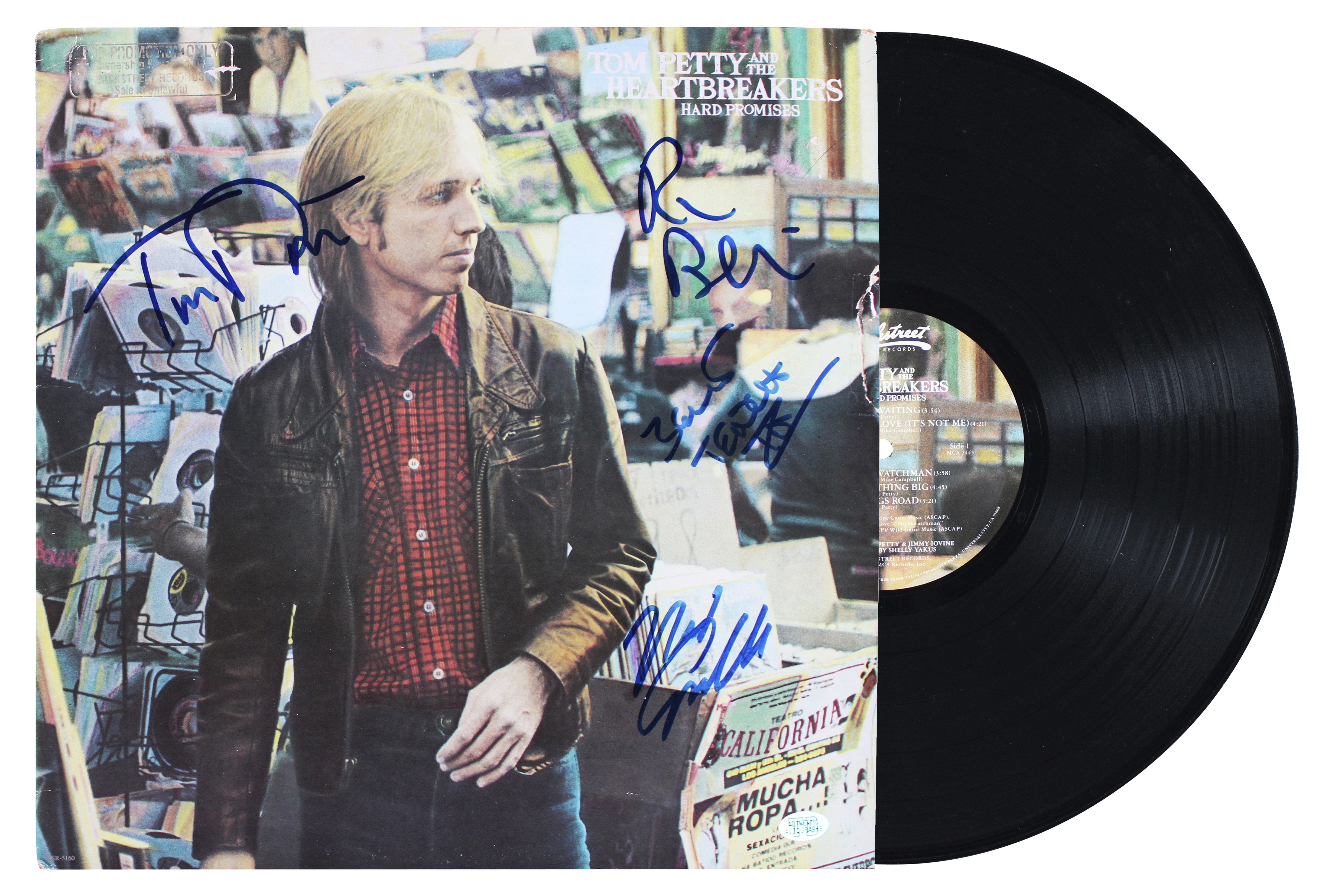 This Autographed Hard Promises Album Cover W/ Vinyl has been Personally Signed by Tom Petty, Ron Blair, Mike Campbell & Benmont Tench of Tom Petty and the Heartbreakers. This item is 100% Authentic to include a Certificate of Authenticity (COA) / hologram by JSA. The authenticity can be verified on JSA website.