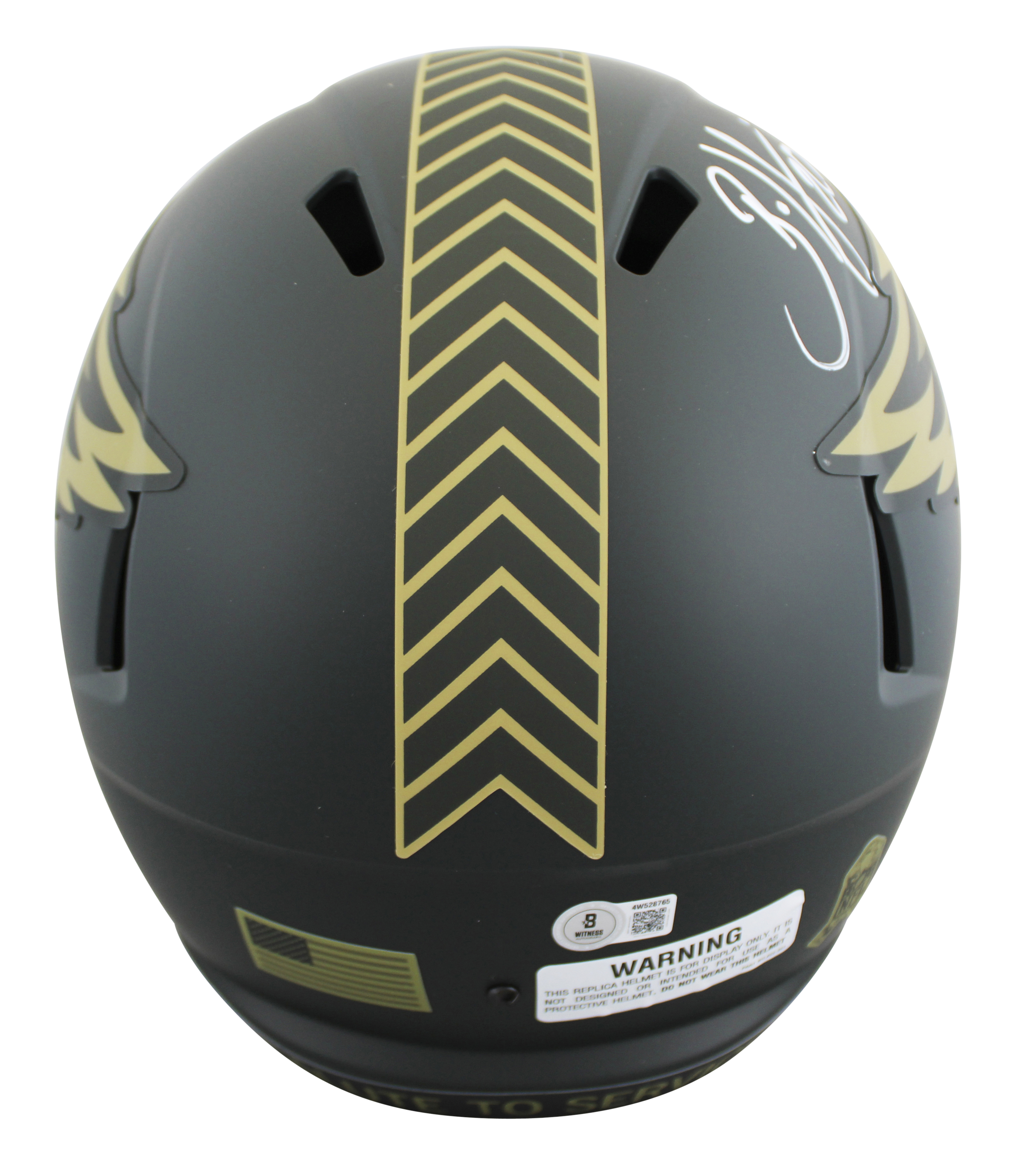 This Autographed Alternate 2025 Salute To Service IV Riddell Full Size Speed Rep Helmet W/ Uv Mirrored Back Acrylic Display Case has been Personally Signed by Brian Dawkins of the Philadelphia Eagles. This item is 100% Authentic to include a hologram by Beckett Authentication Services. This item will come with an affixed Beckett Authentication Services (BAS) authentication sticker, which includes a scannable QR code to verify authenticity. Please note that Beckett no longer provides serial-numbered COA cards, and the attached BAS sticker will serve as the complete authentication for this item. This is a BAS Witnessed Protection Program item which means a Beckett Authentication Service representative was present when this item was being signed. We conducted an autograph signing with Brian Dawkins where multiples of the same item were signed. While the photographs are representative of this item, the size, placement and strength of the signature may vary. Each item is hand signed, therefore, each autograph is unique. This item can be verified through BAS Witnessed.