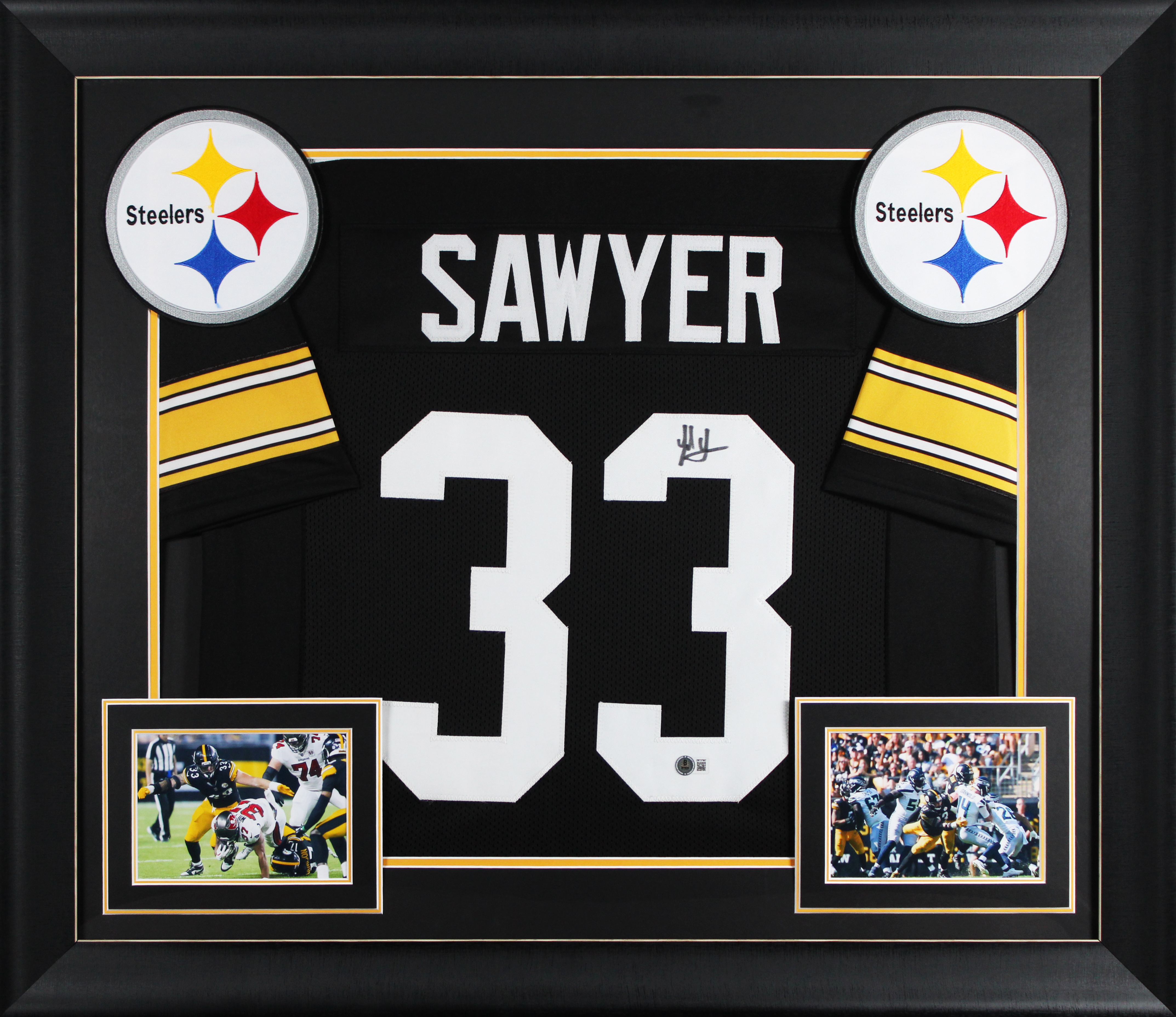 This Autographed Black Throwback Pro Style Framed Jersey has been Personally Signed by Jack Sawyer of the Pittsburgh Steelers. This item is 100% Authentic to include a hologram by Beckett Authentication Services. This item will come with an affixed Beckett Authentication Services (BAS) authentication sticker, which includes a scannable QR code to verify authenticity. Please note that Beckett no longer provides serial-numbered COA cards, and the attached BAS sticker will serve as the complete authentication for this item. This is a BAS Witnessed Protection Program item which means a Beckett Authentication Service representative was present when this item was being signed. We conducted an autograph signing with Jack Sawyer where multiples of the same item were signed. While the photographs are representative of this item, the size, placement and strength of the signature may vary. Each item is hand signed, therefore, each autograph is unique. This item can be verified through BAS Witnessed. This item has been professionally framed to overall dimensions of approximately 32 x 37 inches. This is a X-Large sized, non-branded, custom-stitched Framed Jersey. This jersey will be framed to order, it will take approximately 4-5 business days from purchase date for it to ship.