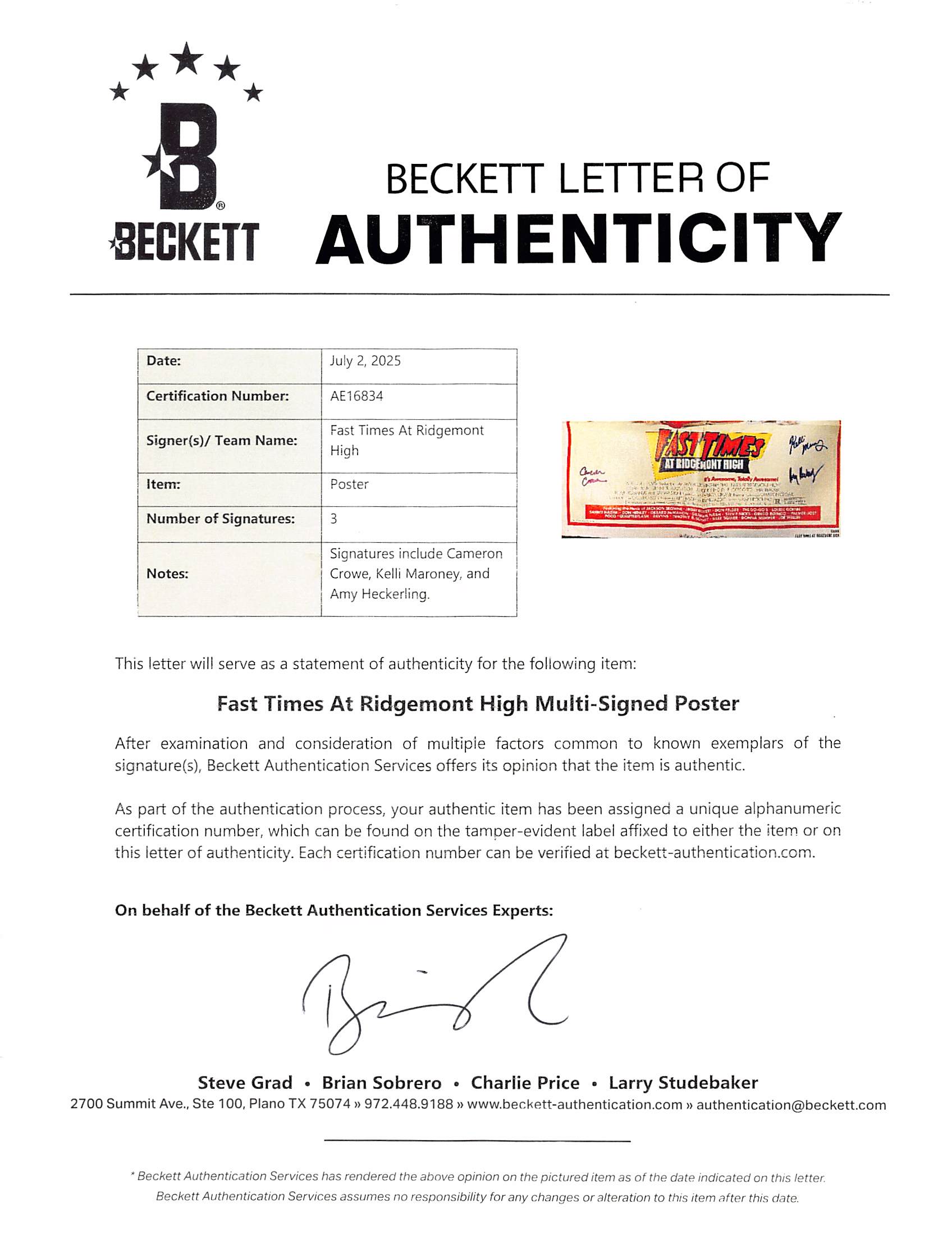 This Autographed & Framed 27x41 Vintage Movie Poster has been Personally Signed by Amy Heckerling, Kellie Maroney & Cameron Crowe of Fast Times At Ridgemont High. This item is 100% Authentic to include a Certificate of Authenticity (COA) / hologram by Beckett Authentication Services. The authenticity can be verified on Beckett Authentication Services website. This item has been professionally framed to overall dimensions of approximately 36.5 x 51.5 inches.