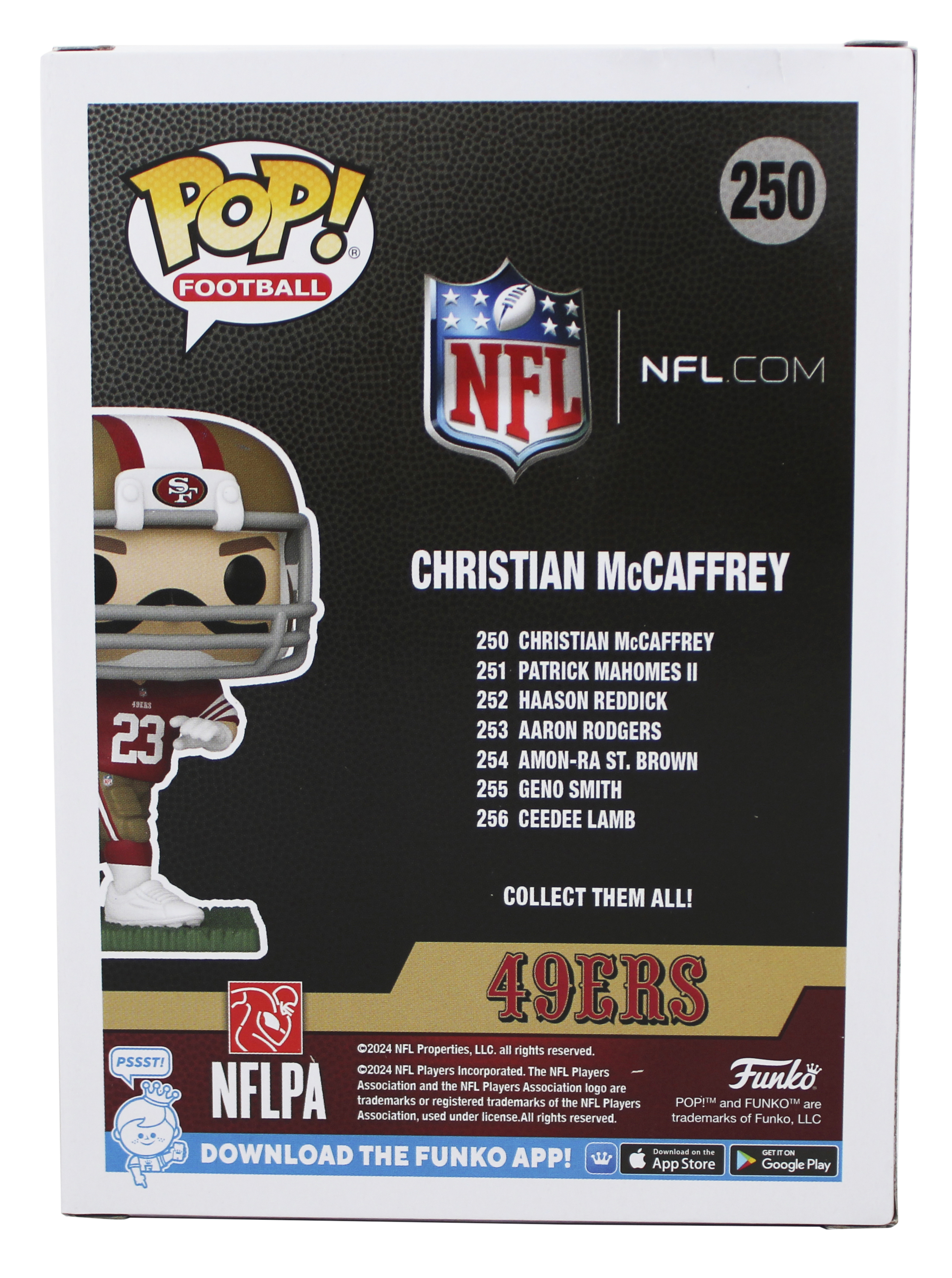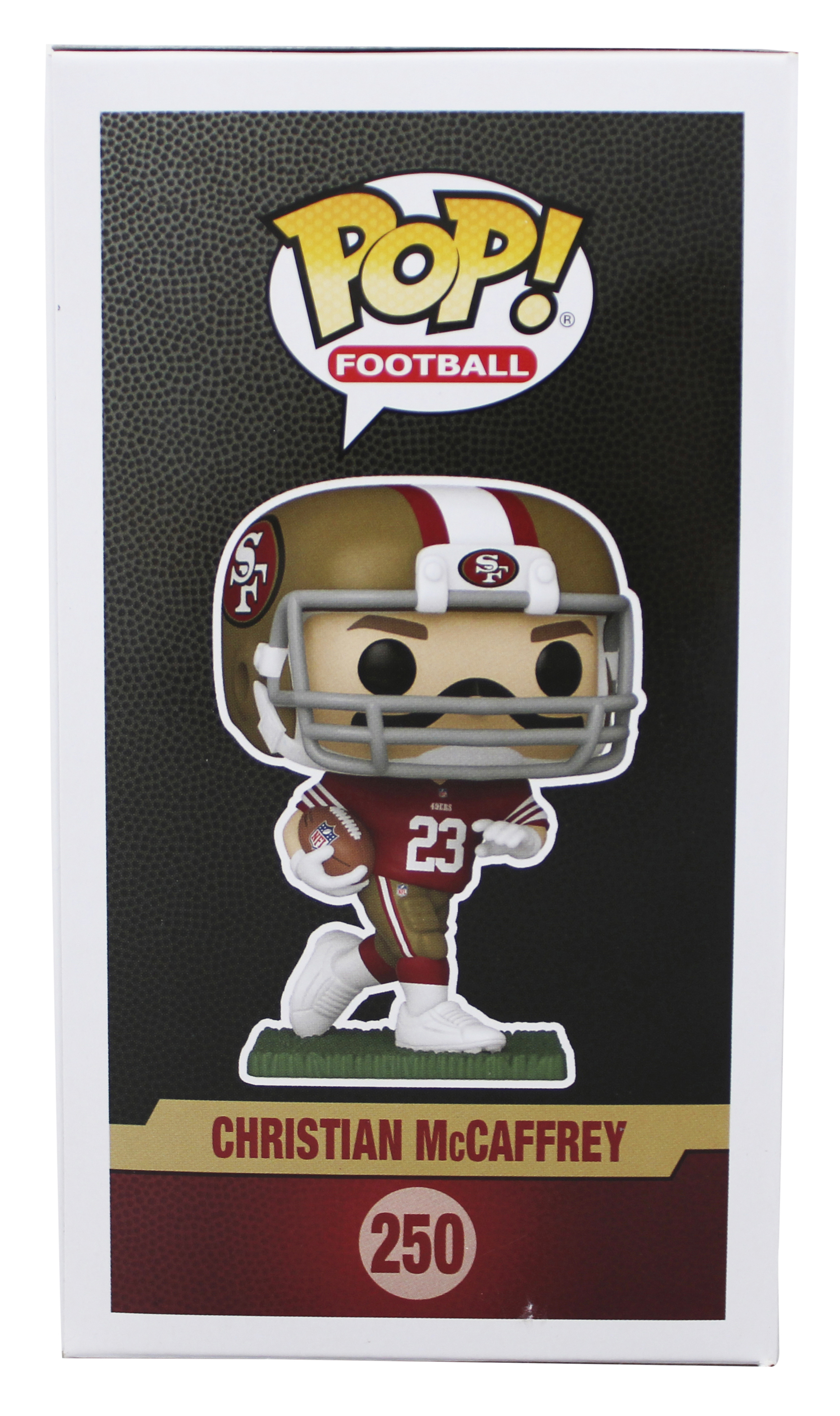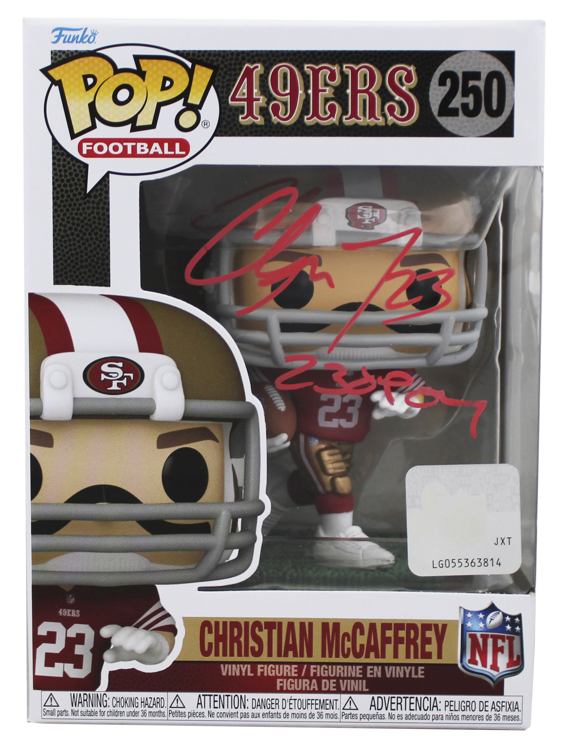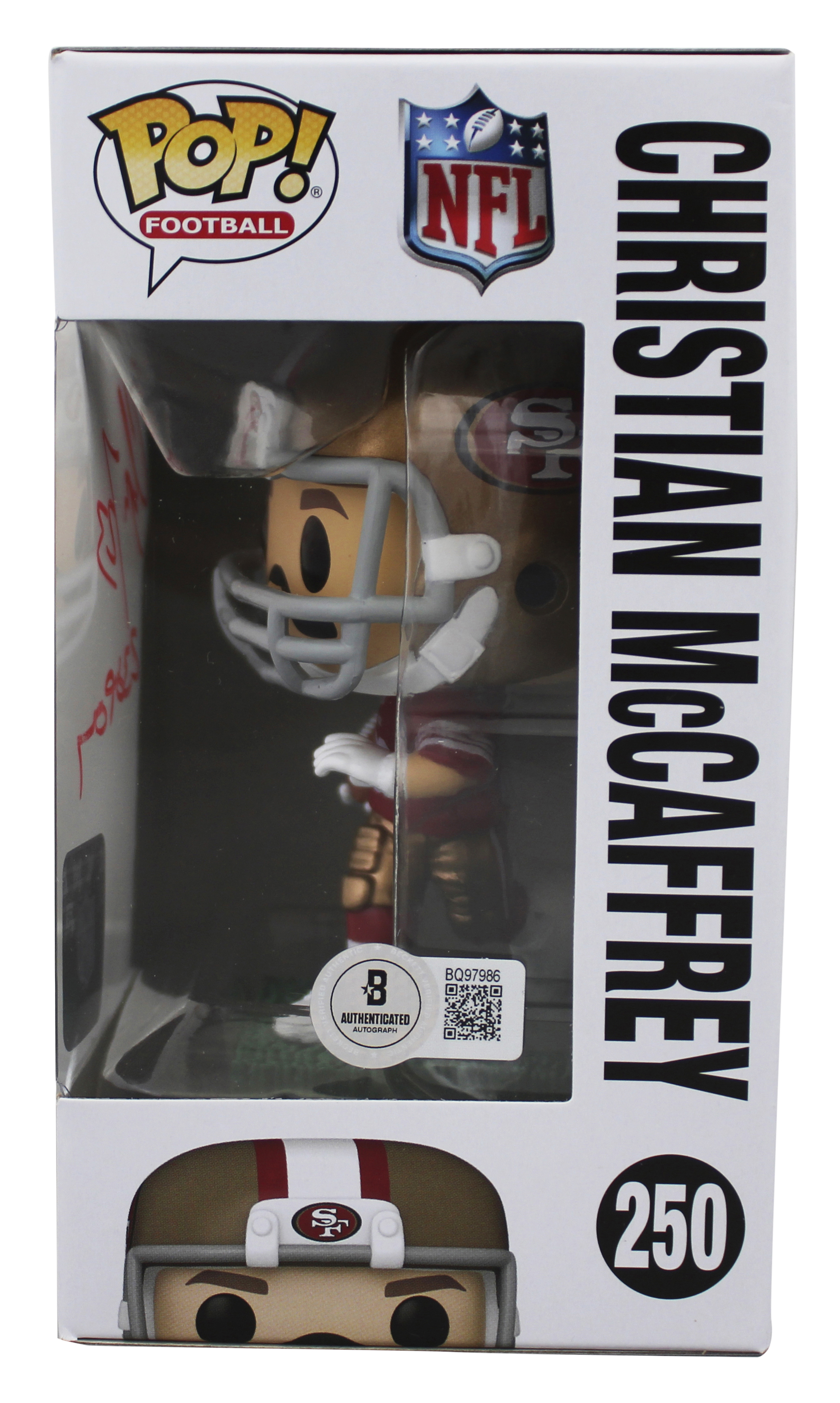 This Autographed Christian McCaffrey #250 Funko Pop Vinyl Figure with the inscription of "23 OPOY" has been Personally Signed by Christian McCaffrey of the San Francisco 49ers. This item is 100% Authentic to include a hologram by Beckett Authentication Services. This item will come with an affixed Beckett Authentication Services (BAS) authentication sticker, which includes a scannable QR code to verify authenticity. Please note that Beckett no longer provides serial-numbered COA cards, and the attached BAS sticker will serve as the complete authentication for this item. The authenticity can be verified on Beckett Authentication Services website. This item will ship in a Pop! Protector, please refer to the photos for condition of the item prior to purchase, these are in good condition but would not be considered mint.