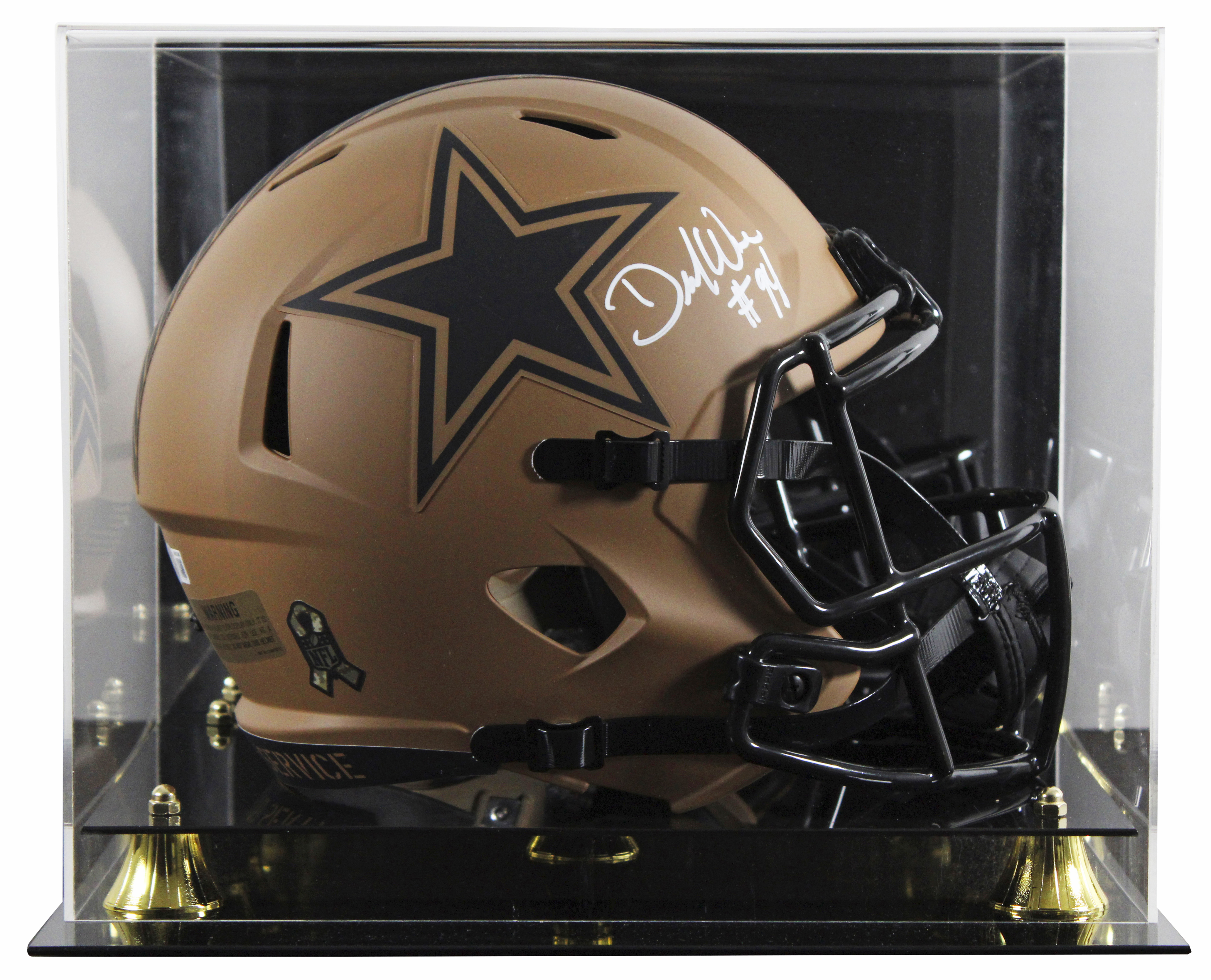 This Autographed Alternate 2023 Salute To Service II Riddell Full Size Speed Rep Helmet W/ Uv Mirrored Back Acrylic Display Case has been Personally Signed by DeMarcus Ware of the Dallas Cowboys. This item is 100% Authentic to include a hologram by Beckett Authentication Services. This item will come with an affixed Beckett Authentication Services (BAS) authentication sticker, which includes a scannable QR code to verify authenticity. Please note that Beckett no longer provides serial-numbered COA cards, and the attached BAS sticker will serve as the complete authentication for this item. This is a BAS Witnessed Protection Program item which means a Beckett Authentication Service representative was present when this item was being signed. We conducted an autograph signing with DeMarcus Ware where multiples of the same item were signed. While the photographs are representative of this item, the size, placement and strength of the signature may vary. Each item is hand signed, therefore, each autograph is unique. This item can be verified through BAS Witnessed.