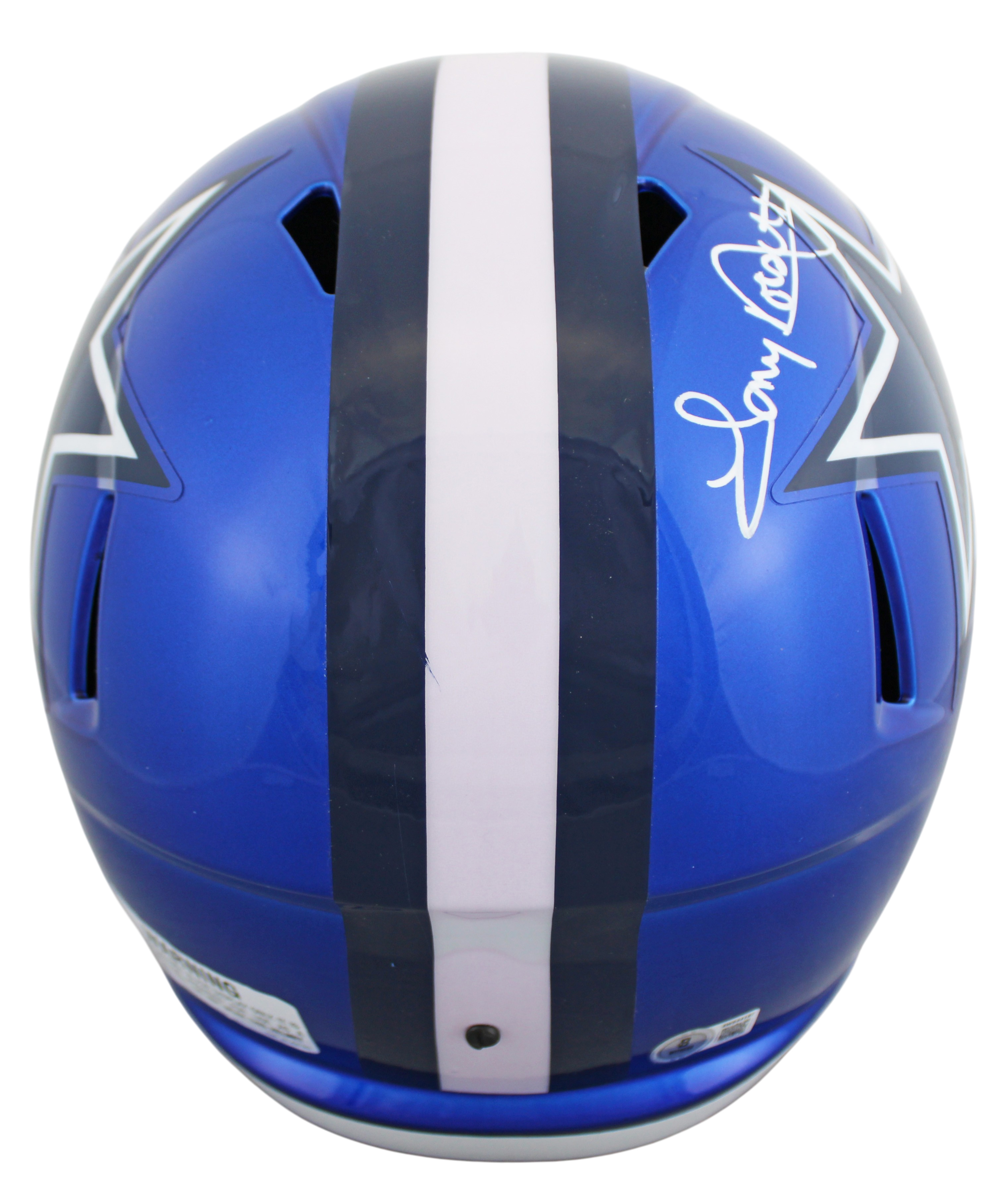 This Autographed Alternate Flash Riddell Full Size Speed Rep Helmet has been Personally Signed by Tony Dorsett of the Dallas Cowboys. This item is 100% Authentic to include a hologram by Beckett Authentication Services. This item will come with an affixed Beckett Authentication Services (BAS) authentication sticker, which includes a scannable QR code to verify authenticity. Please note that Beckett no longer provides serial-numbered COA cards, and the attached BAS sticker will serve as the complete authentication for this item. This is a BAS Witnessed Protection Program item which means a Beckett Authentication Service representative was present when this item was being signed. We conducted an autograph signing with Tony Dorsett where multiples of the same item were signed. While the photographs are representative of this item, the size, placement and strength of the signature may vary. Each item is hand signed, therefore, each autograph is unique. This item can be verified through BAS Witnessed.
