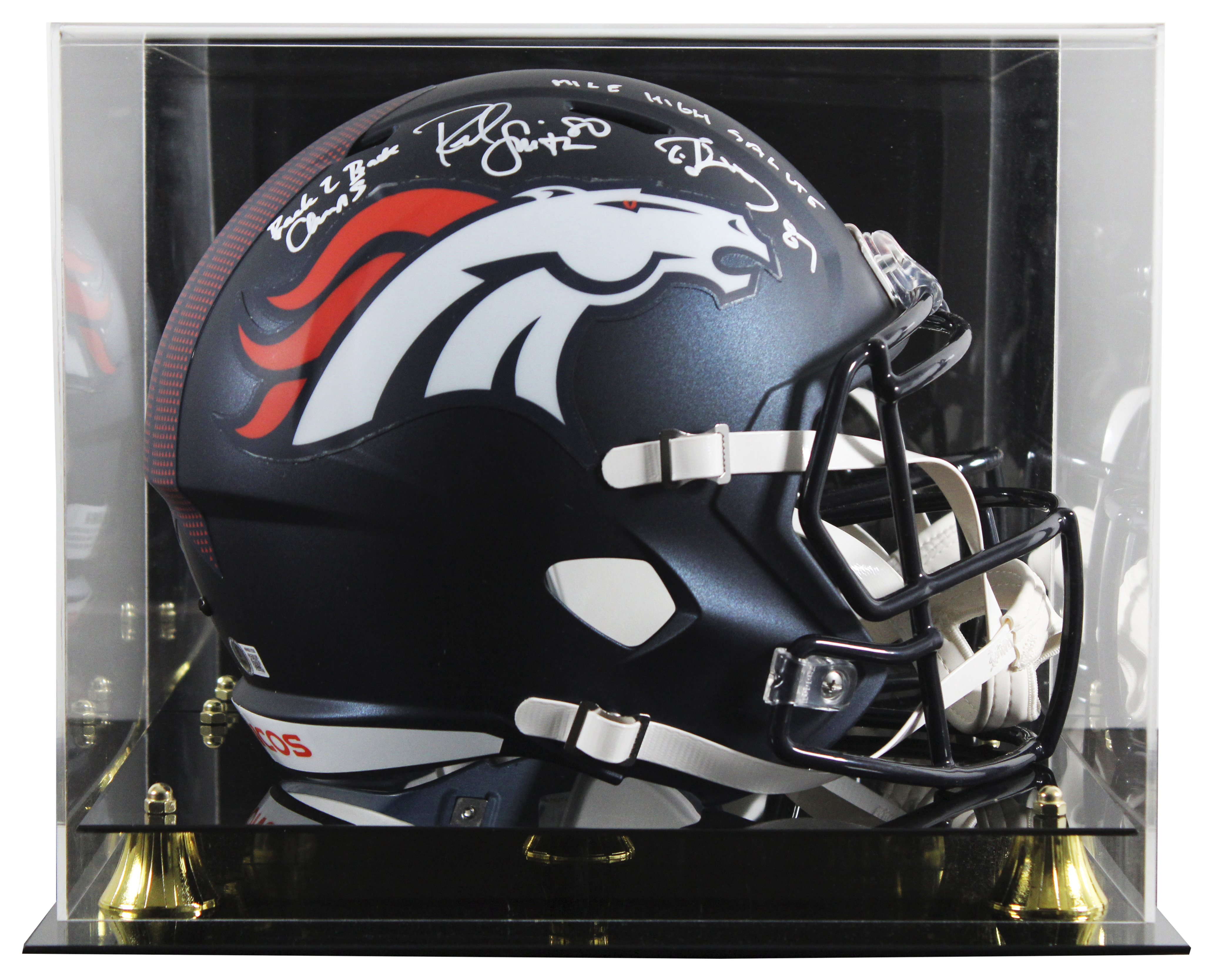 This Autographed Full Size Speed Rep Helmet W/ Uv Mirrored Back Acrylic Display Case with the inscription of "Mile High Salute (McCaffrey) & Back 2 Back Champs (Smith)" has been Personally Signed by Rod Smith & Ed McCaffrey of the Denver Broncos. This item is 100% Authentic to include a hologram by Beckett Authentication Services. This item will come with an affixed Beckett Authentication Services (BAS) authentication sticker, which includes a scannable QR code to verify authenticity. Please note that Beckett no longer provides serial-numbered COA cards, and the attached BAS sticker will serve as the complete authentication for this item. This is a BAS Witnessed Protection Program item which means a Beckett Authentication Service representative was present when this item was being signed. We conducted an autograph signing with Rod Smith & Ed McCaffrey where multiples of the same item were signed. While the photographs are representative of this item, the size, placement and strength of the signature may vary. Each item is hand signed, therefore, each autograph is unique. This item can be verified through BAS Witnessed.