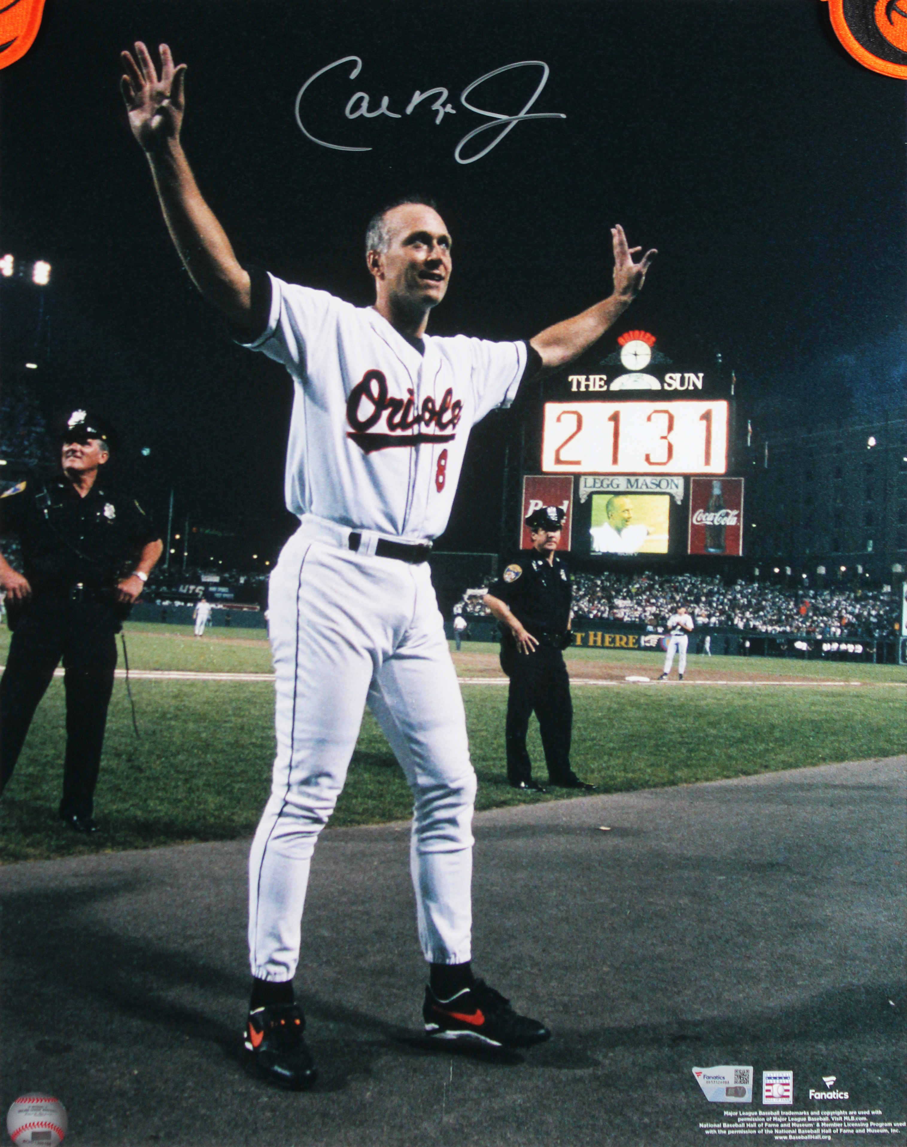 This Autographed Vertical 16x20 Framed Photo has been Personally Signed by Cal Ripken Jr. of the Baltimore Orioles. This item is 100% Authentic to includes a numbered hologram by Fanatics. We conducted an autograph signing with Cal Ripken Jr. where multiples of the same item were signed. While the photographs are representative of this item, the size, placement and strength of the signature may vary. Each item is hand signed, therefore, each autograph is unique. This item can be verified through Fanatics. This item has been professionally framed to overall dimensions of approximately 23.5 x 27.5 inches. This photo will be framed to order, it will take approximately 4-5 business days from purchase date for it to ship.