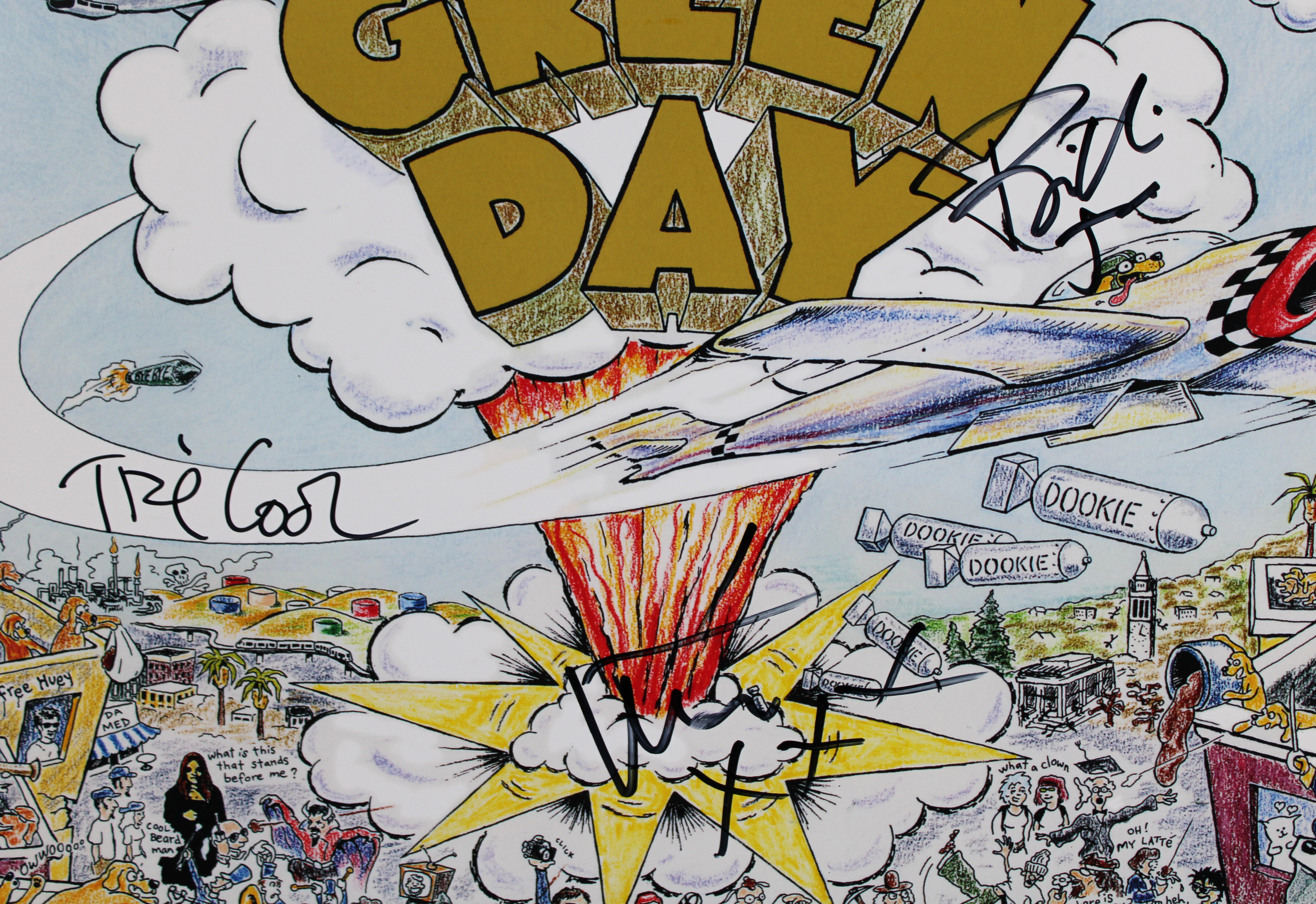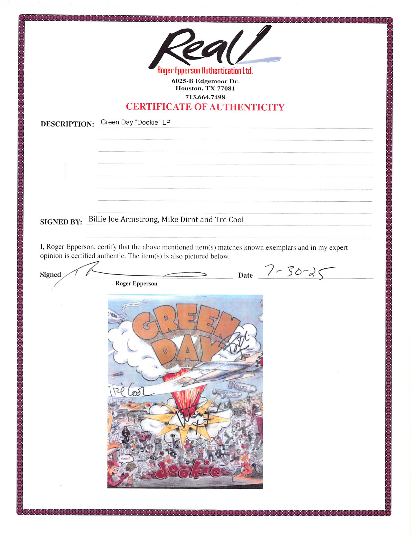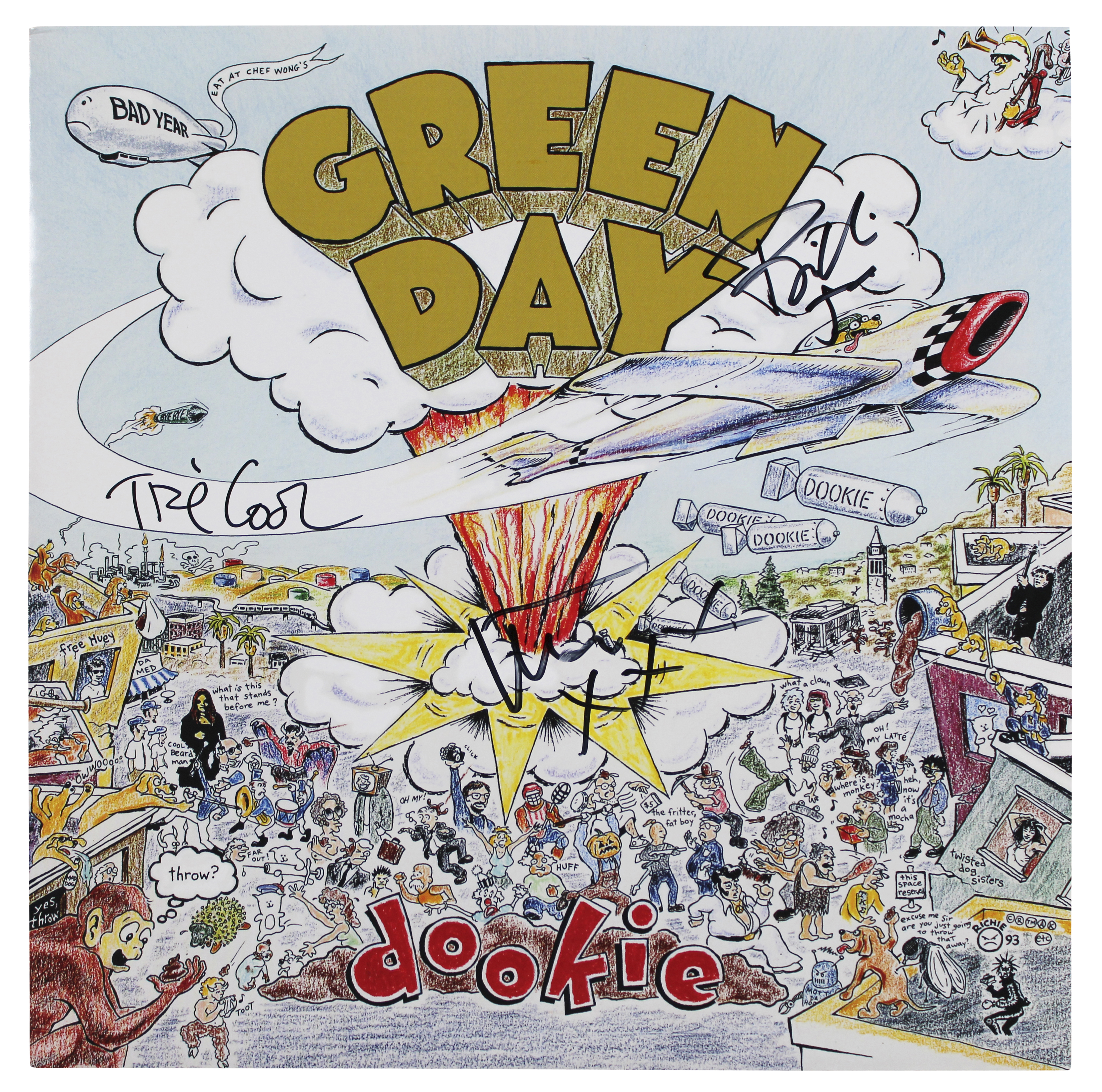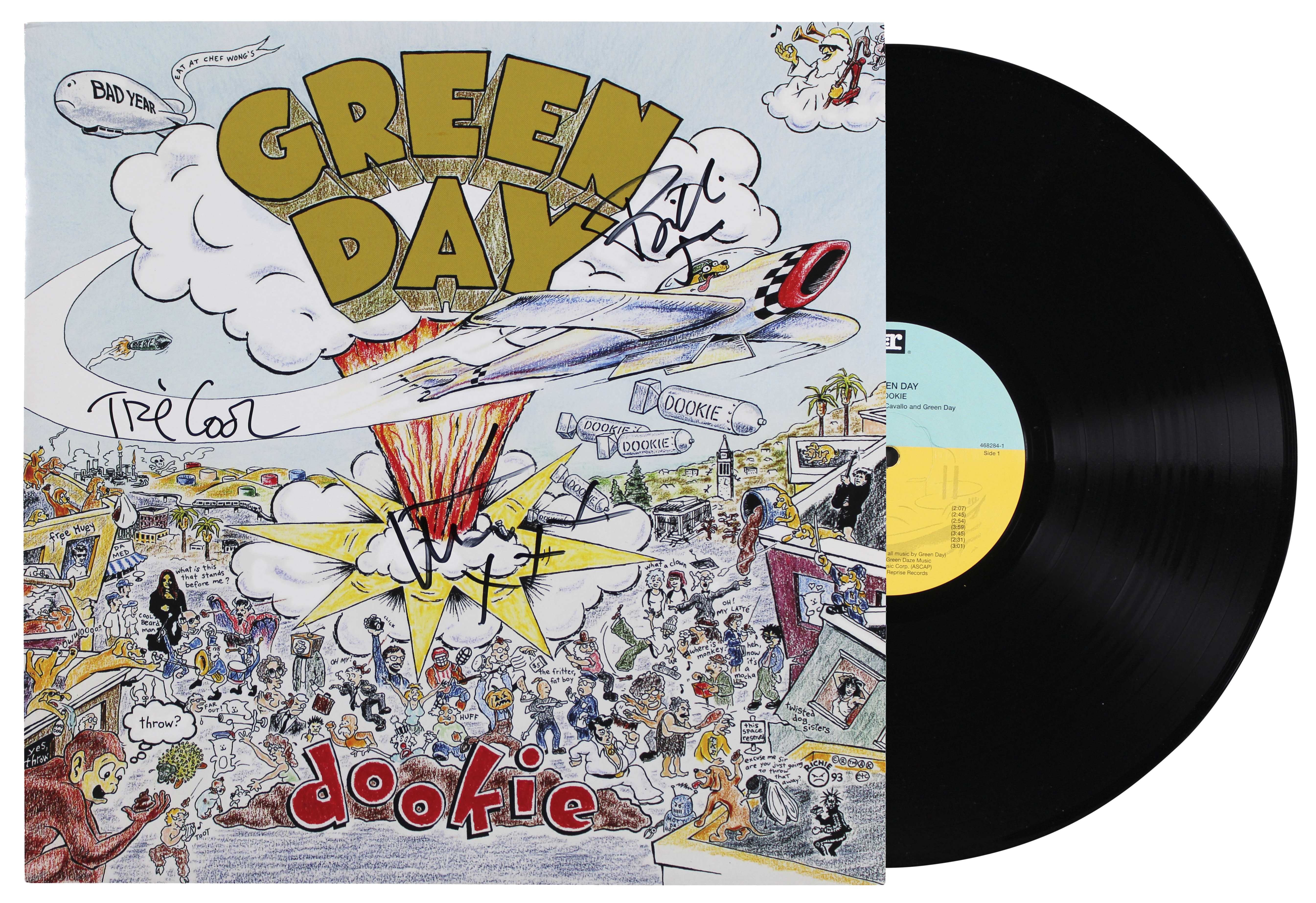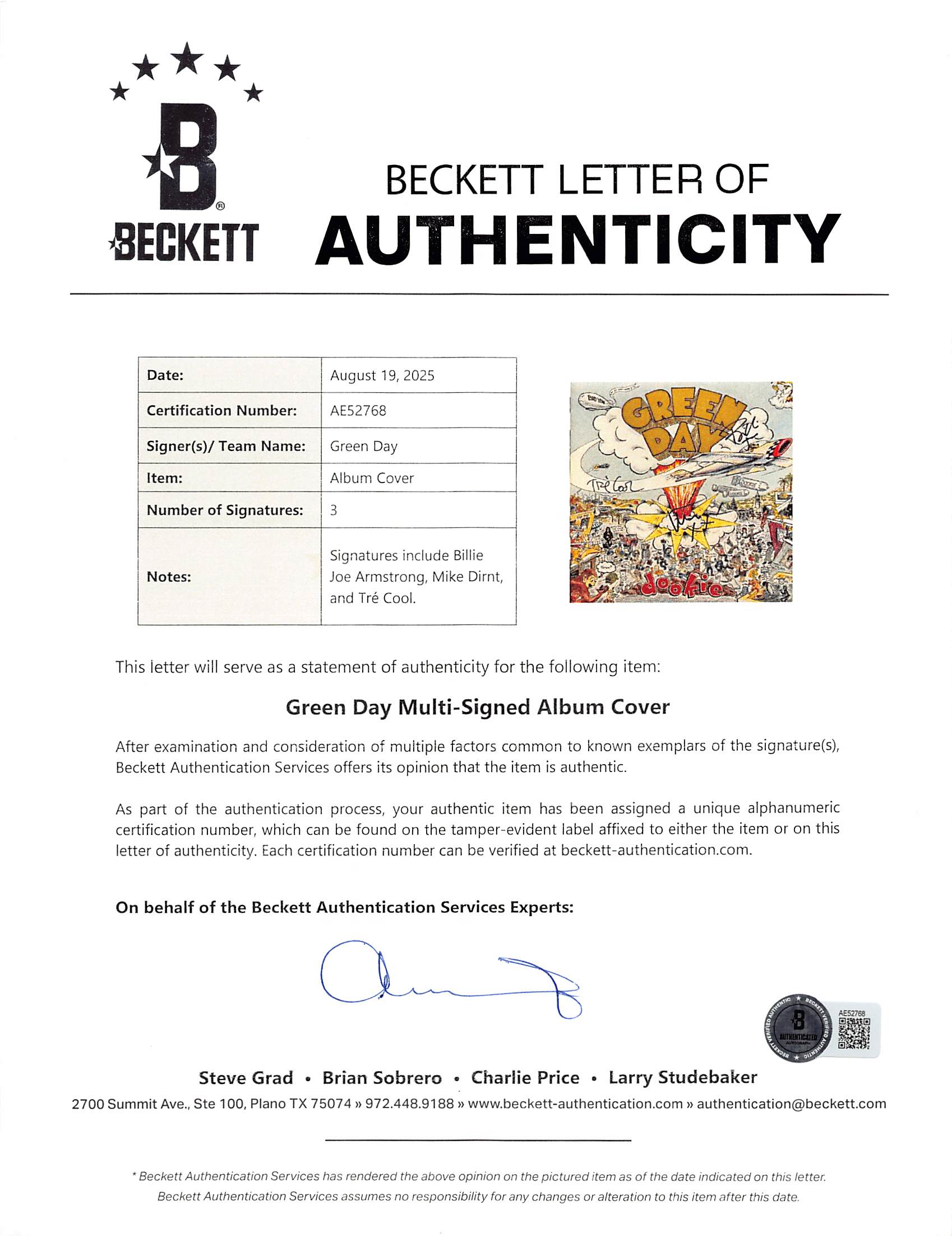 This Autographed Dookie Album Cover W/ Vinyl has been Personally Signed by Billie Joe Armstrong, Mike Dirnt & Tre Cool of Green Day. This item is 100% Authentic to include a Certificate of Authenticity (COA) / hologram by Beckett Authentication Services. The authenticity can be verified on Beckett Authentication Services website.