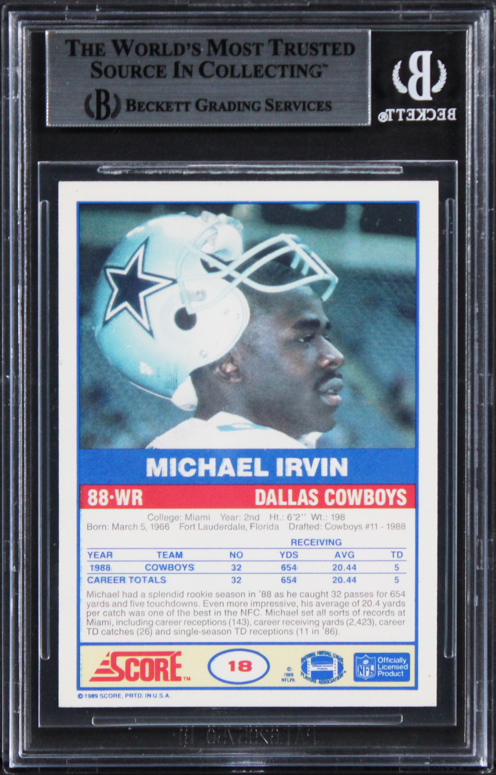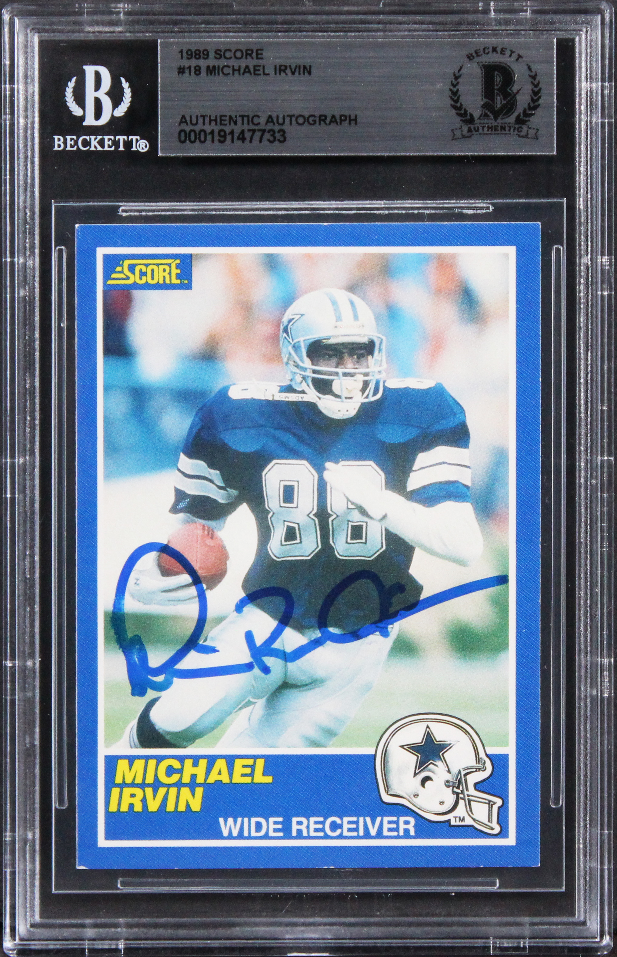 This Autographed 1989 Score #18 Card has been Personally Signed by Michael Irvin of the Dallas Cowboys. This item is 100% Authentic, it comes slabbed and authenticated by Beckett Authentication Services. The authenticity can be verified on Beckett Authentication Services website.