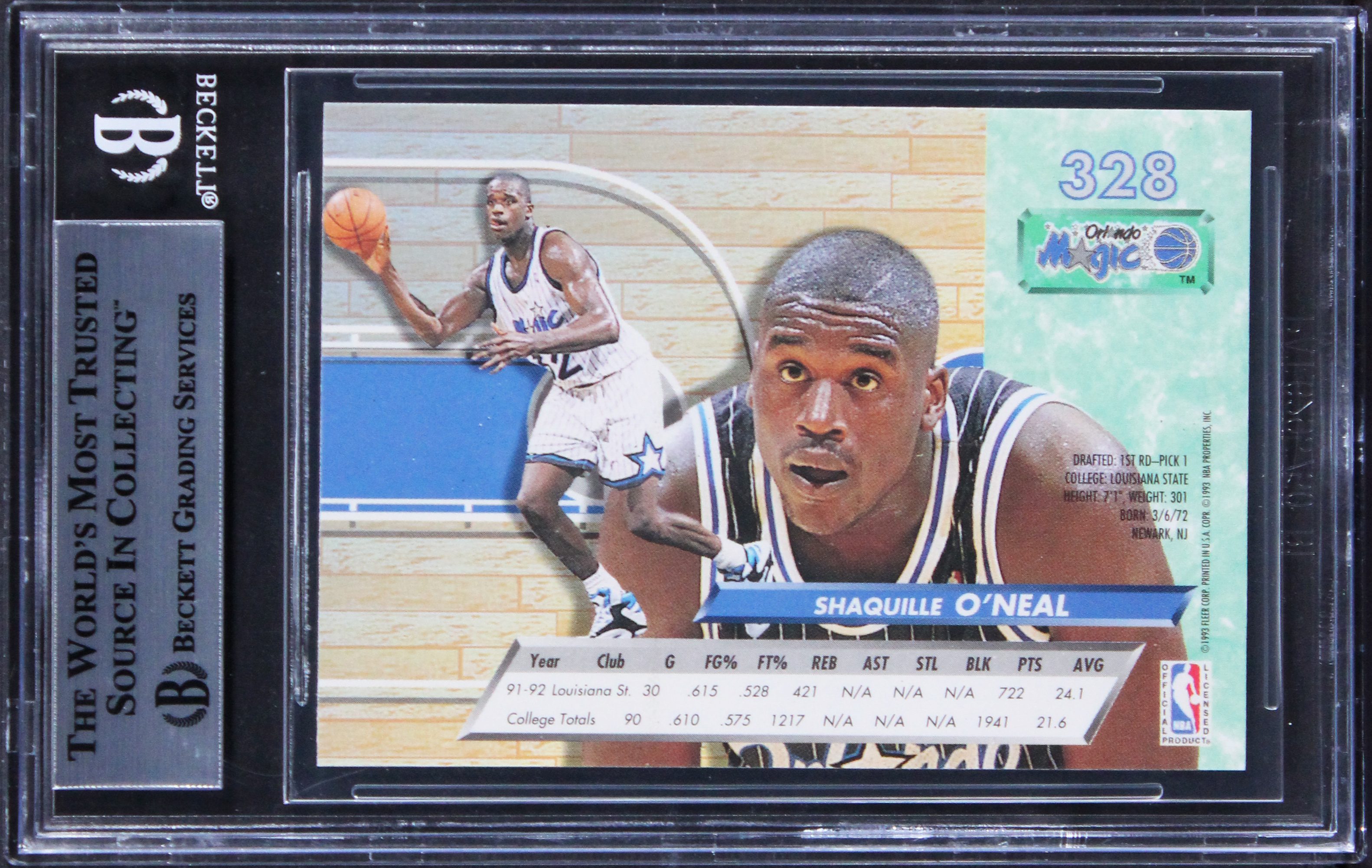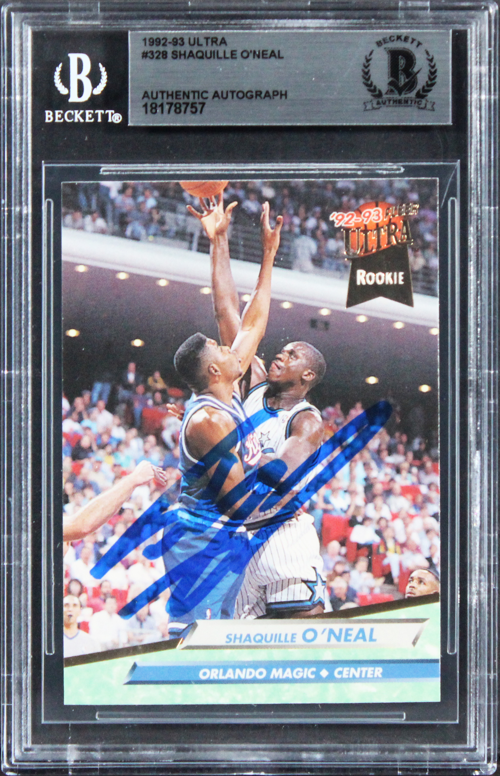 This Autographed 1992 Ultra #328 Rookie Card has been Personally Signed by Shaquille O'Neal of the Orlando Magic. This item is 100% Authentic, it comes slabbed and authenticated by Beckett Authentication Services. The authenticity can be verified on Beckett Authentication Services website.