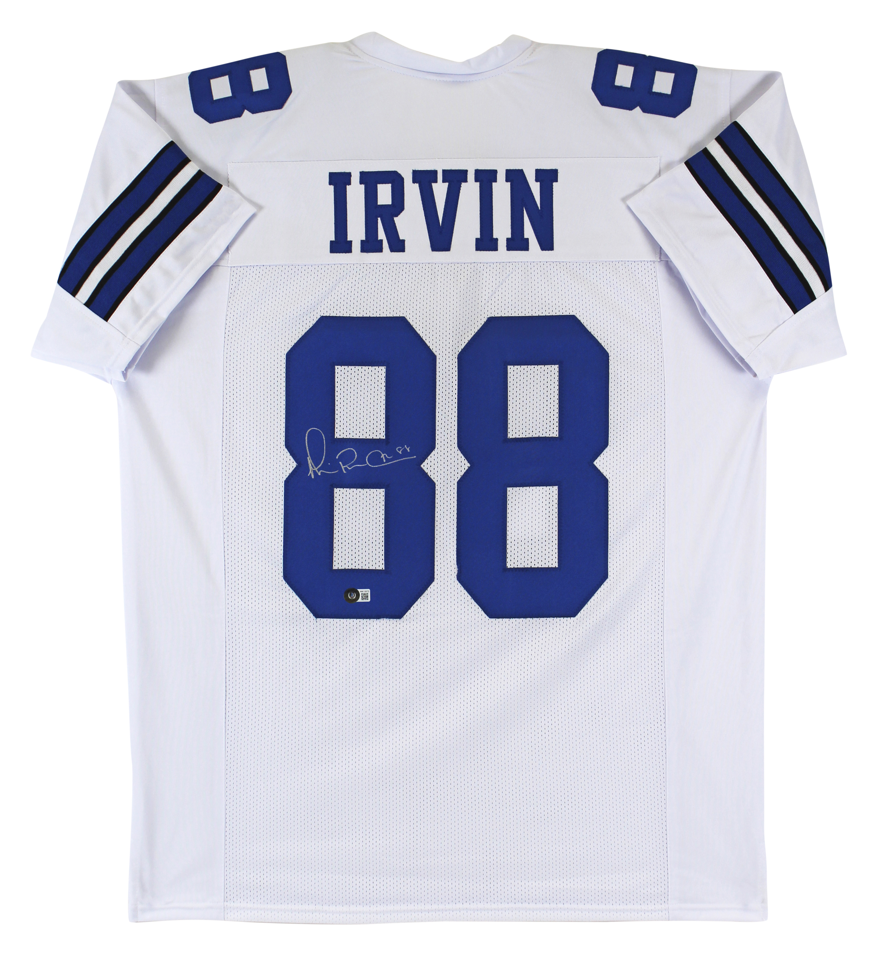 This Autographed White Pro Style Jersey has been Personally Signed by Michael Irvin of the Dallas Cowboys. This item is 100% Authentic to include a hologram by Beckett Authentication Services. This item will come with an affixed Beckett Authentication Services (BAS) authentication sticker, which includes a scannable QR code to verify authenticity. Please note that Beckett no longer provides serial-numbered COA cards, and the attached BAS sticker will serve as the complete authentication for this item. This is a BAS Witnessed Protection Program item which means a Beckett Authentication Service representative was present when this item was being signed. We conducted an autograph signing with Michael Irvin where multiples of the same item were signed. While the photographs are representative of this item, the size, placement and strength of the signature may vary. Each item is hand signed, therefore, each autograph is unique. This item can be verified through BAS Witnessed. This is a X-Large sized, non-branded, custom-stitched Jersey.