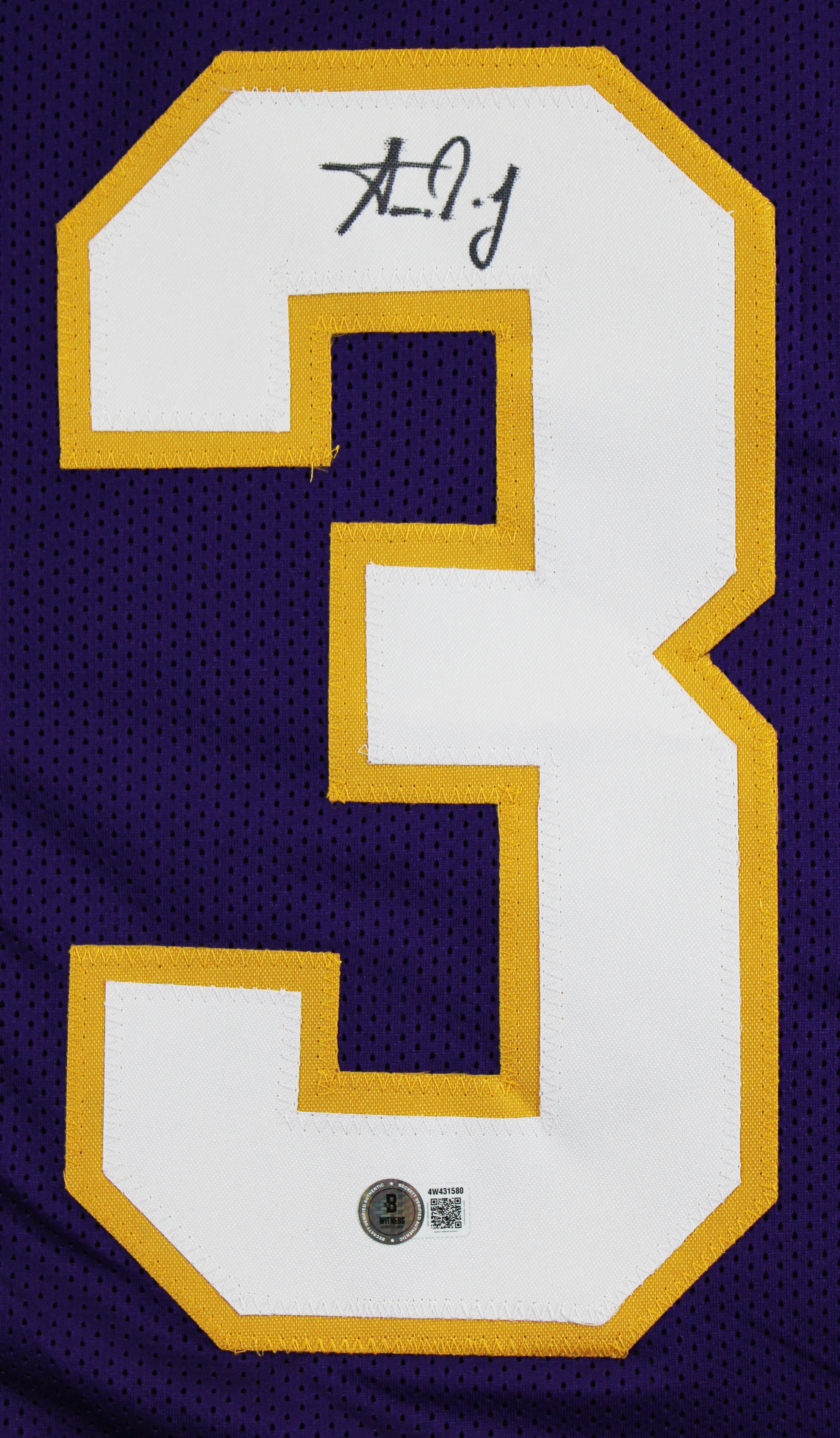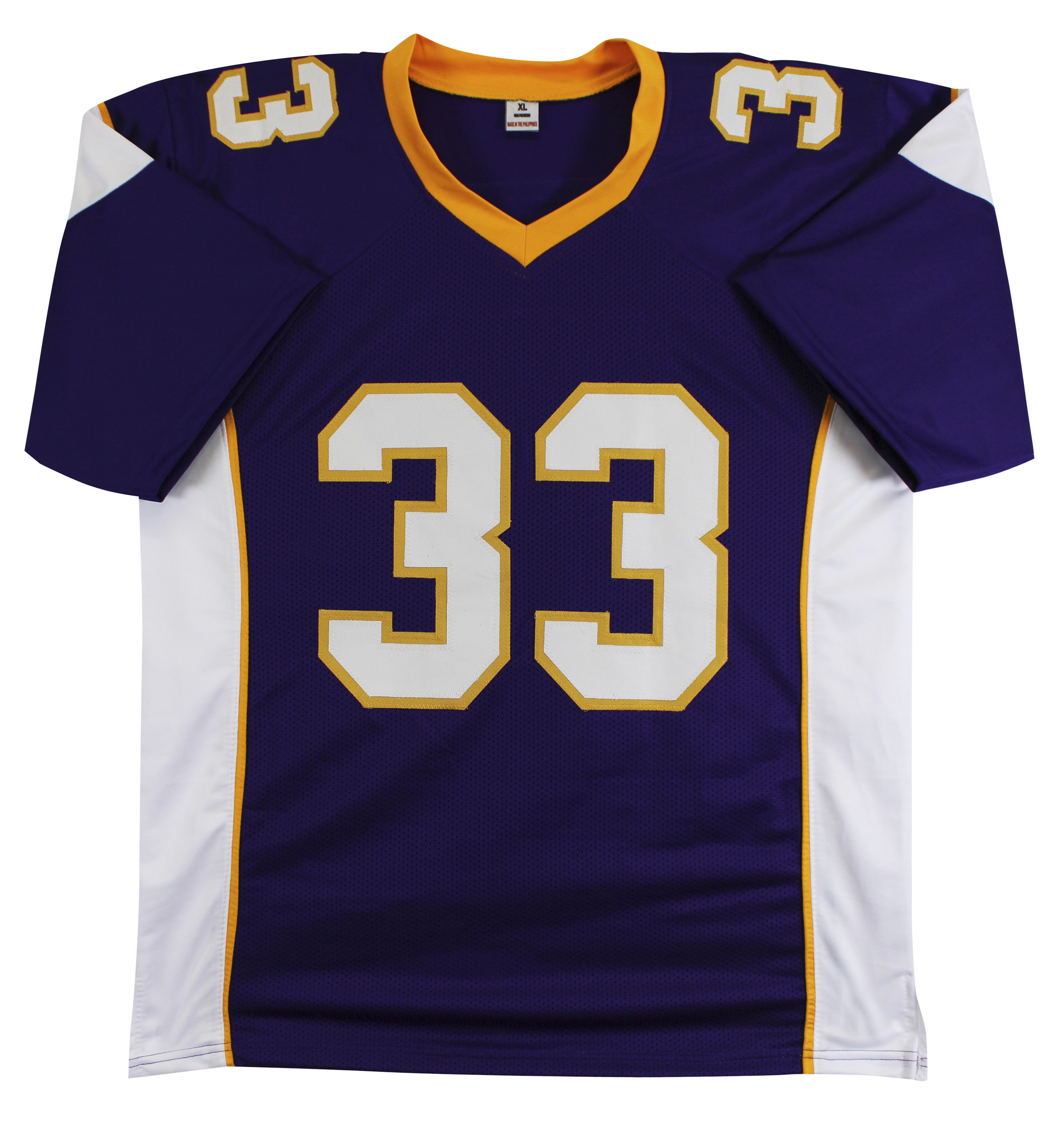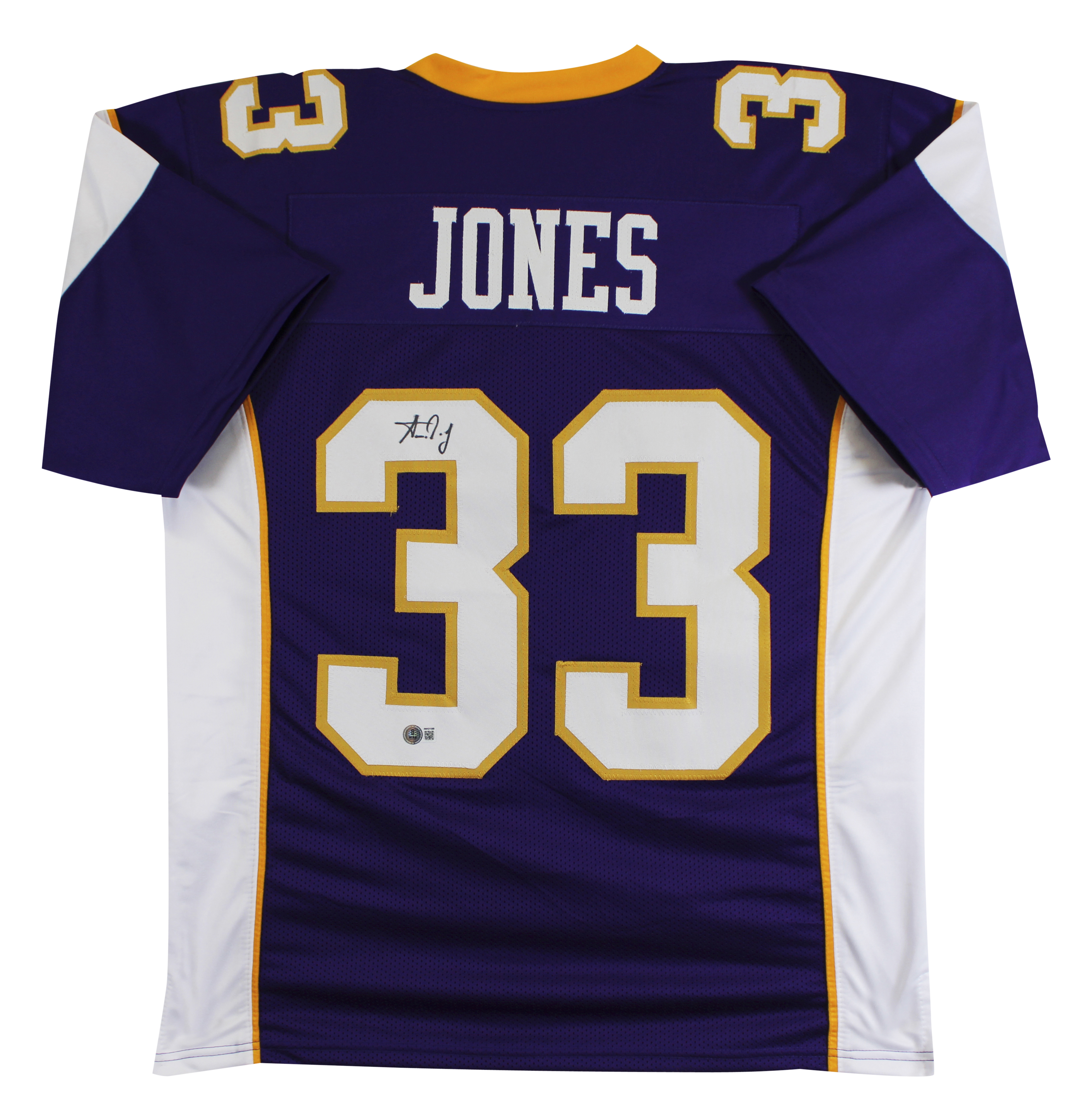 This Autographed Purple Throwback Pro Style Jersey has been Personally Signed by Aaron Jones of the Minnesota Vikings. This item is 100% Authentic to include a hologram by Beckett Authentication Services. This item will come with an affixed Beckett Authentication Services (BAS) authentication sticker, which includes a scannable QR code to verify authenticity. Please note that Beckett no longer provides serial-numbered COA cards, and the attached BAS sticker will serve as the complete authentication for this item. This is a BAS Witnessed Protection Program item which means a Beckett Authentication Service representative was present when this item was being signed. We conducted an autograph signing with Aaron Jones where multiples of the same item were signed. While the photographs are representative of this item, the size, placement and strength of the signature may vary. Each item is hand signed, therefore, each autograph is unique. This item can be verified through BAS Witnessed. This is a X-Large sized, non-branded, custom-stitched Jersey.