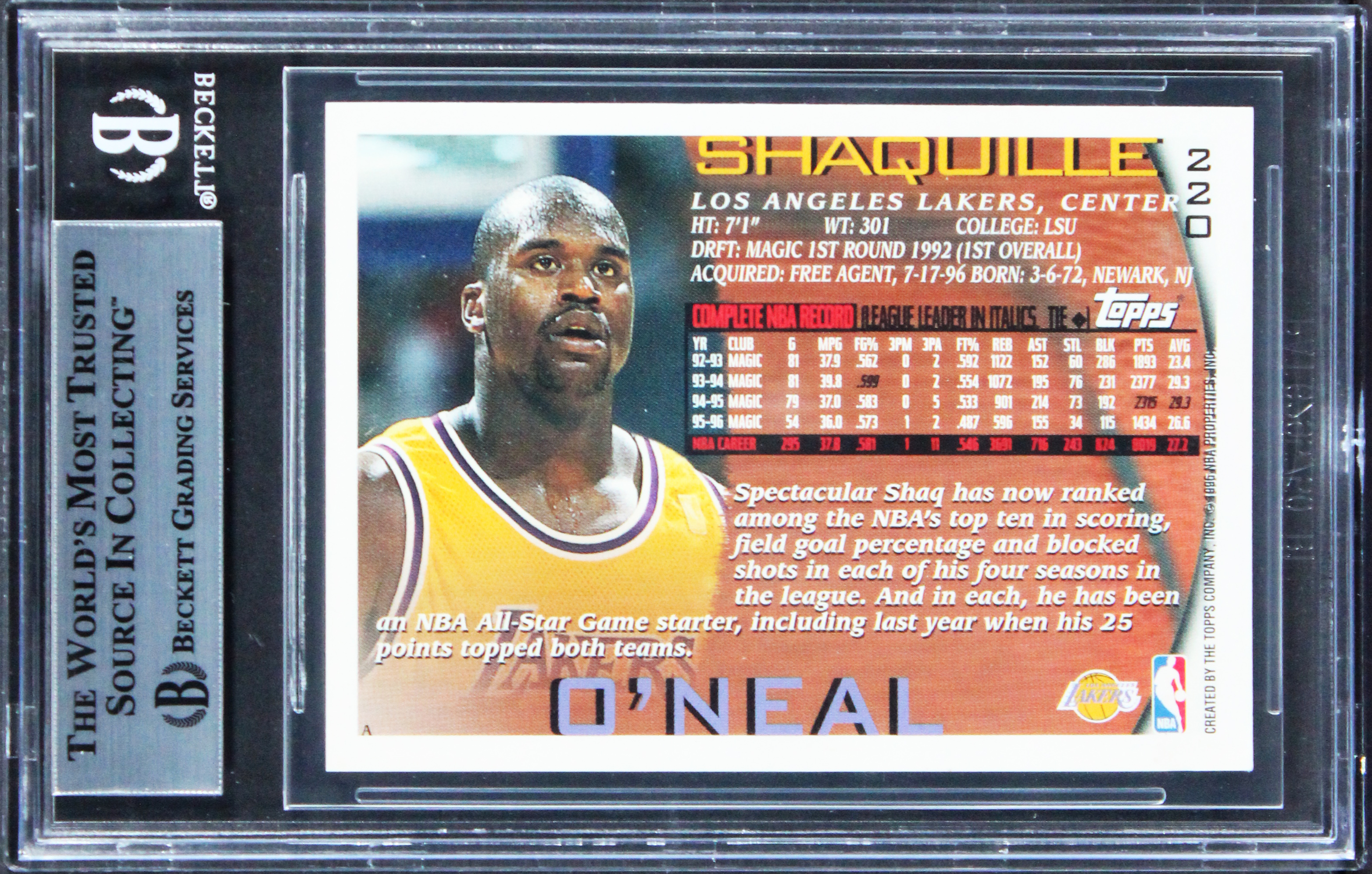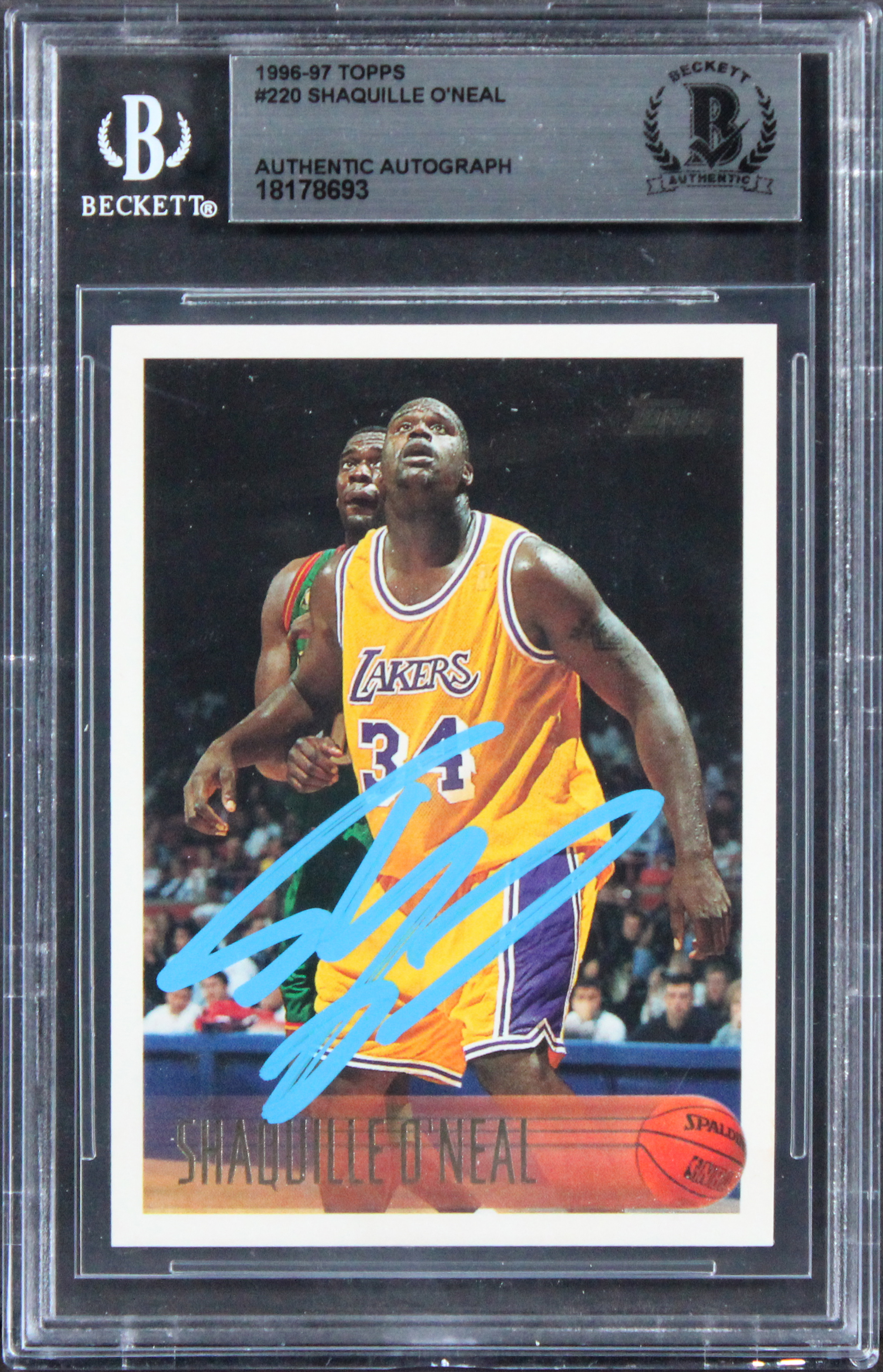 This Autographed 1996 Topps #220 Card has been Personally Signed by Shaquille O'Neal of the Los Angeles Lakers. This item is 100% Authentic, it comes slabbed and authenticated by Beckett Authentication Services. We have multiples of this same item. While the photographs are representative of this item, the size, placement and strength of the signature may vary. Each item is hand signed, therefore, each autograph is unique.