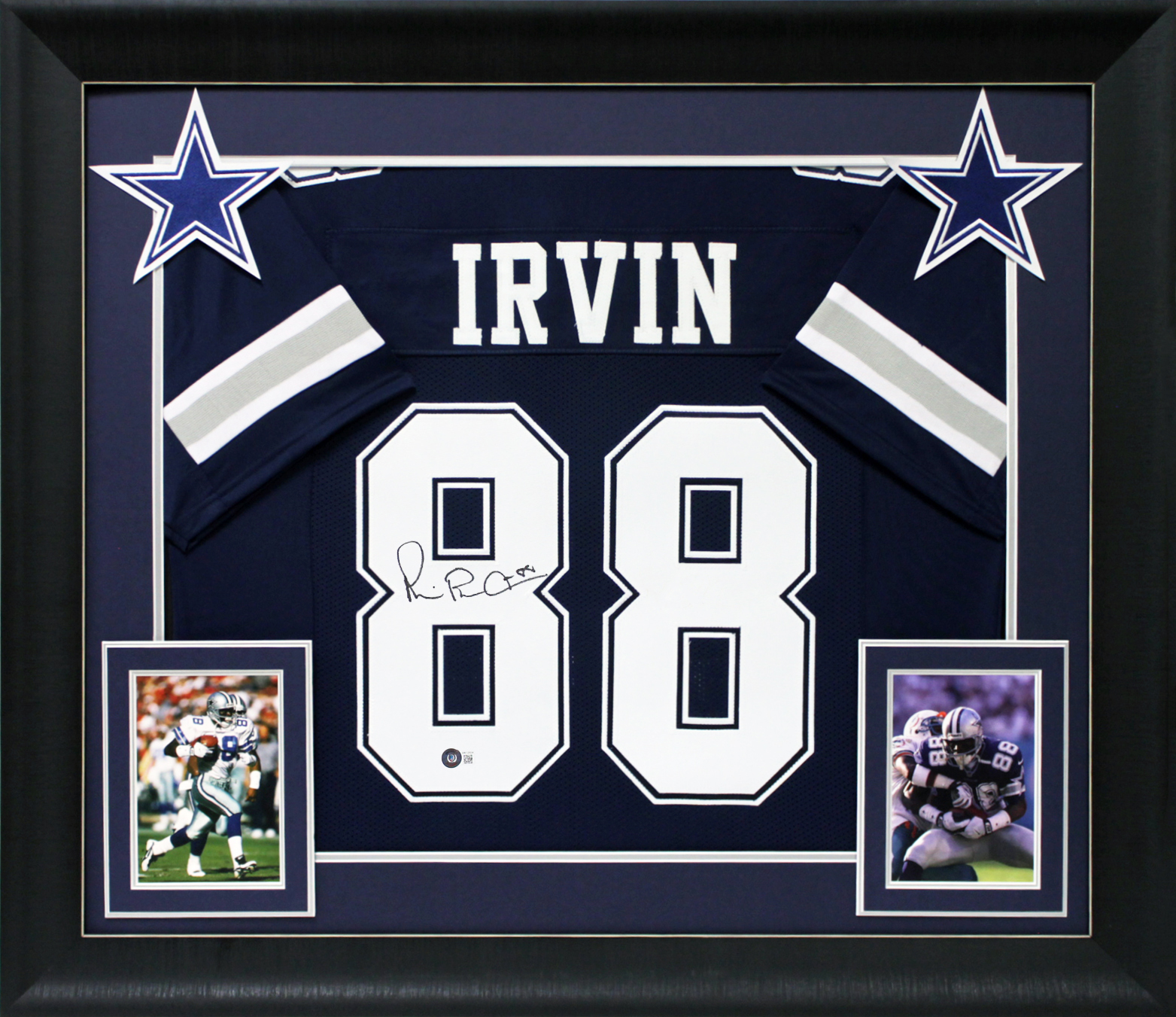 This Autographed Navy Blue Pro Style Framed Jersey has been Personally Signed by Michael Irvin of the Dallas Cowboys. This item is 100% Authentic to include a hologram by Beckett Authentication Services. This item will come with an affixed Beckett Authentication Services (BAS) authentication sticker, which includes a scannable QR code to verify authenticity. Please note that Beckett no longer provides serial-numbered COA cards, and the attached BAS sticker will serve as the complete authentication for this item. This is a BAS Witnessed Protection Program item which means a Beckett Authentication Service representative was present when this item was being signed. We conducted an autograph signing with Michael Irvin where multiples of the same item were signed. While the photographs are representative of this item, the size, placement and strength of the signature may vary. Each item is hand signed, therefore, each autograph is unique. This item can be verified through BAS Witnessed. This item has been professionally framed to overall dimensions of approximately 32 x 37 inches. This is a X-Large sized, non-branded, custom-stitched Framed Jersey. This jersey will be framed to order, it will take approximately 4-5 business days from purchase date for it to ship.