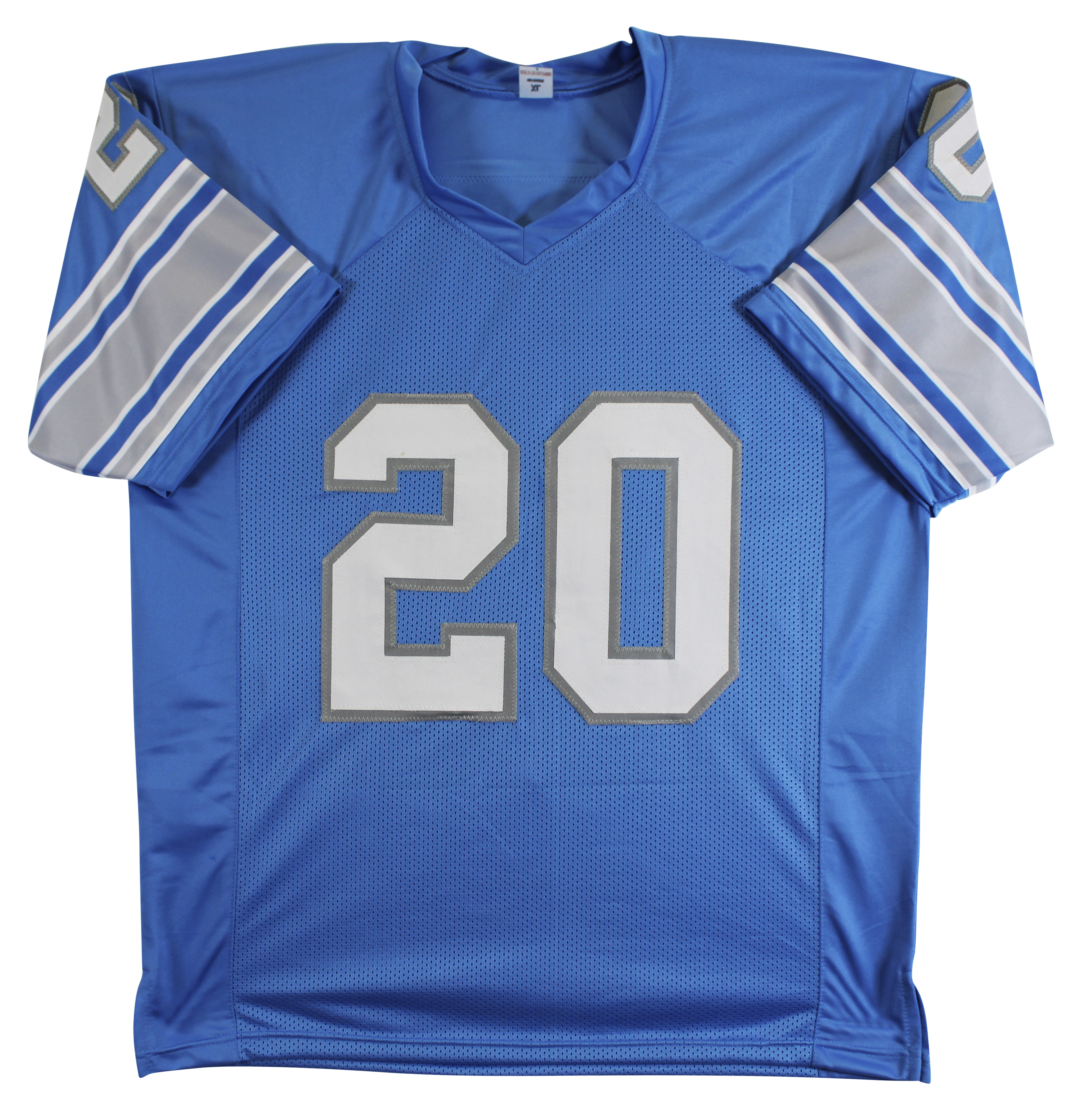 This Autographed Blue Pro Style Jersey with the inscription of "80 ROY" has been Personally Signed by Billy Sims of the Detroit Lions. This item is 100% Authentic to include a hologram by Beckett Authentication Services. This item will come with an affixed Beckett Authentication Services (BAS) authentication sticker, which includes a scannable QR code to verify authenticity. Please note that Beckett no longer provides serial-numbered COA cards, and the attached BAS sticker will serve as the complete authentication for this item. This is a BAS Witnessed Protection Program item which means a Beckett Authentication Service representative was present when this item was being signed. We conducted an autograph signing with Billy Sims where multiples of the same item were signed. While the photographs are representative of this item, the size, placement and strength of the signature may vary. Each item is hand signed, therefore, each autograph is unique. This item can be verified through BAS Witnessed. This is a X-Large sized, non-branded, custom-stitched Jersey.