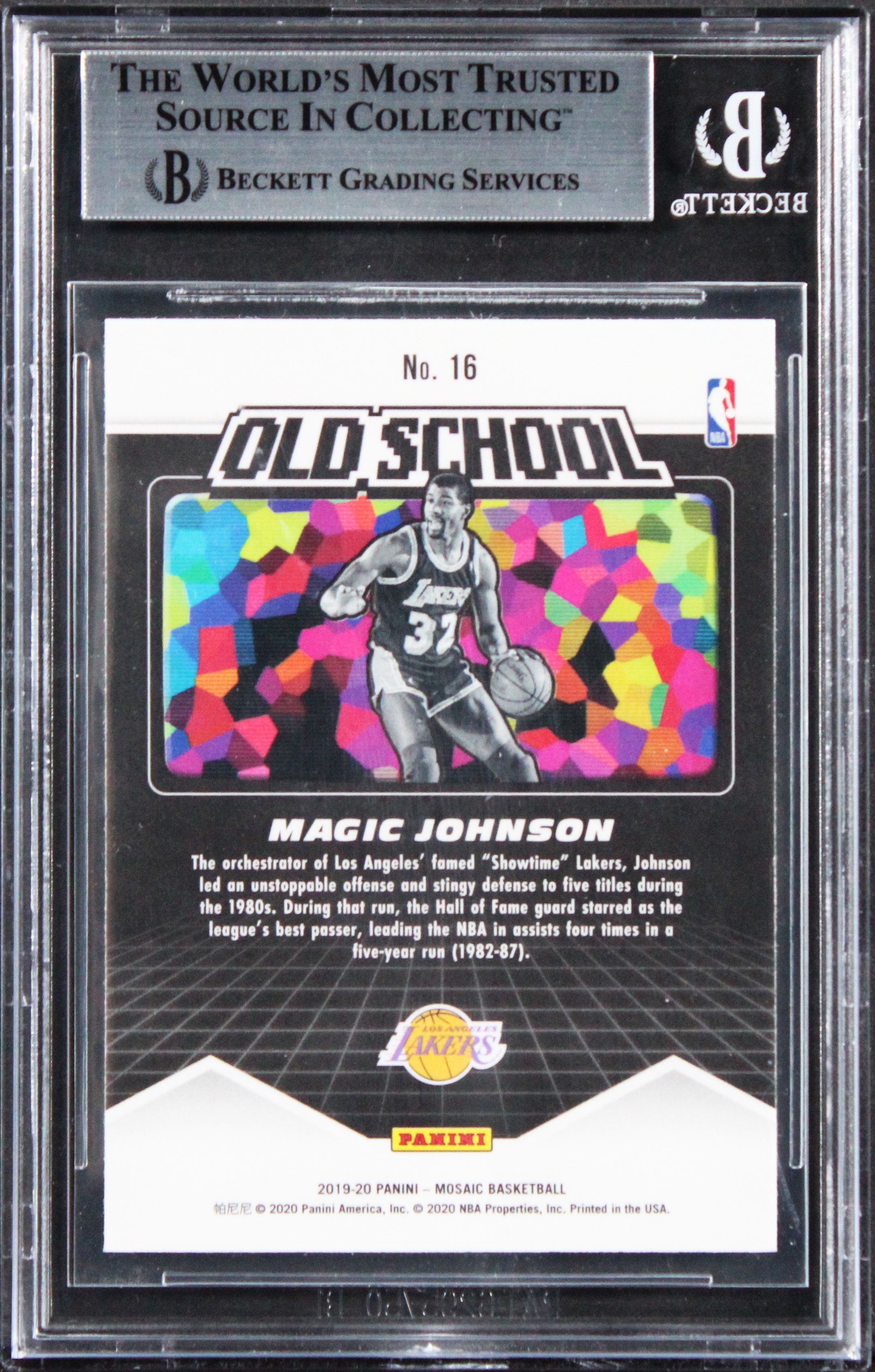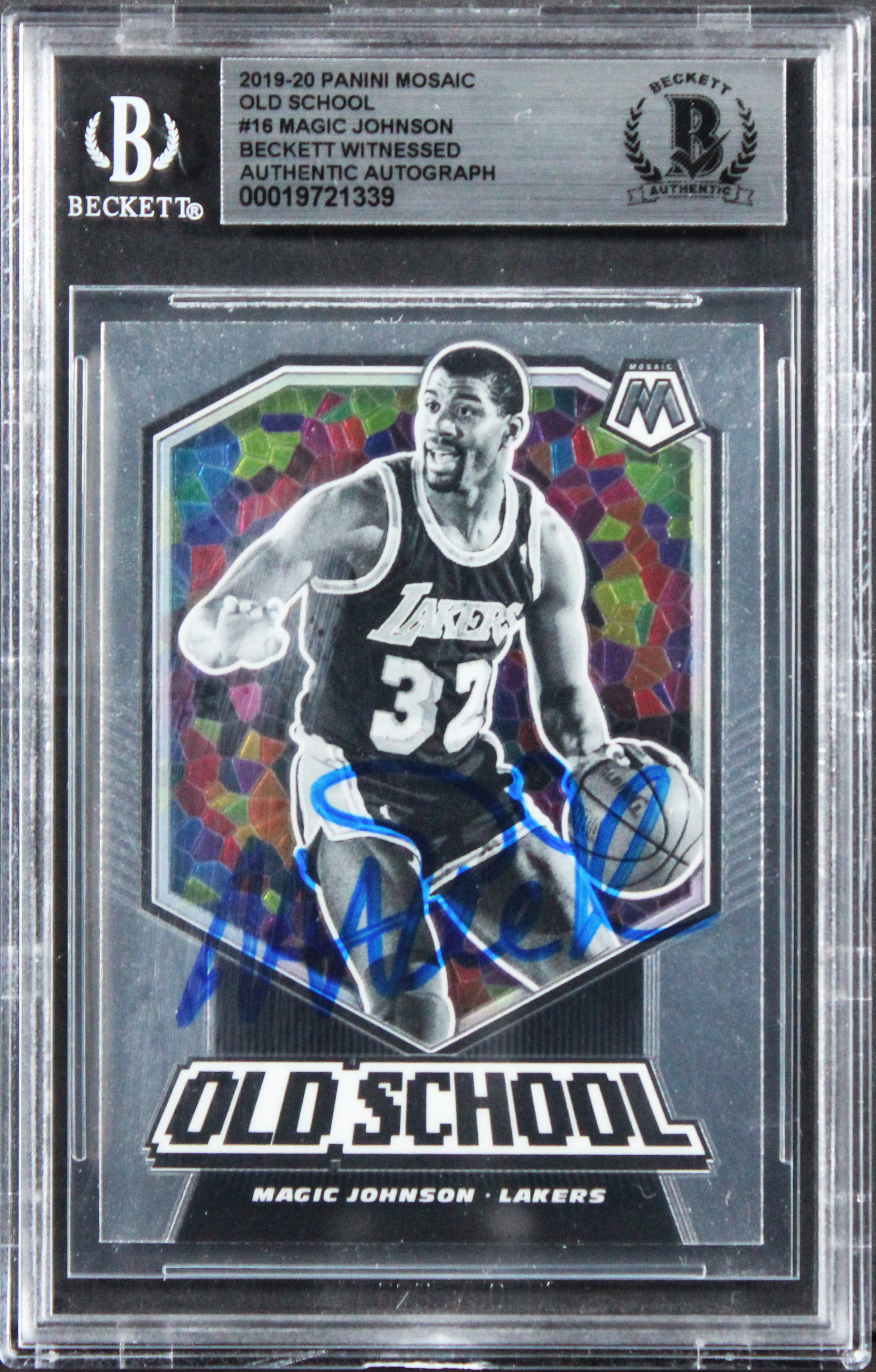 This Autographed 2019 Panini Mosaic Old School #16 Card has been Personally Signed by Magic Johnson of the Los Angeles Lakers. This item is 100% Authentic, it comes slabbed and authenticated by Beckett Authentication Services. The authenticity can be verified on Beckett Authentication Services website.
