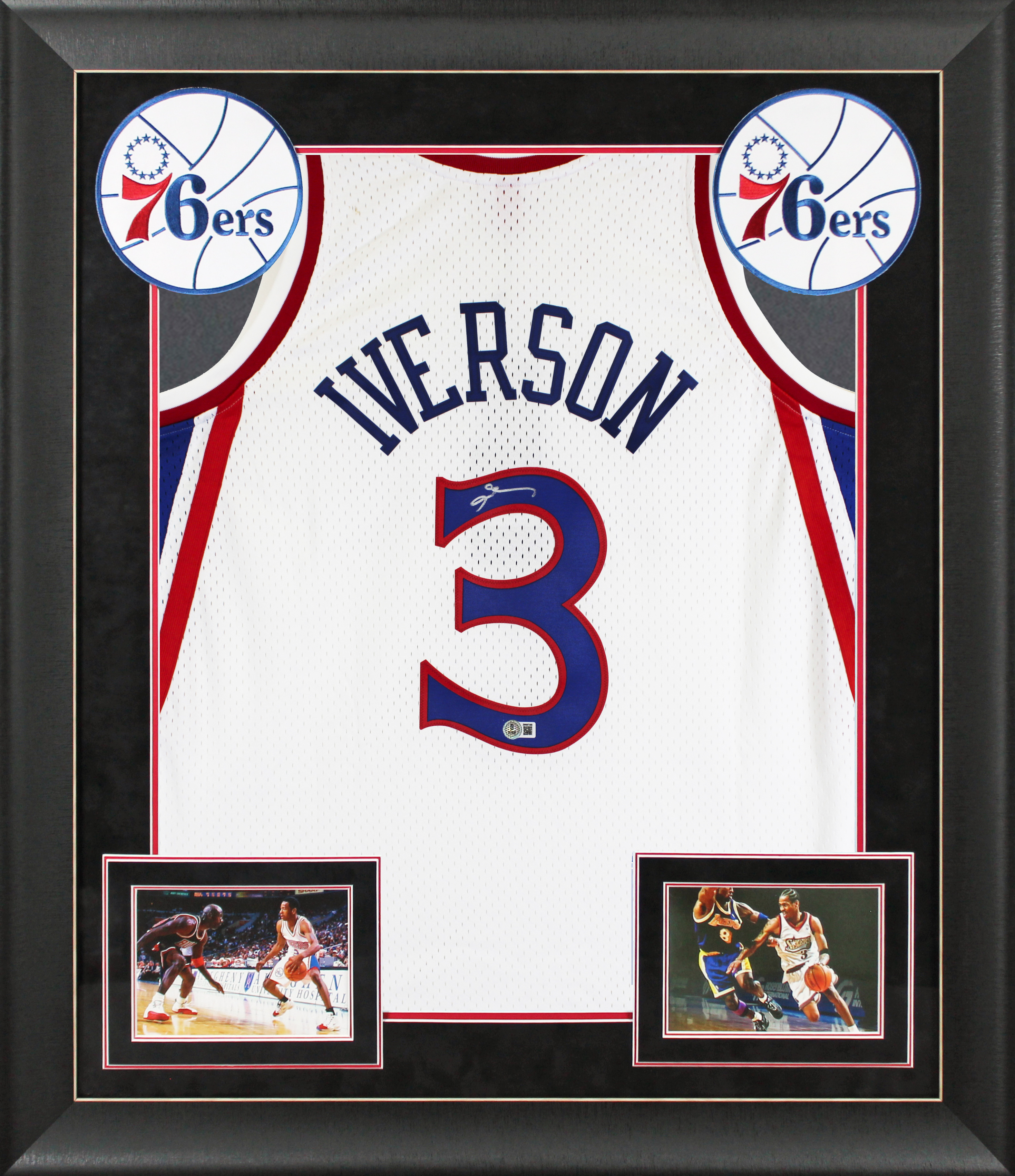 This Autographed White 1996-97 Mitchell & Ness Hardwood Classics Swingman Framed Jersey has been Personally Signed by Allen Iverson of the Philadelphia 76ers. This item is 100% Authentic to include a hologram by Beckett Authentication Services. This item will come with an affixed Beckett Authentication Services (BAS) authentication sticker, which includes a scannable QR code to verify authenticity. Please note that Beckett no longer provides serial-numbered COA cards, and the attached BAS sticker will serve as the complete authentication for this item. This is a BAS Witnessed Protection Program item which means a Beckett Authentication Service representative was present when this item was being signed. We conducted an autograph signing with Allen Iverson where multiples of the same item were signed. While the photographs are representative of this item, the size, placement and strength of the signature may vary. Each item is hand signed, therefore, each autograph is unique. This item can be verified through BAS Witnessed. This item has been professionally framed to overall dimensions of approximately 32 x 37 inches. This jersey will be framed to order, it will take approximately 4-5 business days from purchase date for it to ship.