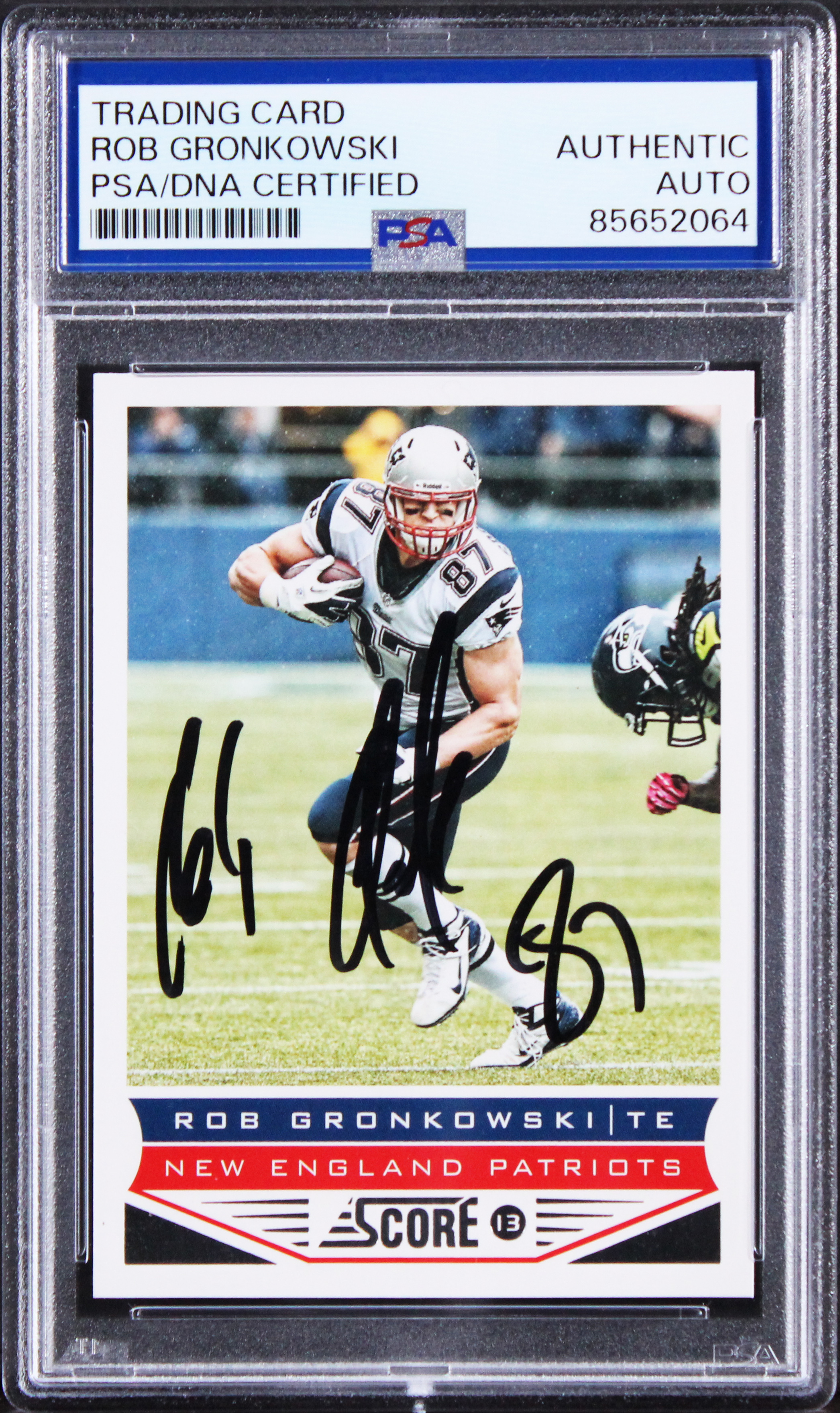 This Autographed 2013 Panini Score #129 Card has been Personally Signed by Rob Gronkowski of the New England Patriots. This item is 100% Authentic, it comes slabbed and authenticated by PSA/DNA. The authenticity can be verified on Professional Sports Authenticator website.