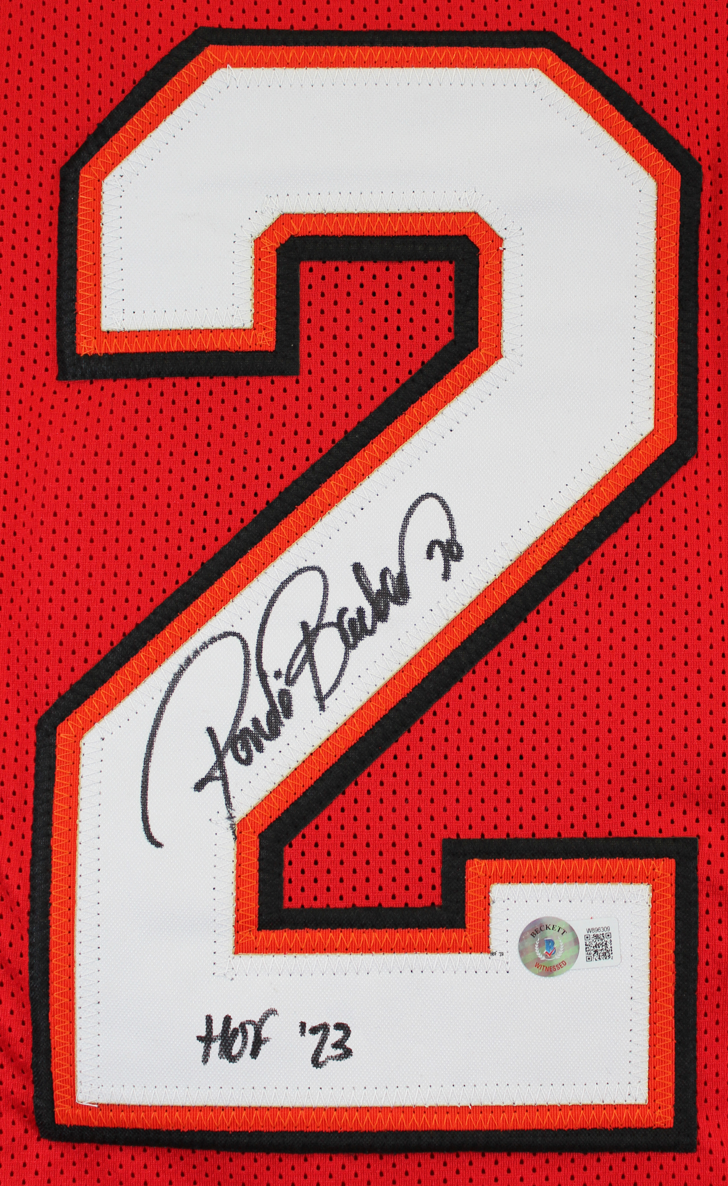 This Autographed Alternate Red Pro Style Jersey with the inscription of "HOF 23" has been Personally Signed by Ronde Barber of the Tampa Bay Buccaneers. This item is 100% Authentic to include a hologram by Beckett Authentication Services. This item will come with an affixed Beckett Authentication Services (BAS) authentication sticker, which includes a scannable QR code to verify authenticity. Please note that Beckett no longer provides serial-numbered COA cards, and the attached BAS sticker will serve as the complete authentication for this item. This is a BAS Witnessed Protection Program item which means a Beckett Authentication Service representative was present when this item was being signed. We conducted an autograph signing with Ronde Barber where multiples of the same item were signed. While the photographs are representative of this item, the size, placement and strength of the signature may vary. Each item is hand signed, therefore, each autograph is unique. This item can be verified through BAS Witnessed. This is a X-Large sized, non-branded, custom-stitched Jersey.