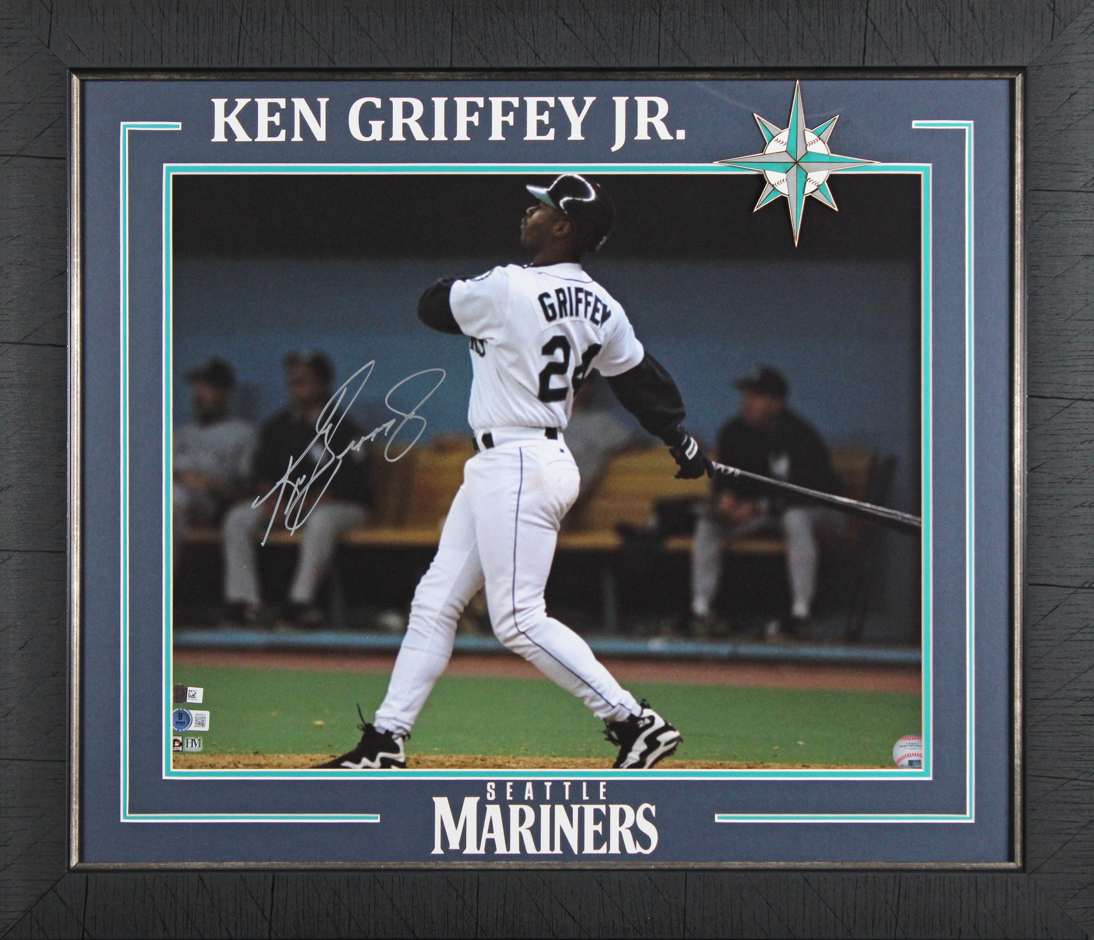 This Autographed 16x20 Framed Photo has been Personally Signed by Ken Griffey Jr. of the Seattle Mariners. This item is 100% Authentic to include a hologram by Beckett Authentication Services. This item will come with an affixed Beckett Authentication Services (BAS) authentication sticker, which includes a scannable QR code to verify authenticity. Please note that Beckett no longer provides serial-numbered COA cards, and the attached BAS sticker will serve as the complete authentication for this item. This is a BAS Witnessed Protection Program item which means a Beckett Authentication Service representative was present when this item was being signed. The authenticity can be verified on Beckett Authentication Services website. This item has been professionally framed to overall dimensions of approximately 23.5 x 27.5 inches.