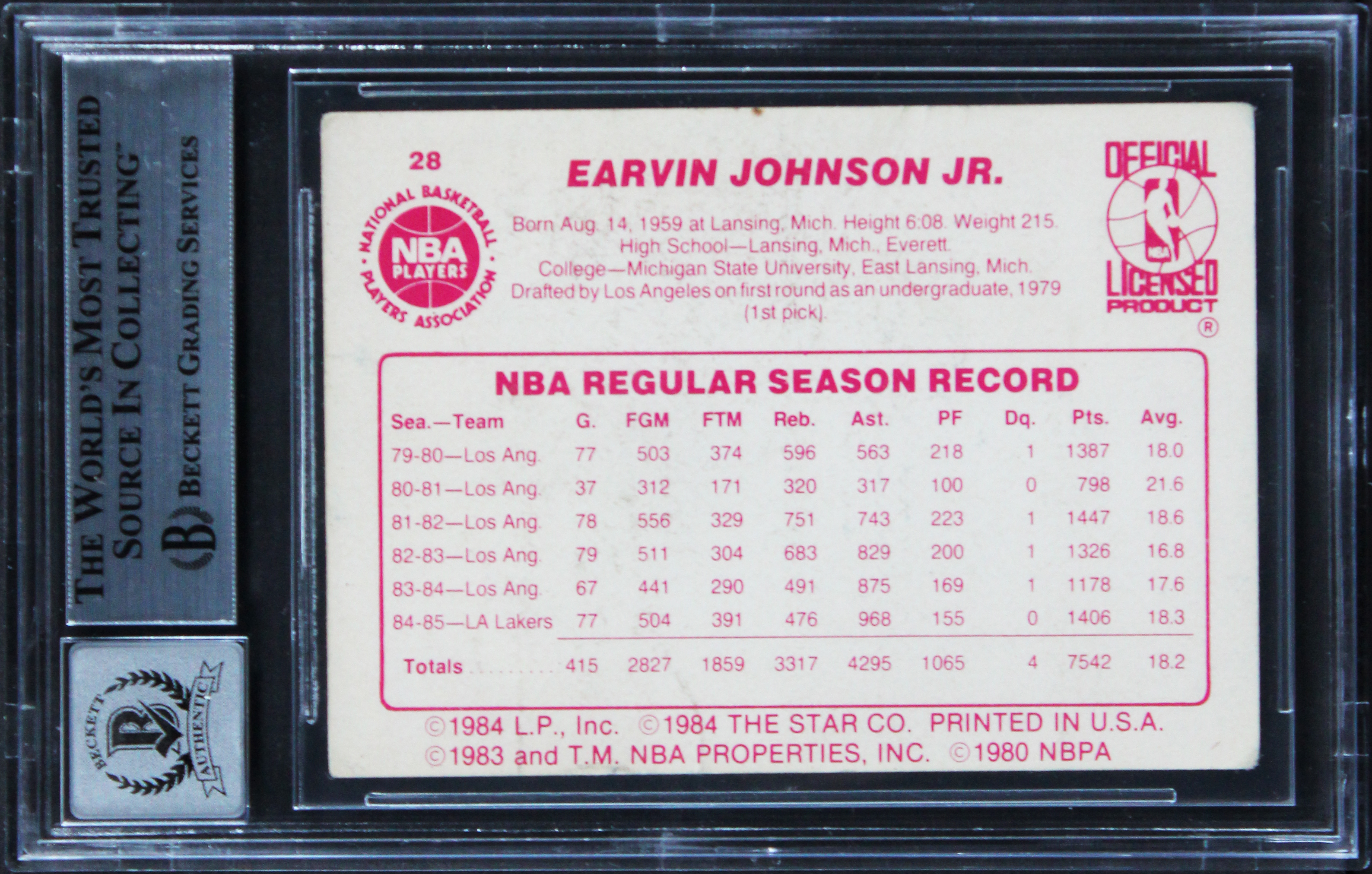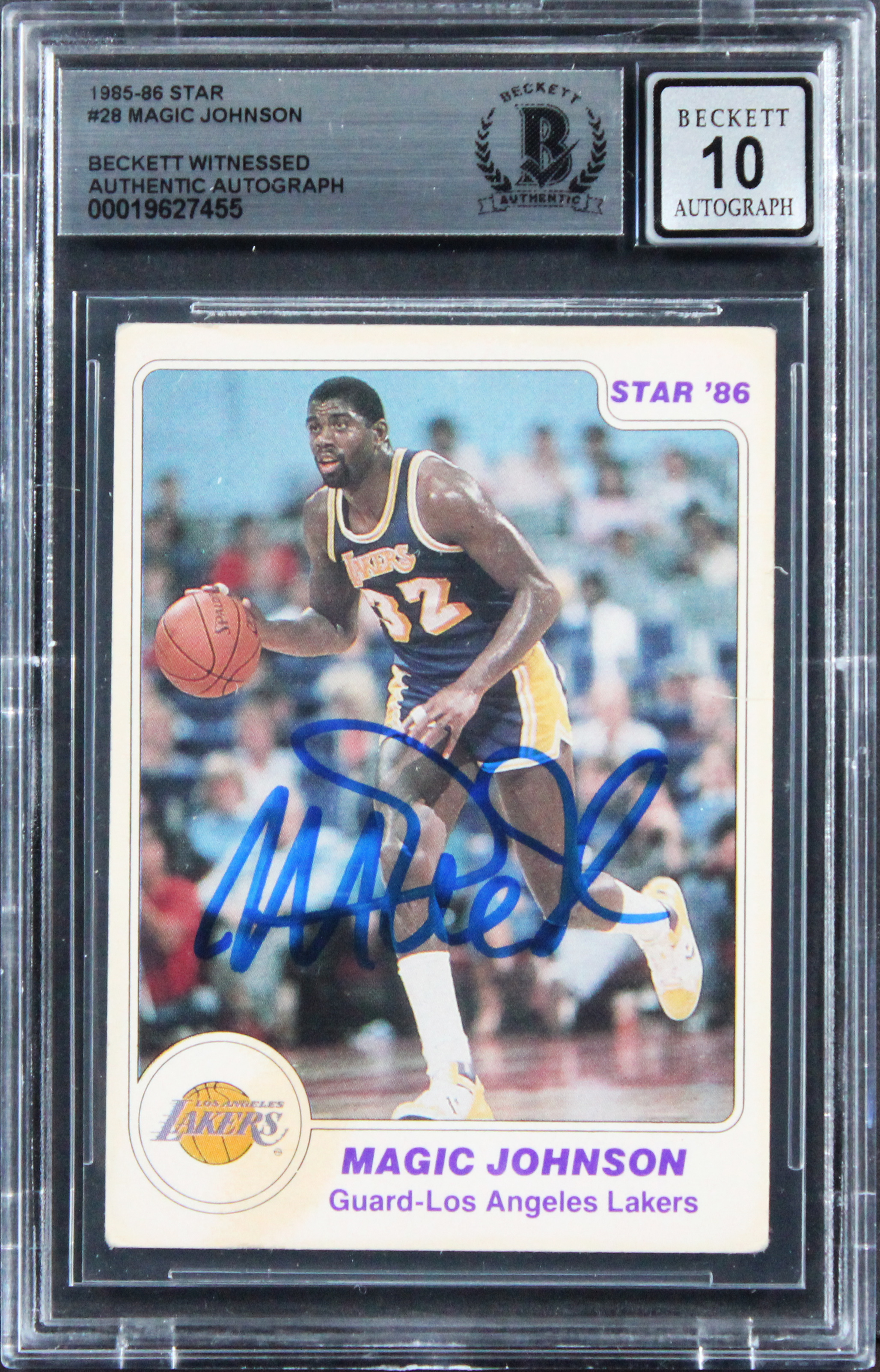 This Autographed Auto Grade Gem Mint 10! 1985 Star #28 Card has been Personally Signed by Magic Johnson of the Los Angeles Lakers. This item is 100% Authentic, it comes slabbed and authenticated by Beckett Authentication Services. The authenticity can be verified on Beckett Authentication Services website.