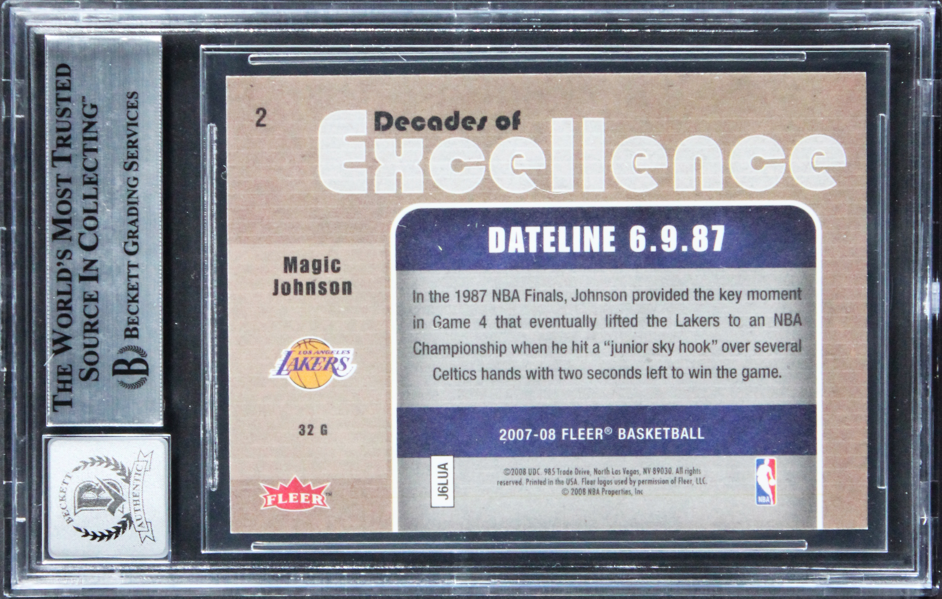 This Autographed Auto Grade Gem Mint 10! 2007 Fleer Decades Of Excellence #2 Card has been Personally Signed by Magic Johnson of the Los Angeles Lakers. This item is 100% Authentic, it comes slabbed and authenticated by Beckett Authentication Services. We conducted an autograph signing with Magic Johnson where multiples of the same item were signed. While the photographs are representative of this item, the size, placement and strength of the signature may vary. Each item is hand signed, therefore, each autograph is unique. This item can be verified through BAS Slabbed.