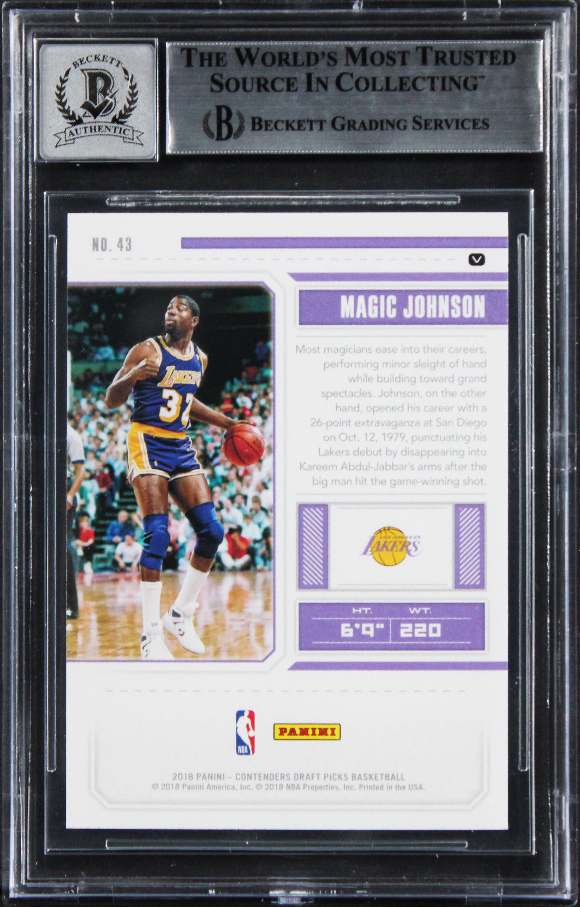 This Autographed Auto Grade Gem Mint 10! 2018 Contenders Draft Picks Variations #43 Card has been Personally Signed by Magic Johnson of the Los Angeles Lakers. This item is 100% Authentic, it comes slabbed and authenticated by Beckett Authentication Services. We conducted an autograph signing with Magic Johnson where multiples of the same item were signed. While the photographs are representative of this item, the size, placement and strength of the signature may vary. Each item is hand signed, therefore, each autograph is unique. This item can be verified through BAS Slabbed.