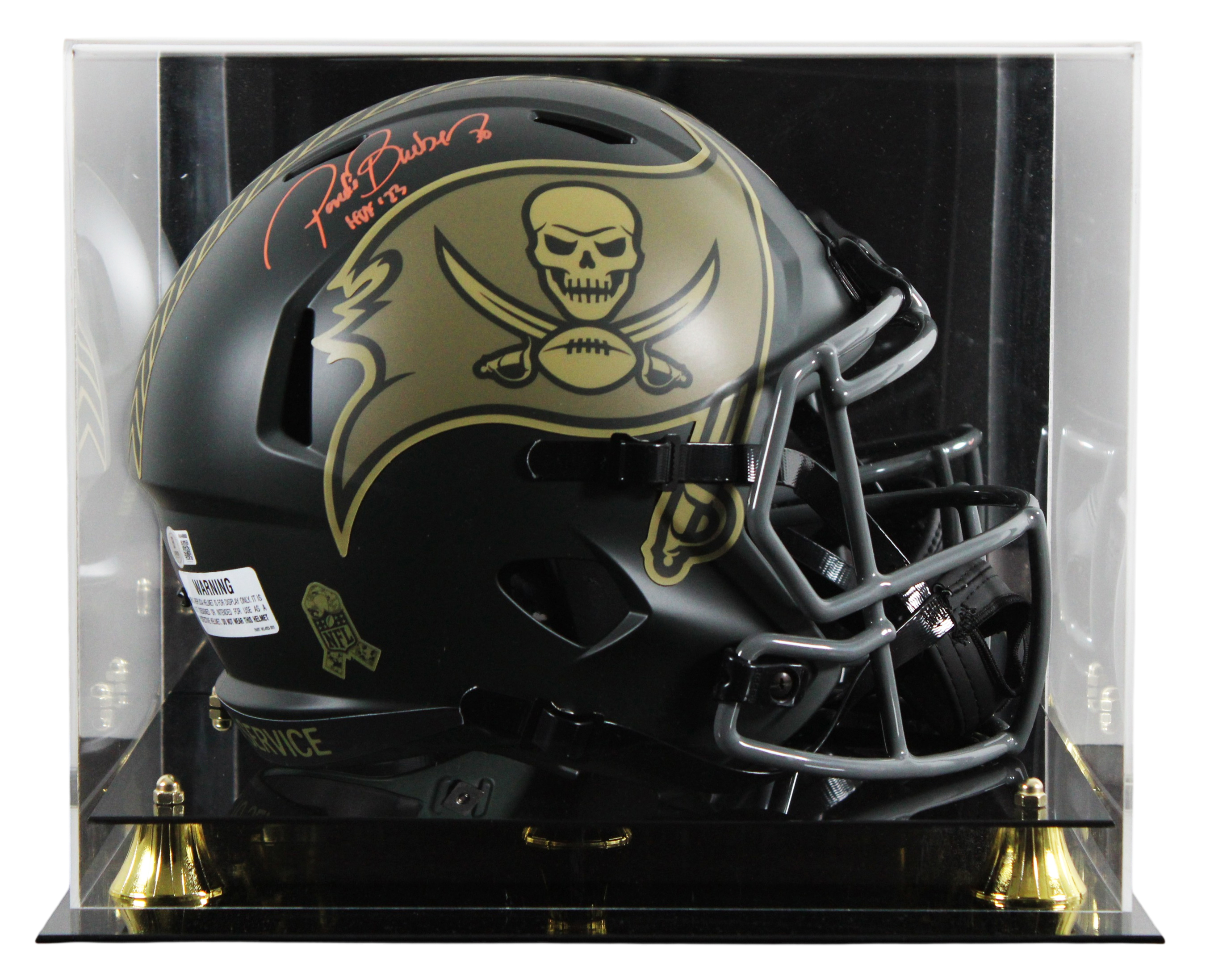 This Autographed Alternate 2025 Salute To Service IV Riddell Full Size Speed Rep Helmet W/ Uv Mirrored Back Acrylic Display Case with the inscription of "HOF 23" has been Personally Signed by Ronde Barber of the Tampa Bay Buccaneers. This item is 100% Authentic to include a hologram by Beckett Authentication Services. This item will come with an affixed Beckett Authentication Services (BAS) authentication sticker, which includes a scannable QR code to verify authenticity. Please note that Beckett no longer provides serial-numbered COA cards, and the attached BAS sticker will serve as the complete authentication for this item. This is a BAS Witnessed Protection Program item which means a Beckett Authentication Service representative was present when this item was being signed. We conducted an autograph signing with Ronde Barber where multiples of the same item were signed. While the photographs are representative of this item, the size, placement and strength of the signature may vary. Each item is hand signed, therefore, each autograph is unique. This item can be verified through BAS Witnessed.