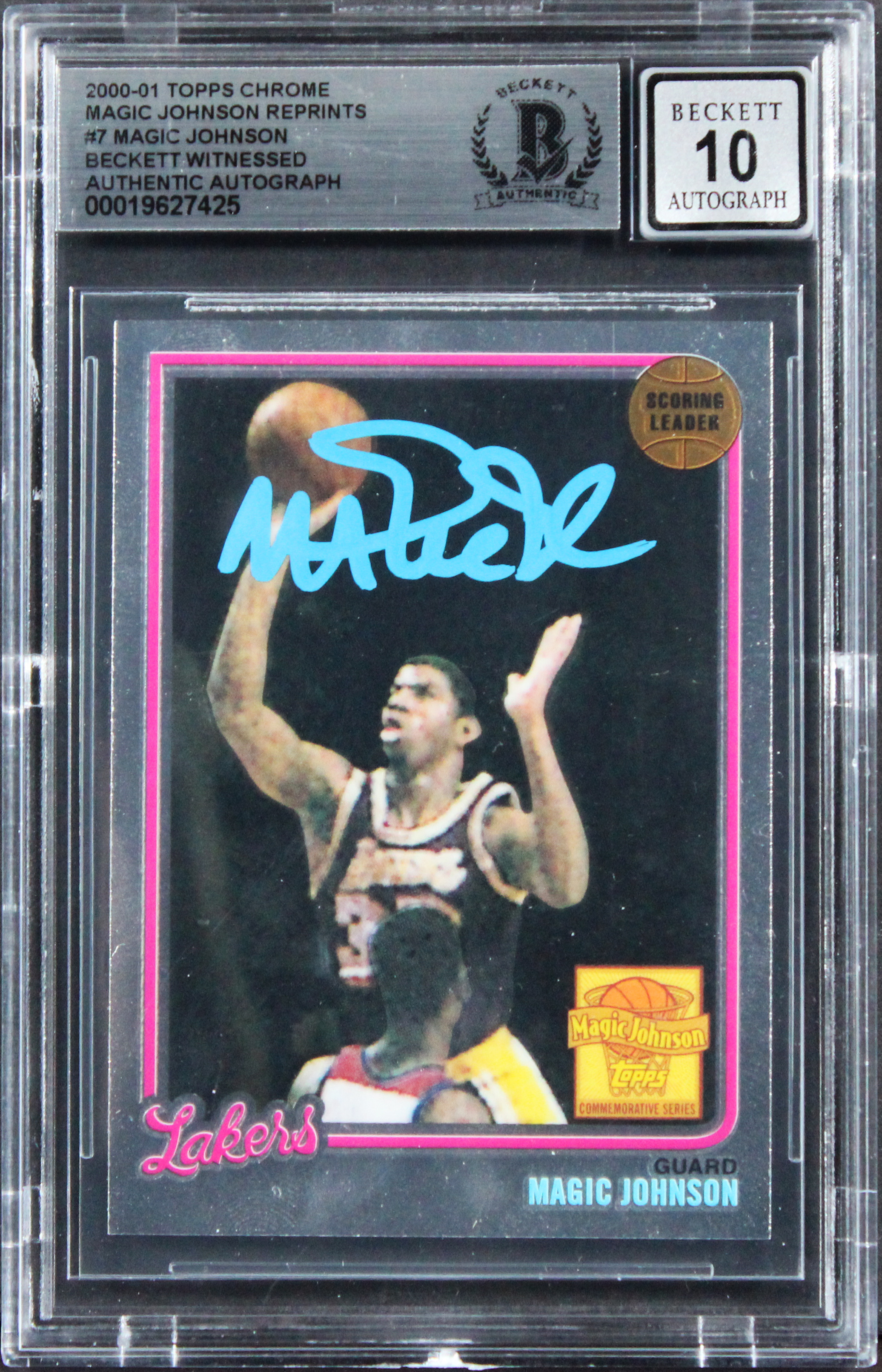 This Autographed Auto Grade Gem Mint 10! 2000 Topps Chrome Magic Johnson Reprints #7 Card has been Personally Signed by Magic Johnson of the Los Angeles Lakers. This item is 100% Authentic, it comes slabbed and authenticated by Beckett Authentication Services. The authenticity can be verified on Beckett Authentication Services website.