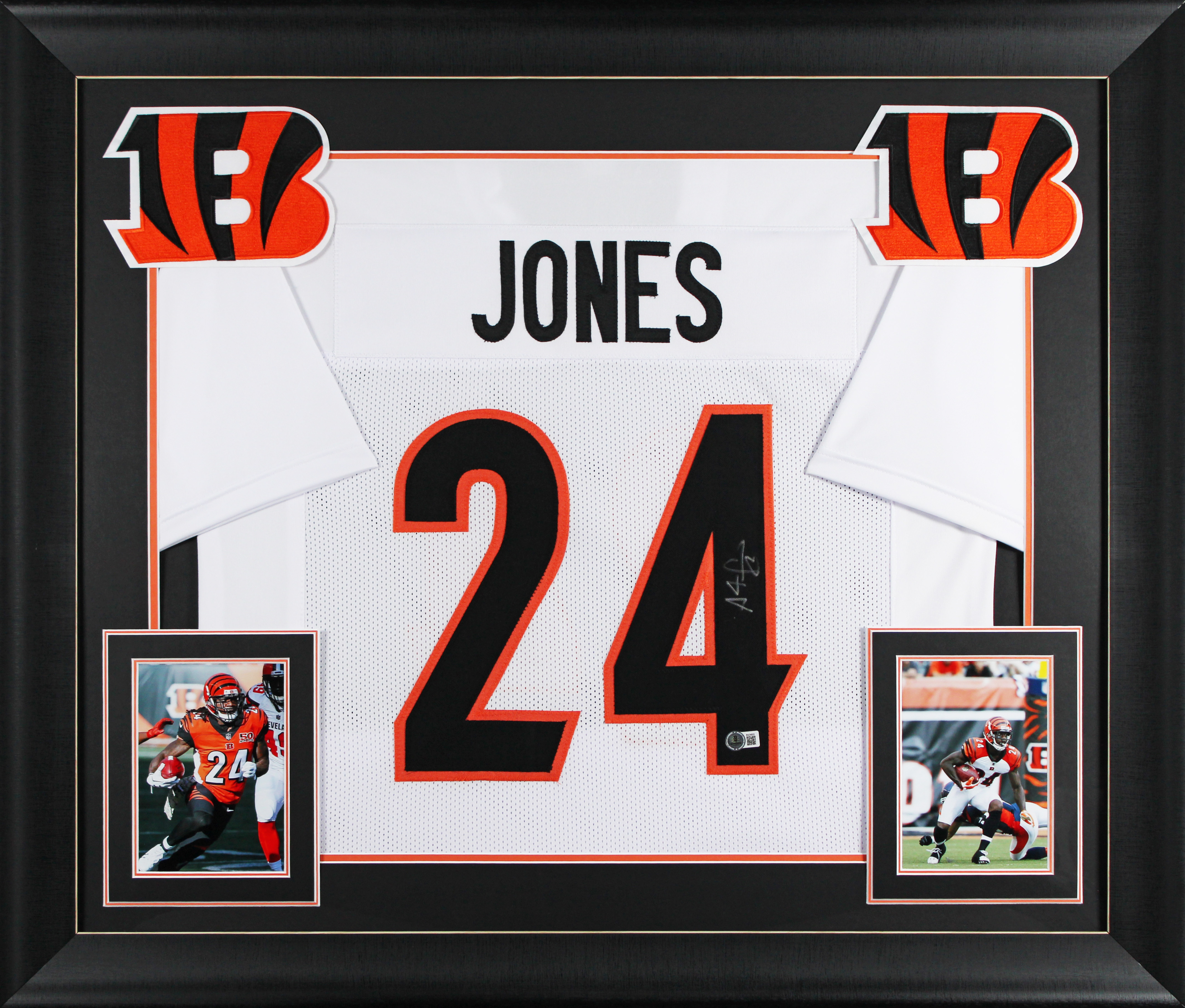 This Autographed White Pro Style Framed Jersey has been Personally Signed by Adam "Pacman" Jones of the Cincinnati Bengals. This item is 100% Authentic to include a hologram by Beckett Authentication Services. This item will come with an affixed Beckett Authentication Services (BAS) authentication sticker, which includes a scannable QR code to verify authenticity. Please note that Beckett no longer provides serial-numbered COA cards, and the attached BAS sticker will serve as the complete authentication for this item. We conducted an autograph signing with Adam "Pacman" Jones where multiples of the same item were signed. While the photographs are representative of this item, the size, placement and strength of the signature may vary. Each item is hand signed, therefore, each autograph is unique. This item can be verified through BAS. This item has been professionally framed to overall dimensions of approximately 32 x 37 inches. This is a X-Large sized, non-branded, custom-stitched Framed Jersey. This jersey will be framed to order, it will take approximately 4-5 business days from purchase date for it to ship.