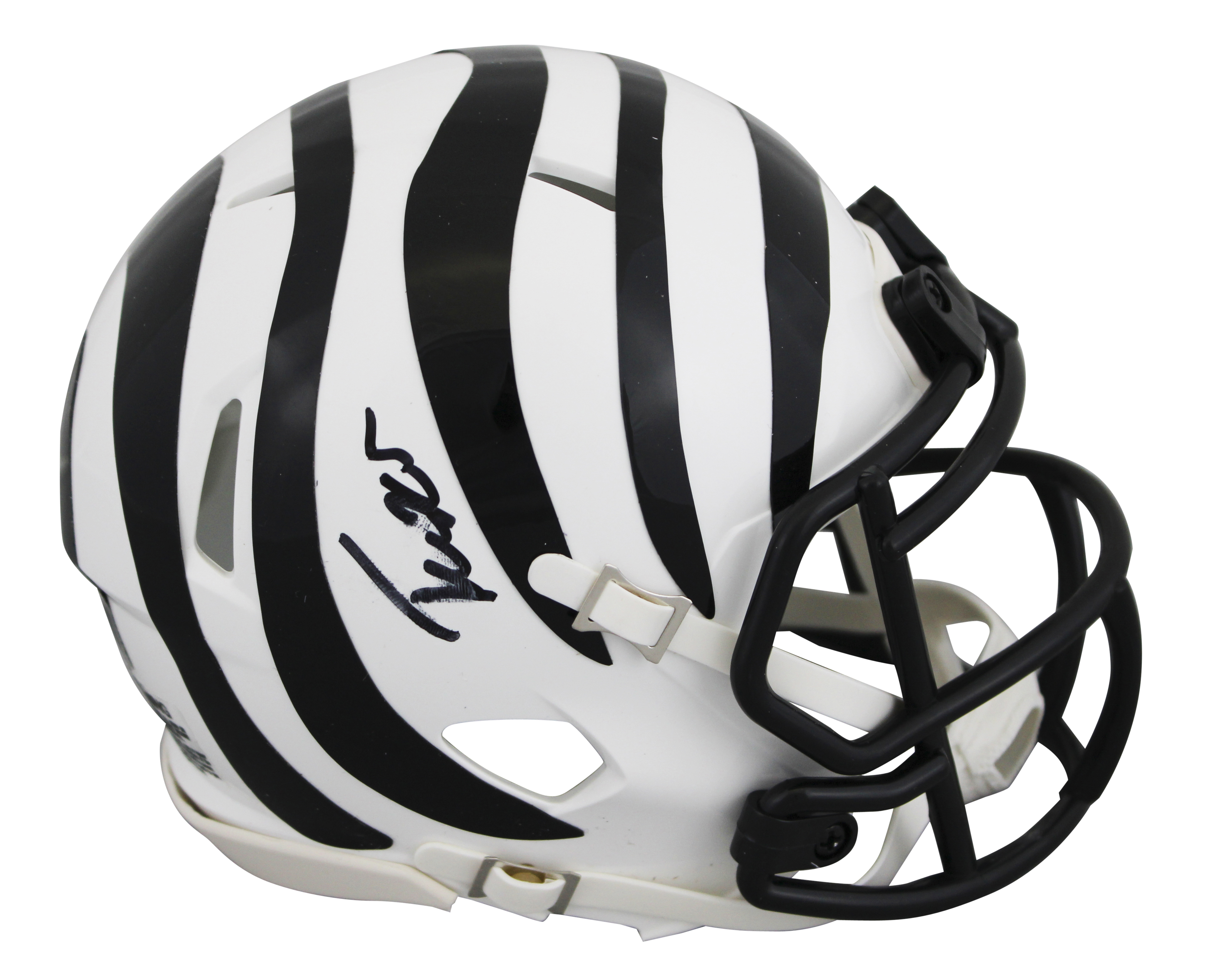 This Autographed 2022 On-Field Alternate Speed Mini Helmet has been Personally Signed by Tee Higgins of the Cincinnati Bengals. This item is 100% Authentic to include a hologram by Beckett Authentication Services. This item will come with an affixed Beckett Authentication Services (BAS) authentication sticker, which includes a scannable QR code to verify authenticity. Please note that Beckett no longer provides serial-numbered COA cards, and the attached BAS sticker will serve as the complete authentication for this item. This is a BAS Witnessed Protection Program item which means a Beckett Authentication Service representative was present when this item was being signed. The authenticity can be verified on Beckett Authentication Services website. The signature is slightly smeared. Please refer to pictures for item's conditions prior to purchase.