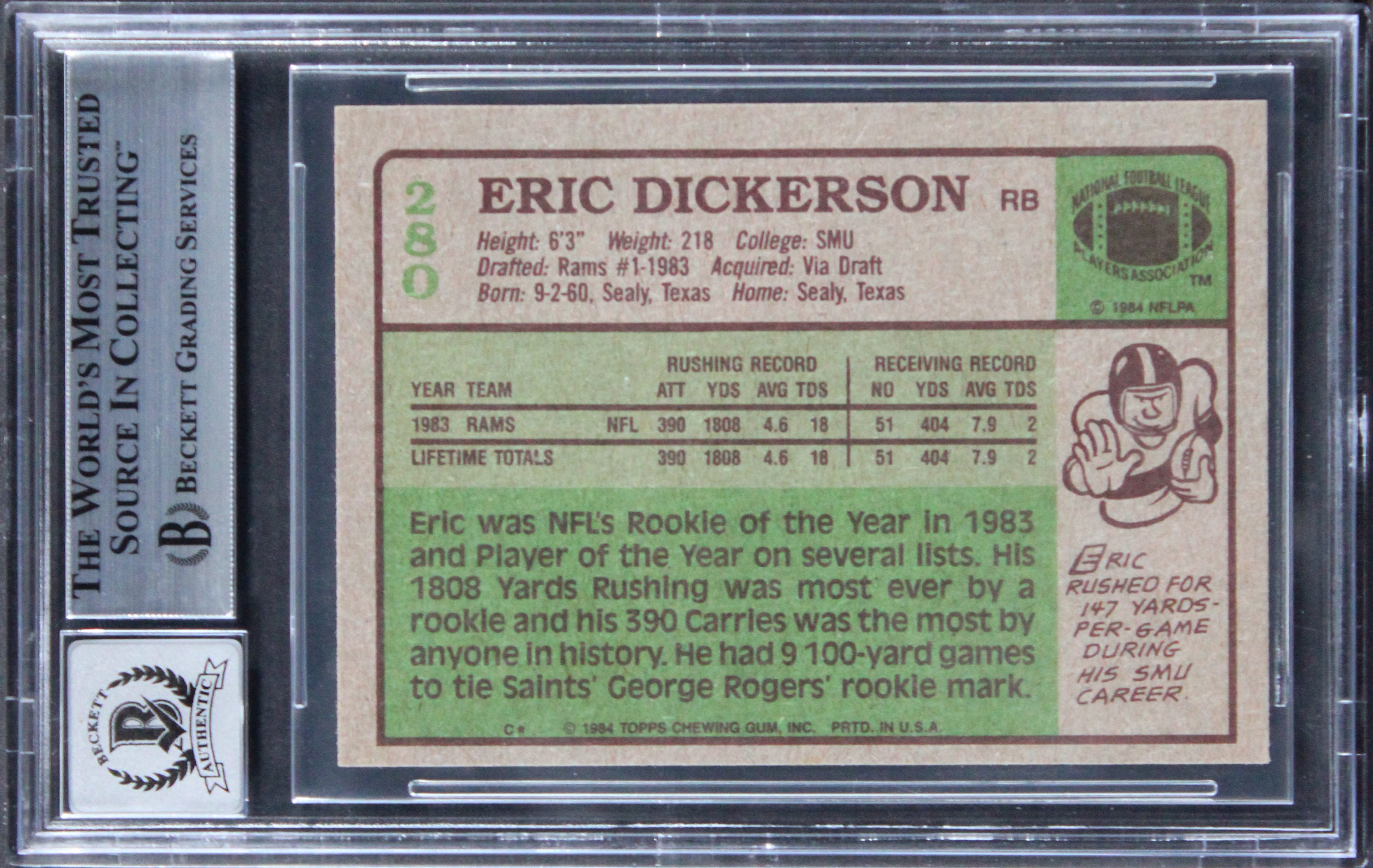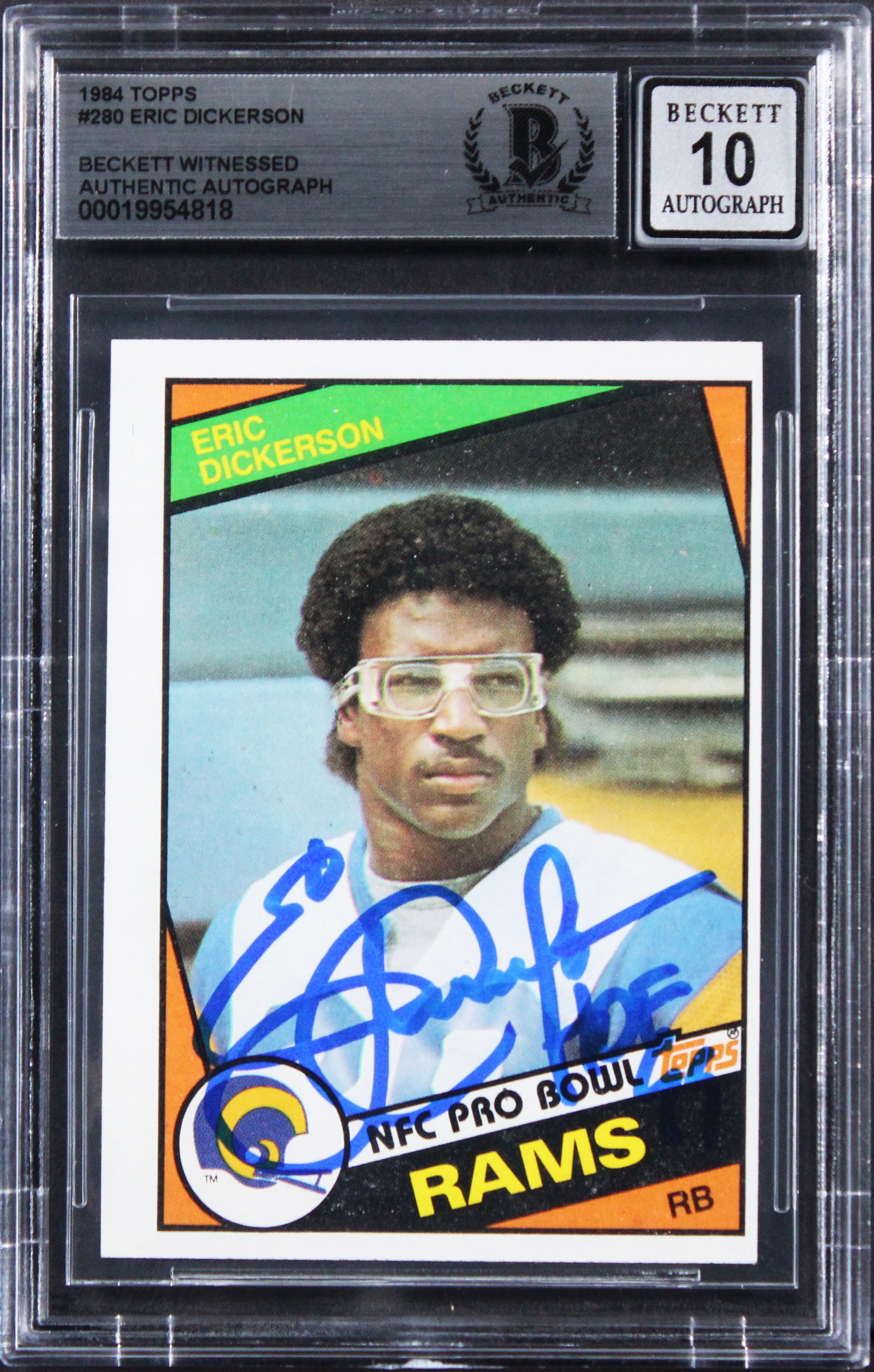 This Autographed Auto Grade Gem Mint 10! 1984 Topps #280 Card with the inscription of "HOF 99" has been Personally Signed by Eric Dickerson of the Los Angeles Rams. This item is 100% Authentic, it comes slabbed and authenticated by Beckett Authentication Services. The authenticity can be verified on Beckett Authentication Services website.