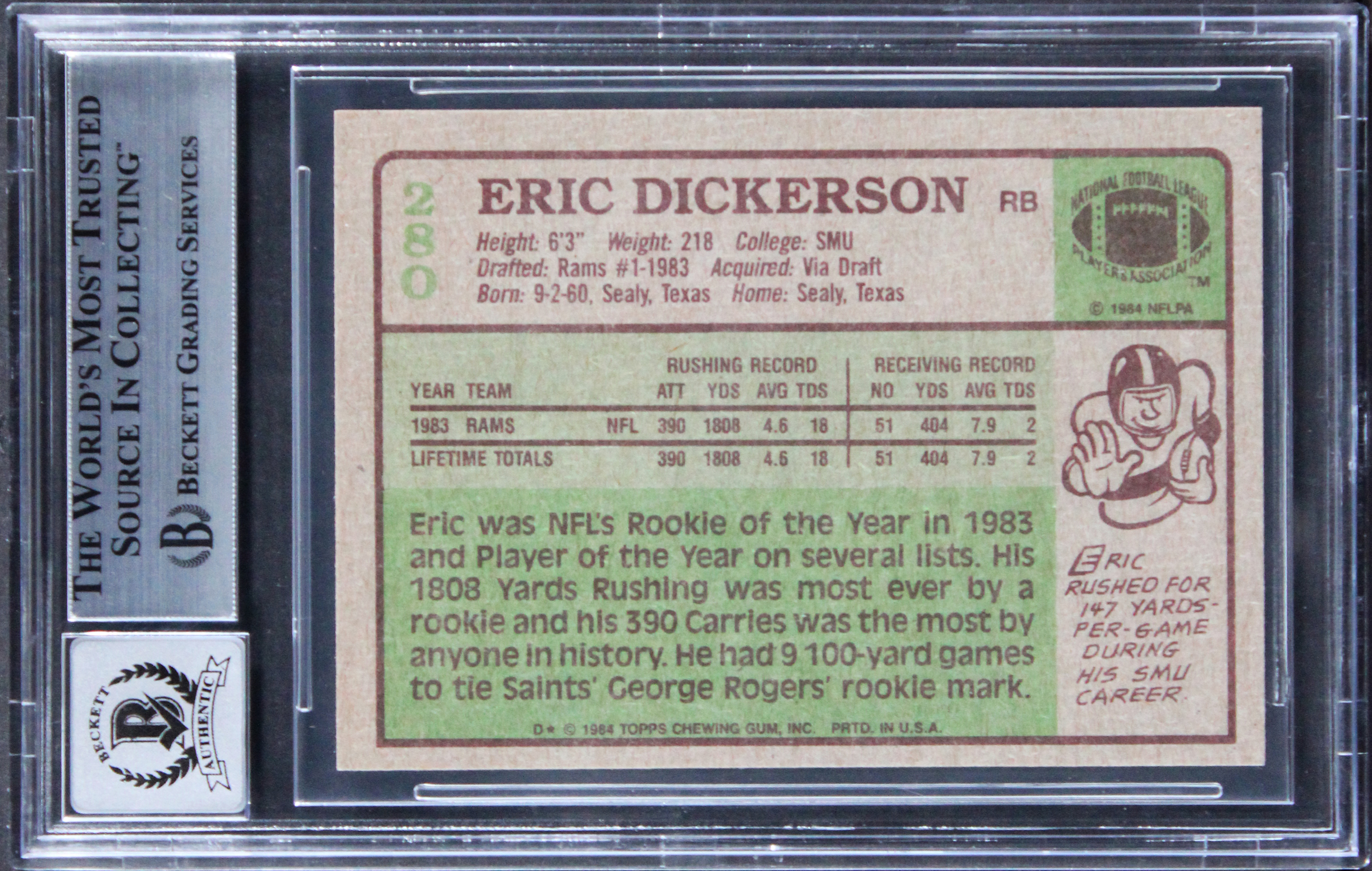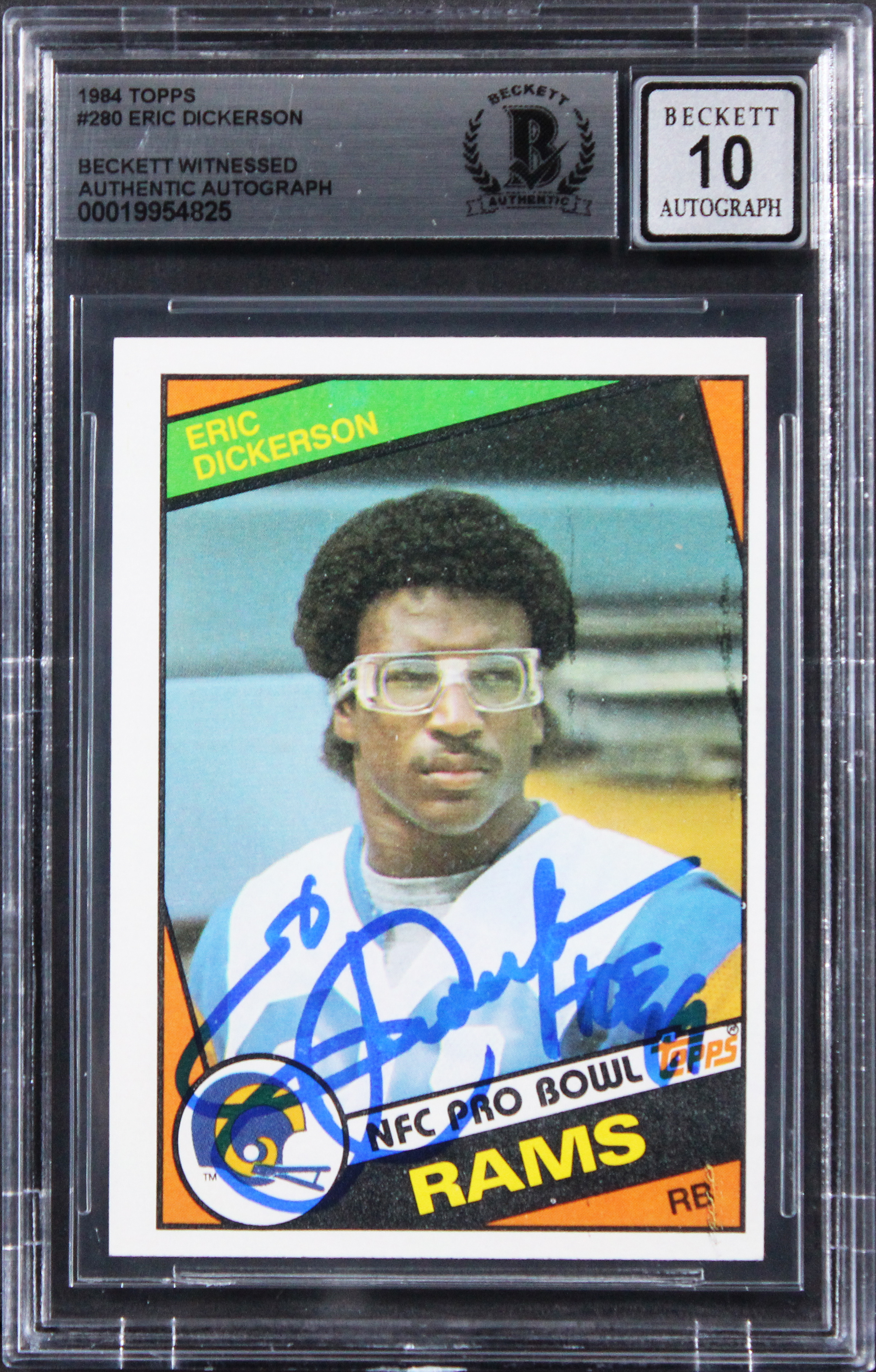 This Autographed Auto Grade Gem Mint 10! 1984 Topps #280 Card with the inscription of "HOF 99" has been Personally Signed by Eric Dickerson of the Los Angeles Rams. This item is 100% Authentic, it comes slabbed and authenticated by Beckett Authentication Services. The authenticity can be verified on Beckett Authentication Services website.