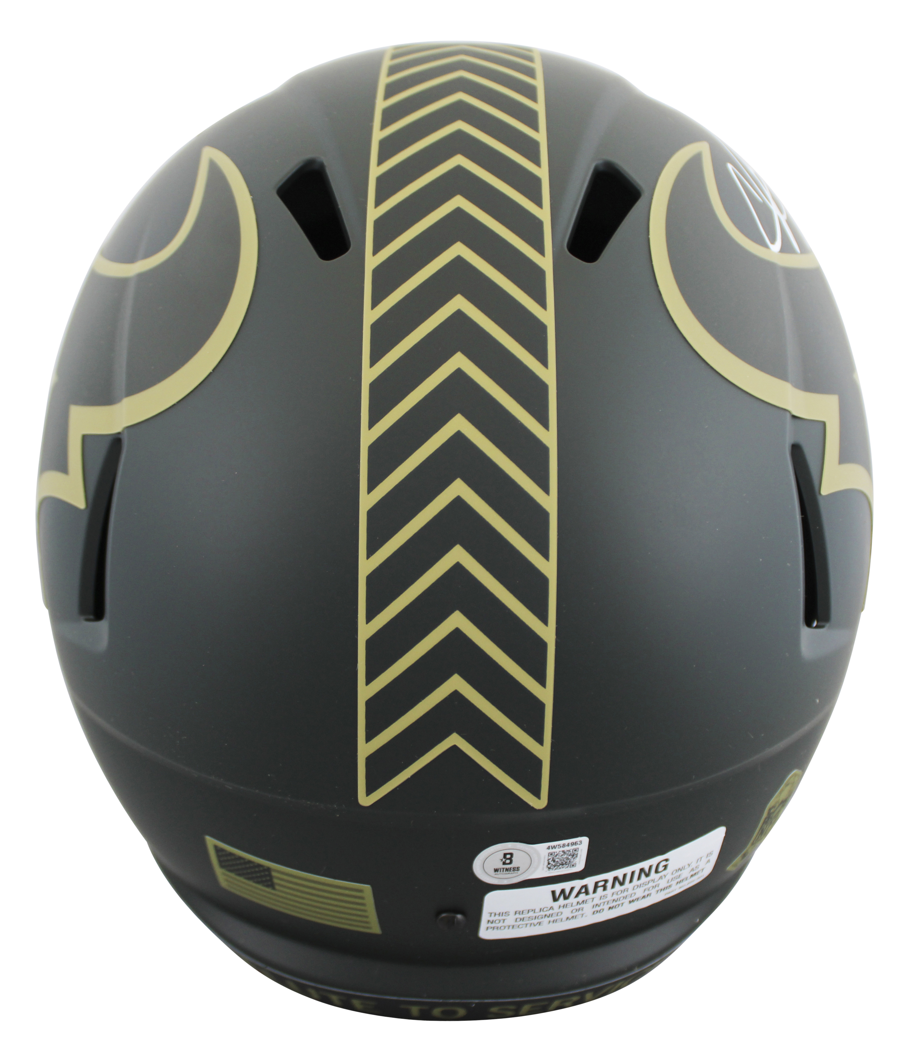 This Autographed Alternate 2025 Salute To Service IV Riddell Full Size Speed Rep Helmet has been Personally Signed by Andre Johnson of the Houston Texans. This item is 100% Authentic to include a hologram by Beckett Authentication Services. This item will come with an affixed Beckett Authentication Services (BAS) authentication sticker, which includes a scannable QR code to verify authenticity. Please note that Beckett no longer provides serial-numbered COA cards, and the attached BAS sticker will serve as the complete authentication for this item. This is a BAS Witnessed Protection Program item which means a Beckett Authentication Service representative was present when this item was being signed. We conducted an autograph signing with Andre Johnson where multiples of the same item were signed. While the photographs are representative of this item, the size, placement and strength of the signature may vary. Each item is hand signed, therefore, each autograph is unique. This item can be verified through BAS Witnessed.