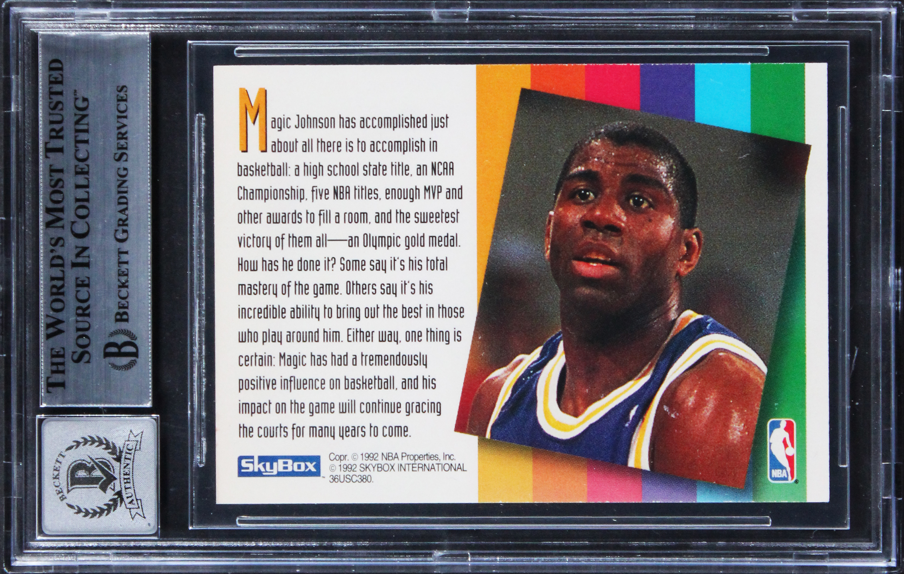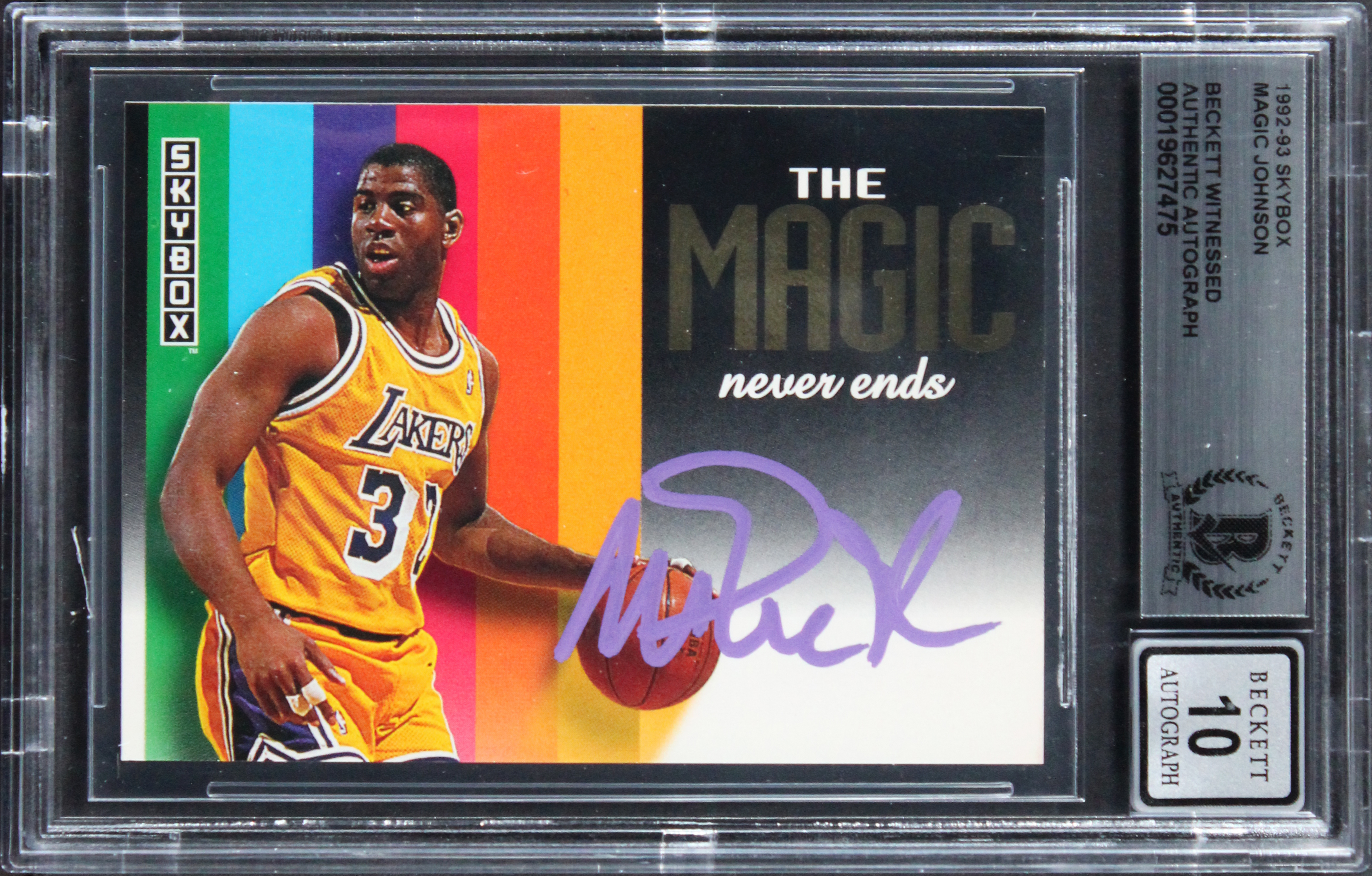 This Autographed Auto Grade Gem Mint 10! 1992 Skybox Card has been Personally Signed by Magic Johnson of the Los Angeles Lakers. This item is 100% Authentic, it comes slabbed and authenticated by Beckett Authentication Services. We conducted an autograph signing with Magic Johnson where multiples of the same item were signed. While the photographs are representative of this item, the size, placement and strength of the signature may vary. Each item is hand signed, therefore, each autograph is unique. This item can be verified through BAS Slabbed.