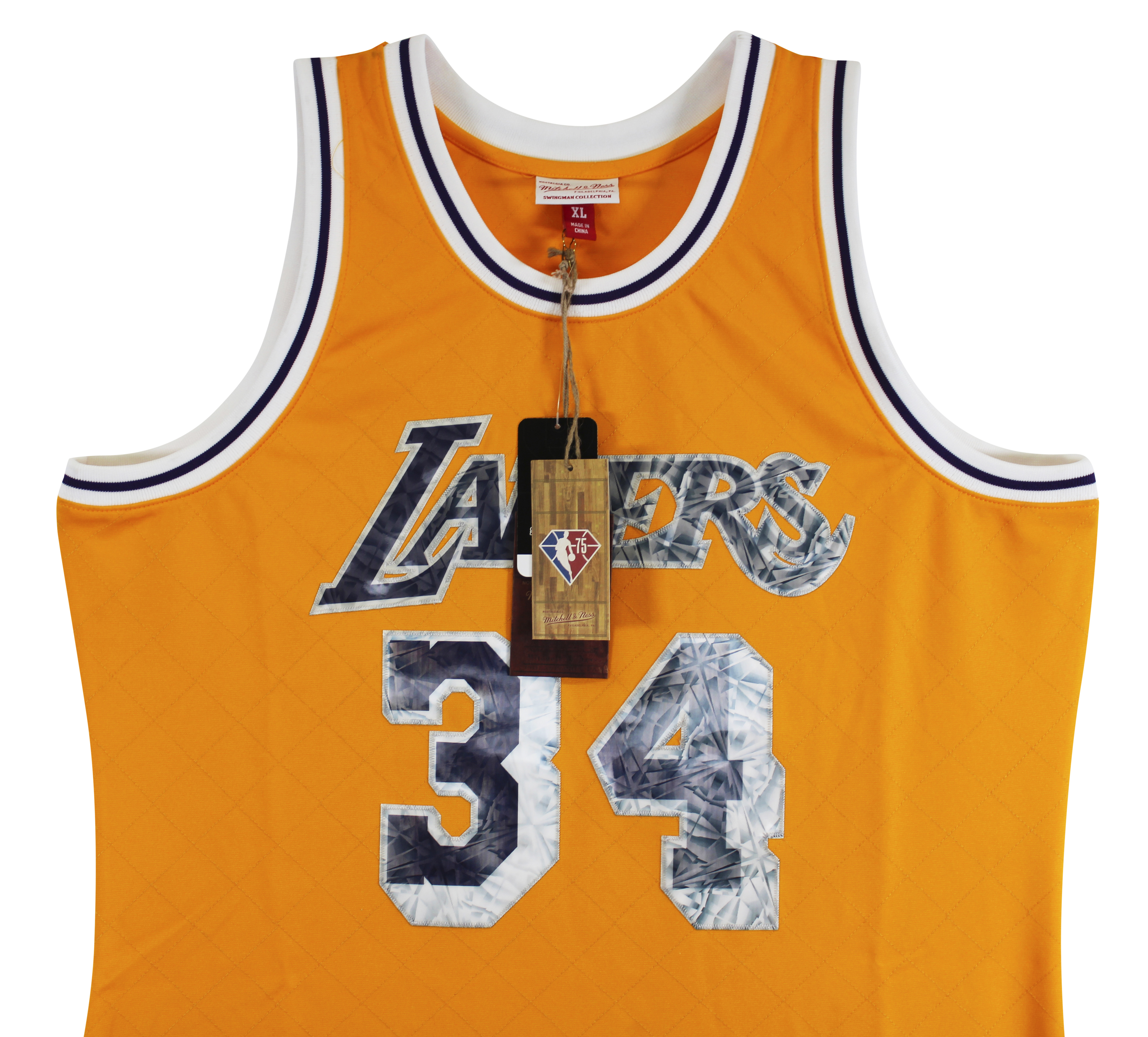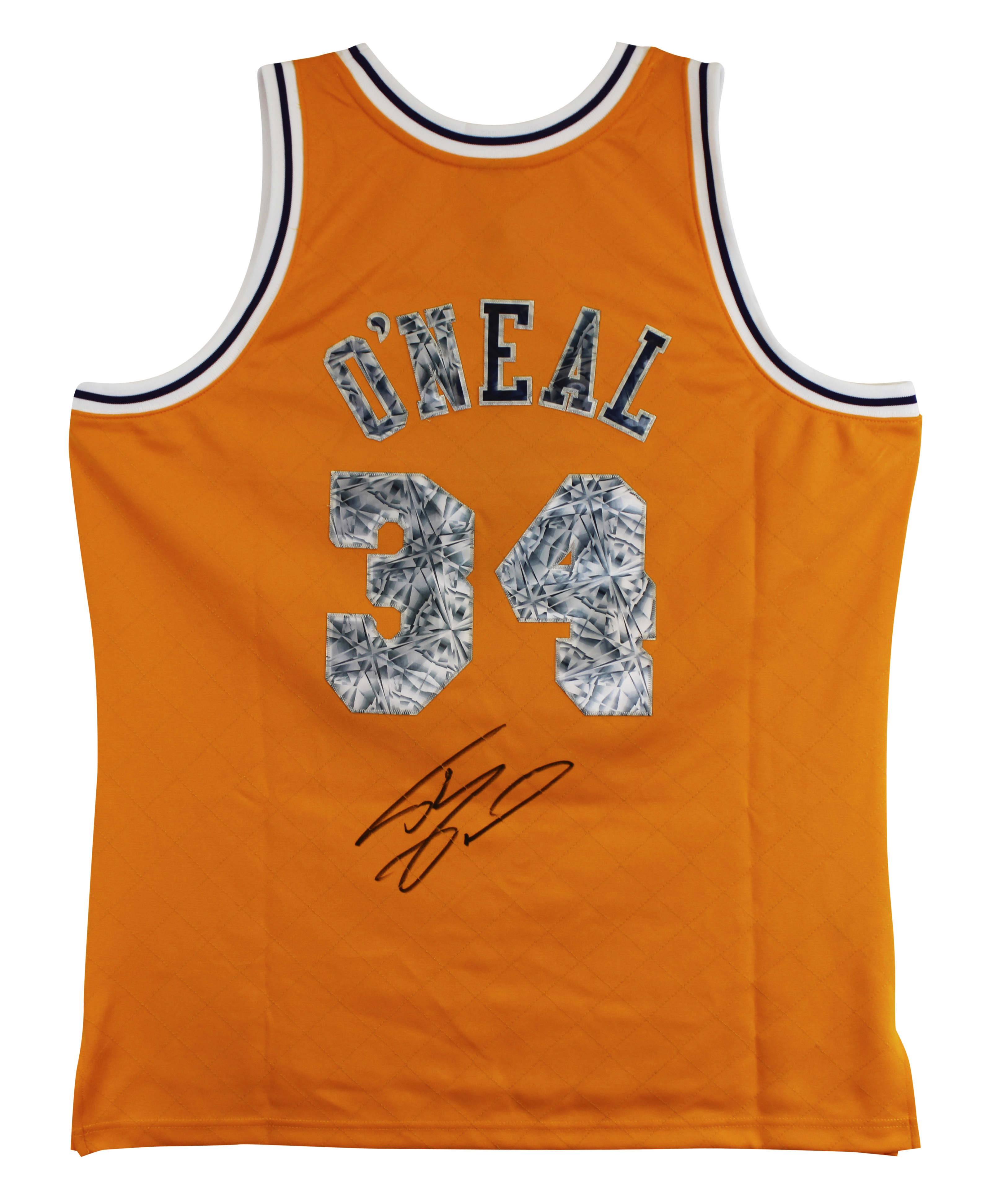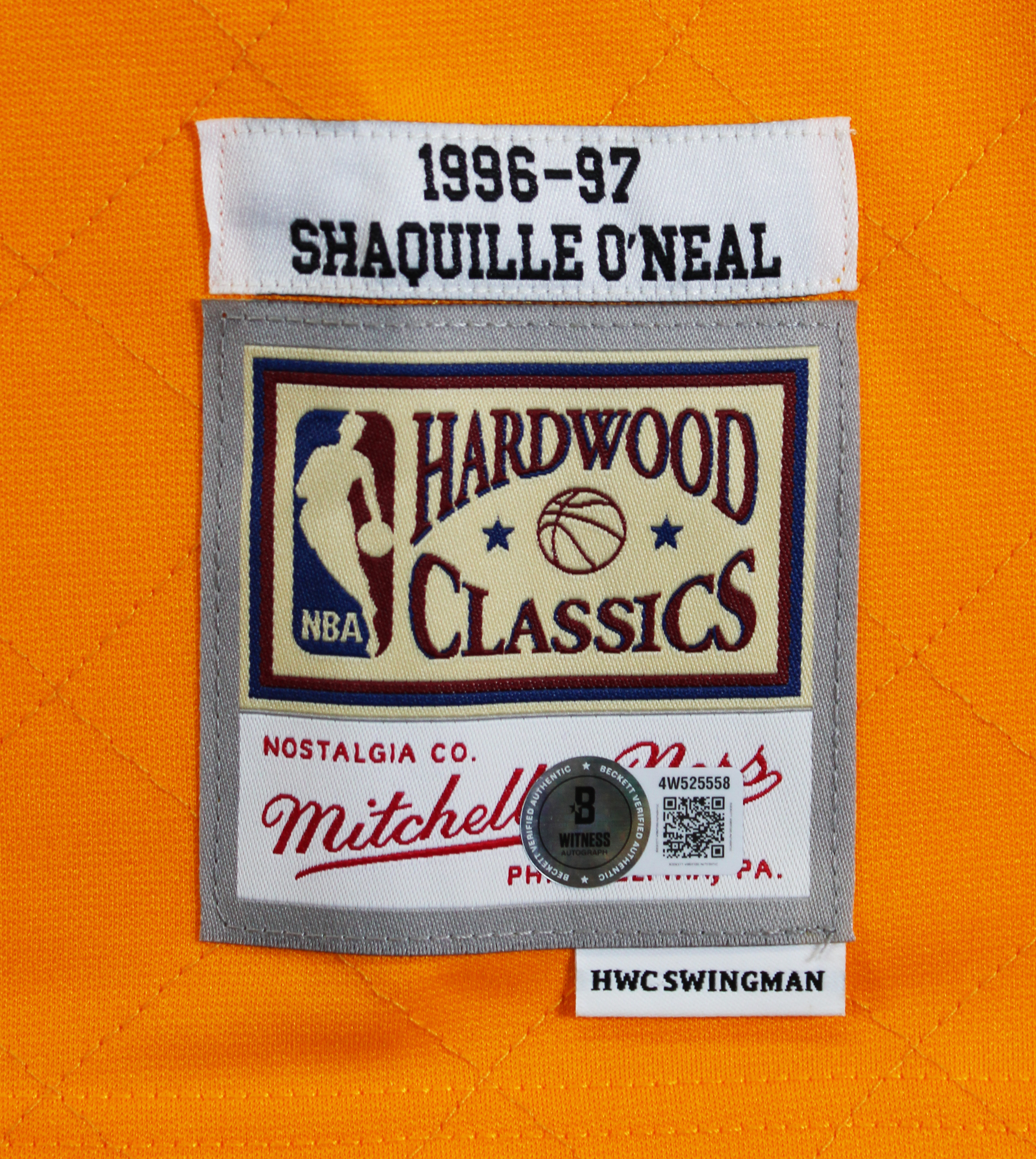 This Autographed Yellow 75th Anniversary Mitchell & Ness 1996 Throwback Hardwood Classics Swingman Jersey has been Personally Signed by Shaquille O'Neal of the Los Angeles Lakers. This item is 100% Authentic to include a hologram by Beckett Authentication Services. This item will come with an affixed Beckett Authentication Services (BAS) authentication sticker, which includes a scannable QR code to verify authenticity. Please note that Beckett no longer provides serial-numbered COA cards, and the attached BAS sticker will serve as the complete authentication for this item. This is a BAS Witnessed Protection Program item which means a Beckett Authentication Service representative was present when this item was being signed. We conducted an autograph signing with Shaquille O'Neal where multiples of the same item were signed. While the photographs are representative of this item, the size, placement and strength of the signature may vary. Each item is hand signed, therefore, each autograph is unique. This item can be verified through BAS Witnessed. This is a X-Large sized Jersey.