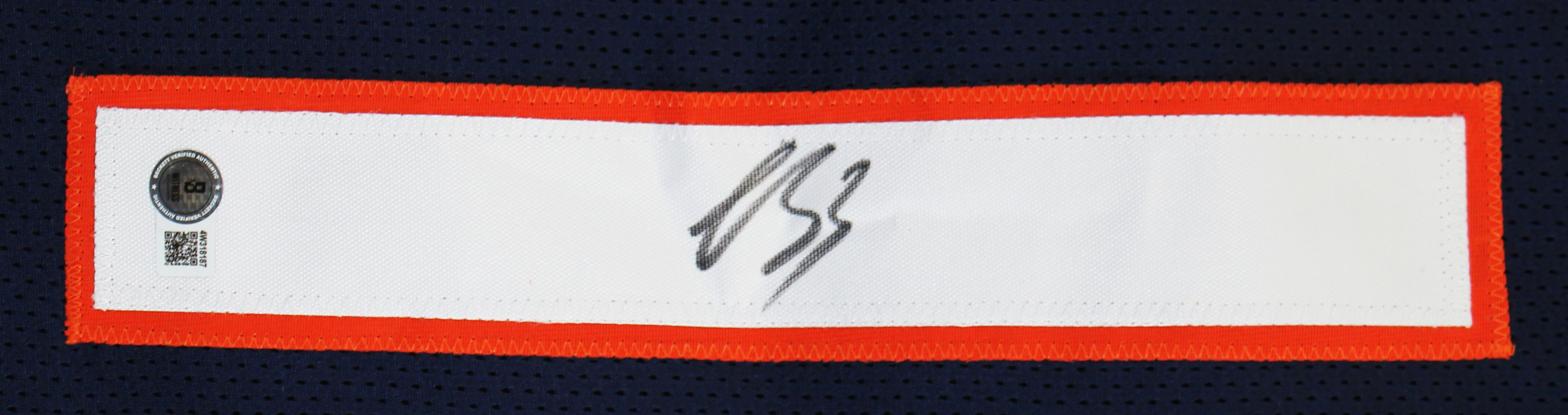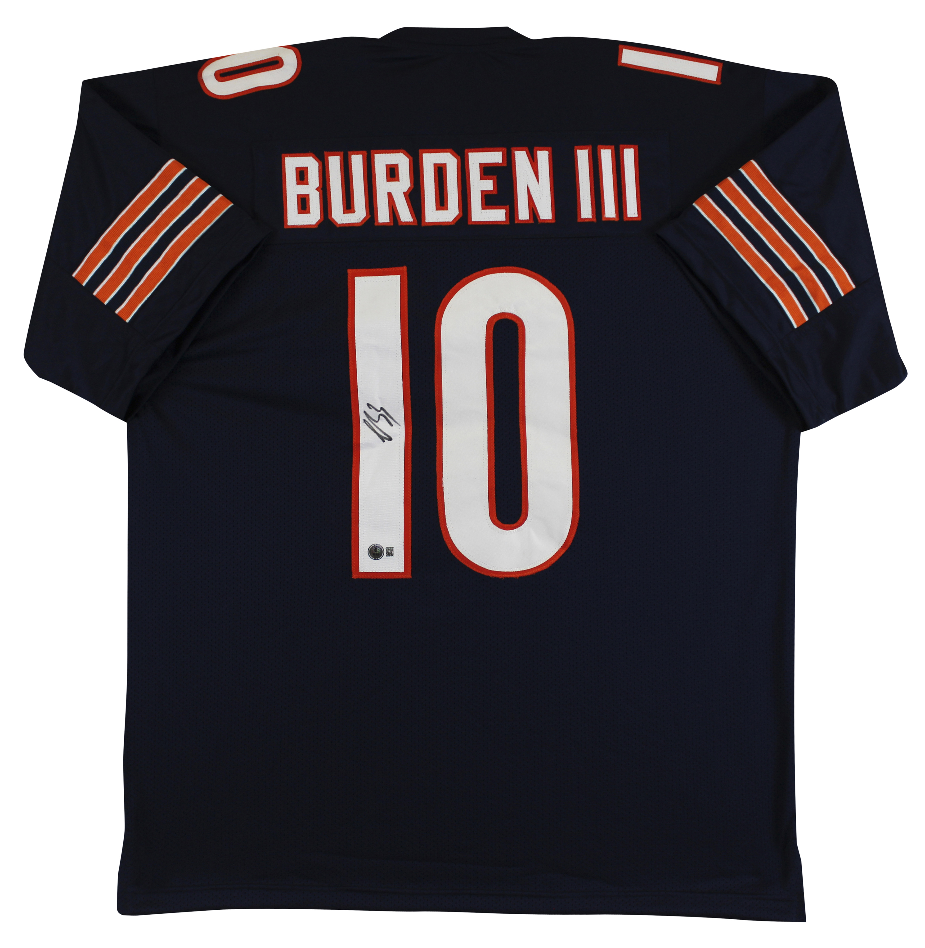 This Autographed Navy Pro Style Jersey has been Personally Signed by Luther Burden III of the Chicago Bears. This item is 100% Authentic to include a hologram by Beckett Authentication Services. This item will come with an affixed Beckett Authentication Services (BAS) authentication sticker, which includes a scannable QR code to verify authenticity. Please note that Beckett no longer provides serial-numbered COA cards, and the attached BAS sticker will serve as the complete authentication for this item. This is a BAS Witnessed Protection Program item which means a Beckett Authentication Service representative was present when this item was being signed. We conducted an autograph signing with Luther Burden III where multiples of the same item were signed. While the photographs are representative of this item, the size, placement and strength of the signature may vary. Each item is hand signed, therefore, each autograph is unique. This item can be verified through BAS Witnessed. This is a X-Large sized, non-branded, custom-stitched Jersey.