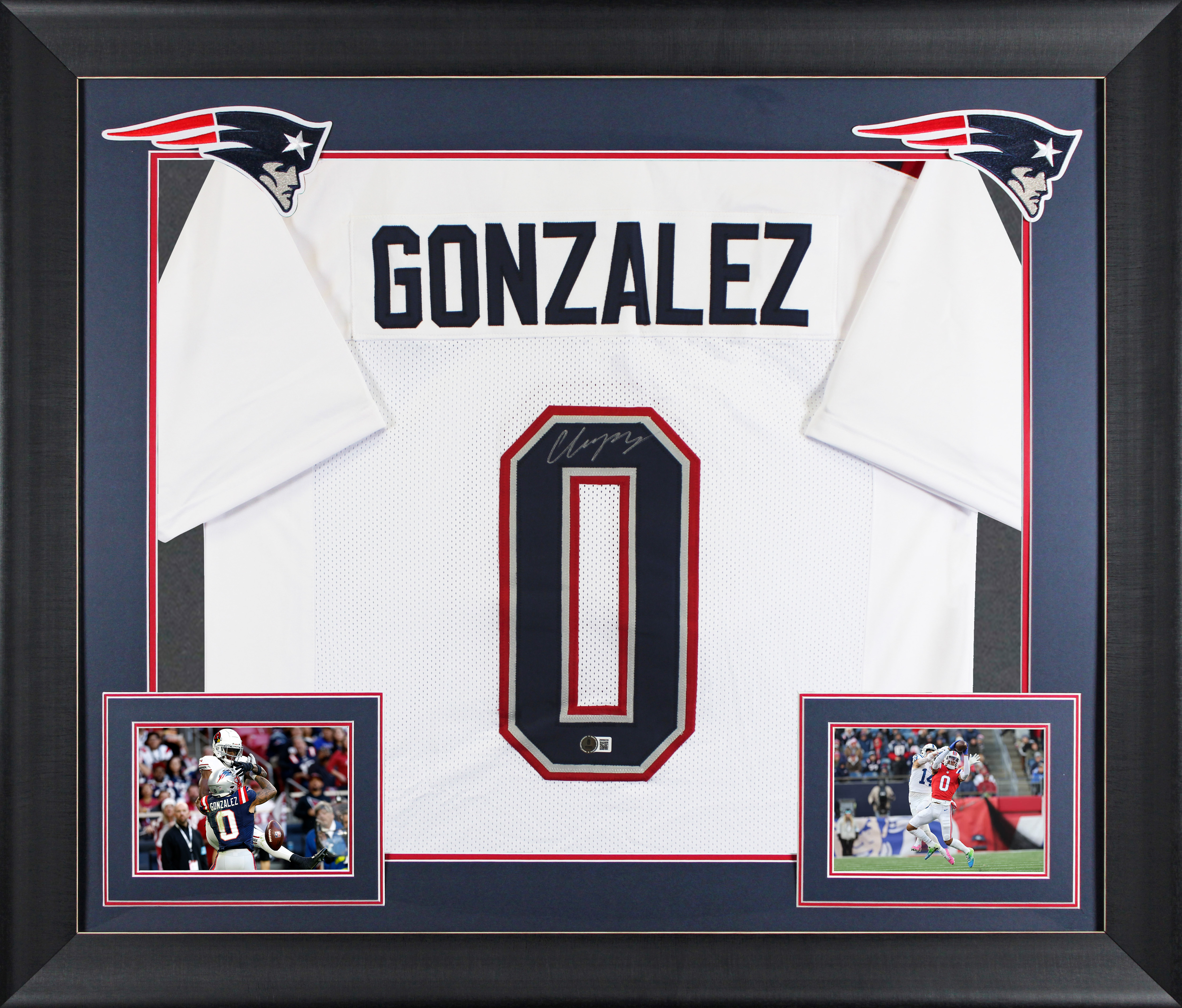 This Autographed White Pro Style Framed Jersey has been Personally Signed by Christian Gonzalez of the New England Patriots. This item is 100% Authentic to include a hologram by Beckett Authentication Services. This item will come with an affixed Beckett Authentication Services (BAS) authentication sticker, which includes a scannable QR code to verify authenticity. Please note that Beckett no longer provides serial-numbered COA cards, and the attached BAS sticker will serve as the complete authentication for this item. This is a BAS Witnessed Protection Program item which means a Beckett Authentication Service representative was present when this item was being signed. We conducted an autograph signing with Christian Gonzalez where multiples of the same item were signed. While the photographs are representative of this item, the size, placement and strength of the signature may vary. Each item is hand signed, therefore, each autograph is unique. This item can be verified through BAS Witnessed. This item has been professionally framed to overall dimensions of approximately 32 x 37 inches. This is a X-Large sized, non-branded, custom-stitched Framed Jersey. This jersey will be framed to order, it will take approximately 4-5 business days from purchase date for it to ship.