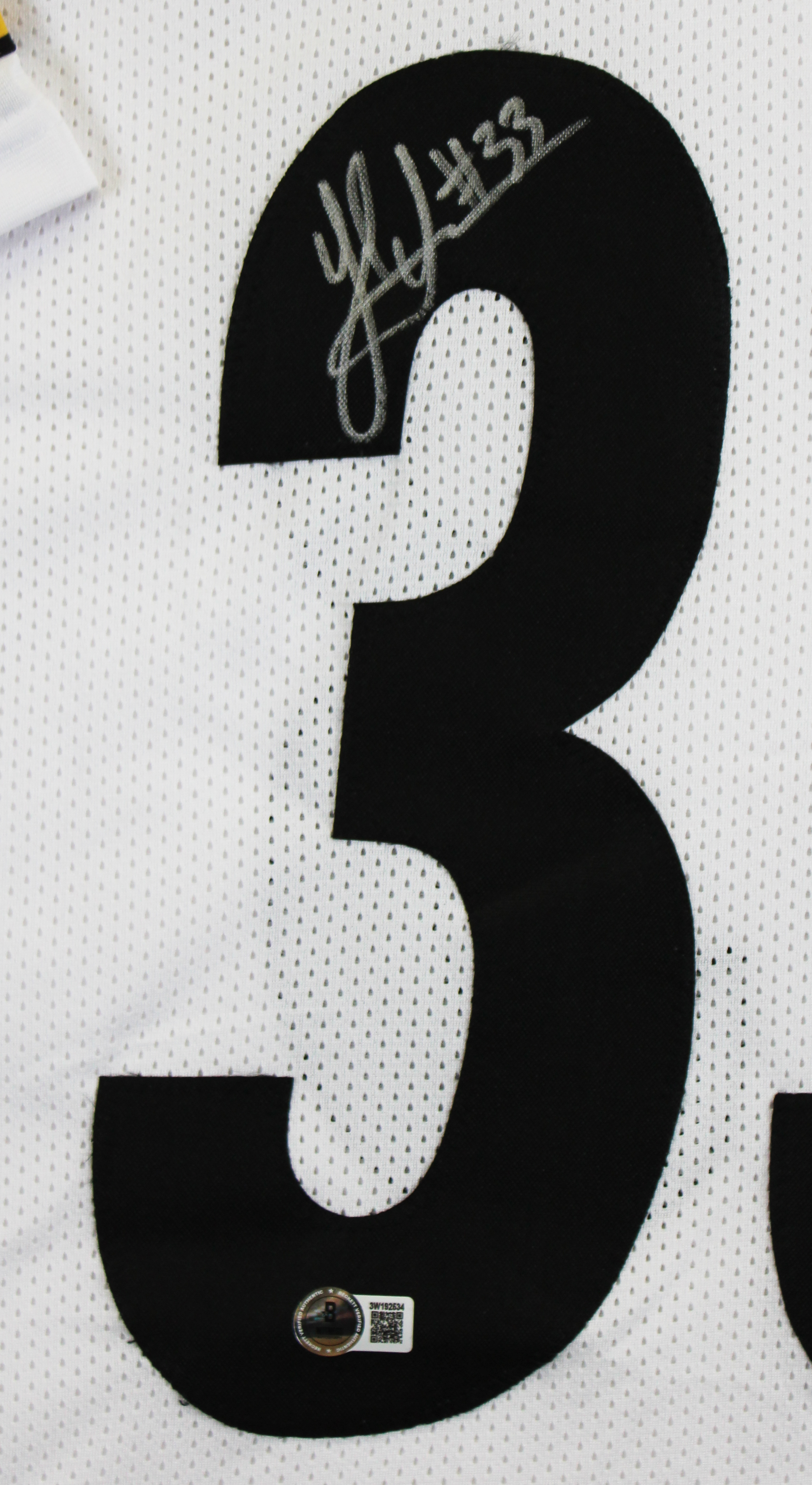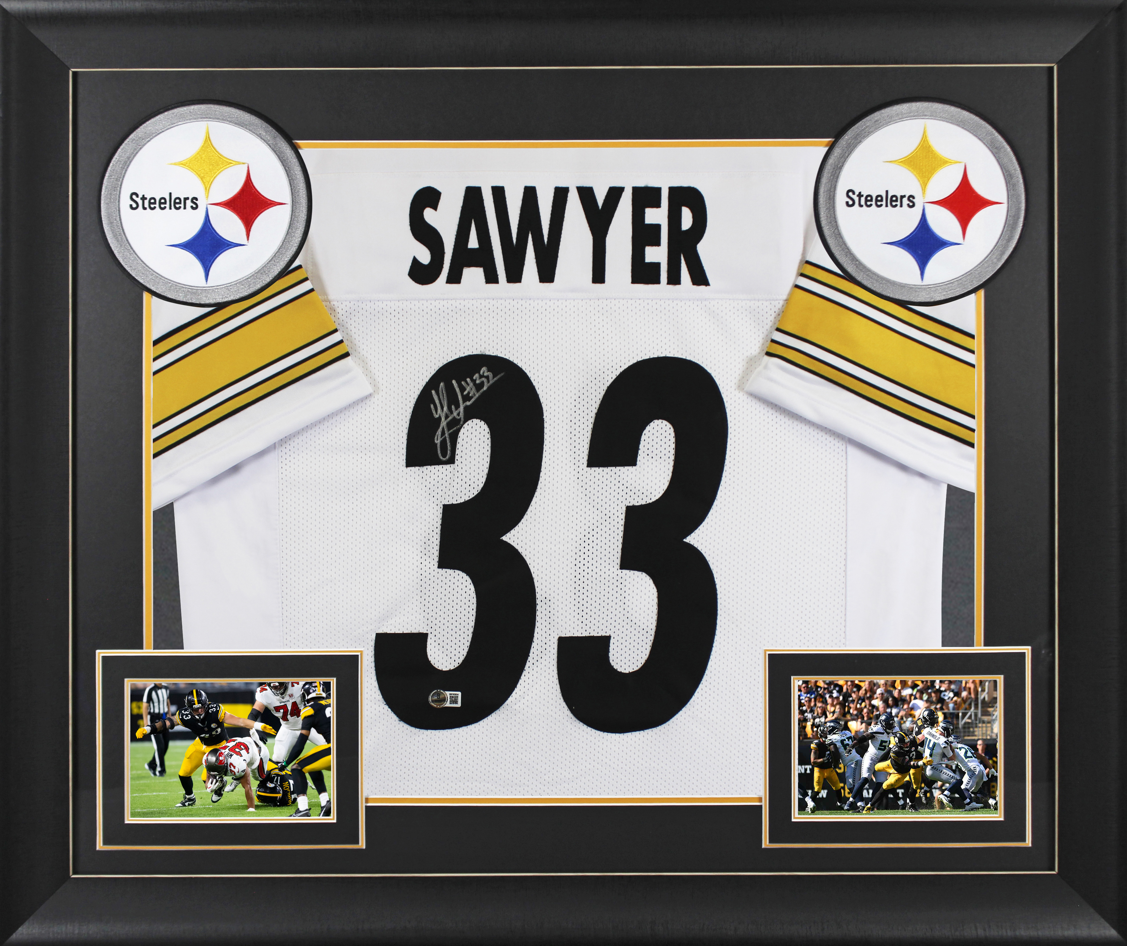 This Autographed White Pro Style Framed Jersey has been Personally Signed by Jack Sawyer of the Pittsburgh Steelers. This item is 100% Authentic to include a hologram by Beckett Authentication Services. This item will come with an affixed Beckett Authentication Services (BAS) authentication sticker, which includes a scannable QR code to verify authenticity. Please note that Beckett no longer provides serial-numbered COA cards, and the attached BAS sticker will serve as the complete authentication for this item. This is a BAS Witnessed Protection Program item which means a Beckett Authentication Service representative was present when this item was being signed. We conducted an autograph signing with Jack Sawyer where multiples of the same item were signed. While the photographs are representative of this item, the size, placement and strength of the signature may vary. Each item is hand signed, therefore, each autograph is unique. This item can be verified through BAS Witnessed. This item has been professionally framed to overall dimensions of approximately 32 x 37 inches. This is a X-Large sized, non-branded, custom-stitched Framed Jersey. This jersey will be framed to order, it will take approximately 4-5 business days from purchase date for it to ship.