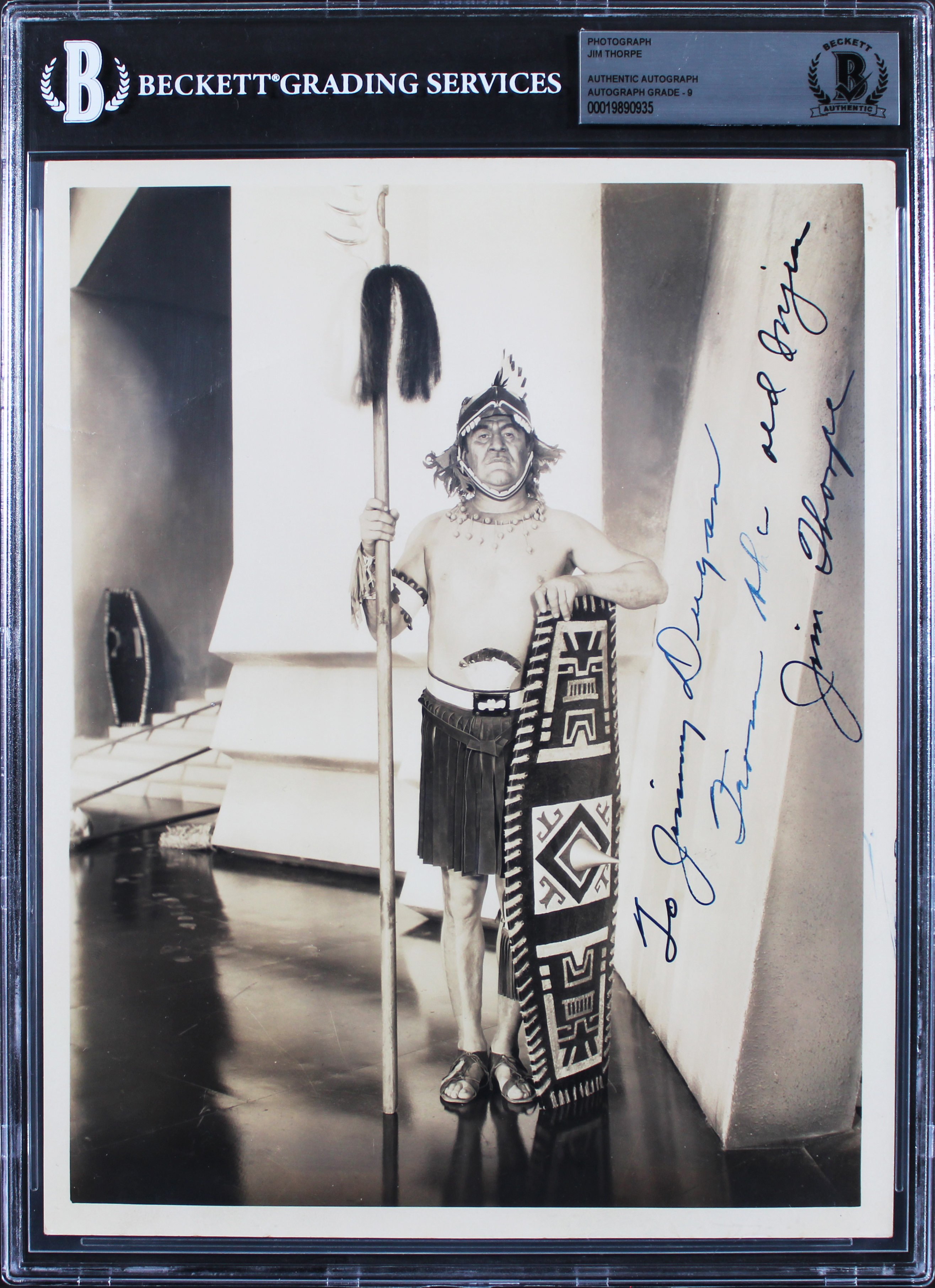 This Autographed Auto Graded Mint 9! 8x10 Photo with the inscription of "To Jimmy Dugan, From the Old Injun" has been Personally Signed by Jim Thorpe. This item is 100% Authentic, it comes slabbed and authenticated by Beckett Authentication Services. The authenticity can be verified on Beckett Authentication Services website.