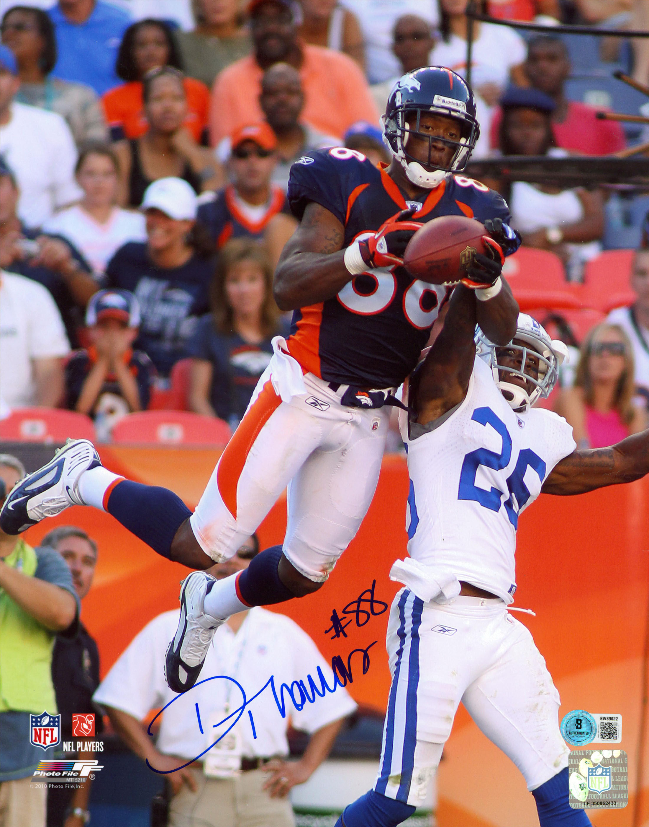 This Autographed Vertical 11x14 Photo has been Personally Signed by Demaryius Thomas of the Denver Broncos. This item is 100% Authentic to include a hologram by Beckett Authentication Services. This item will come with an affixed Beckett Authentication Services (BAS) authentication sticker, which includes a scannable QR code to verify authenticity. Please note that Beckett no longer provides serial-numbered COA cards, and the attached BAS sticker will serve as the complete authentication for this item. The authenticity can be verified on Beckett Authentication Services website.