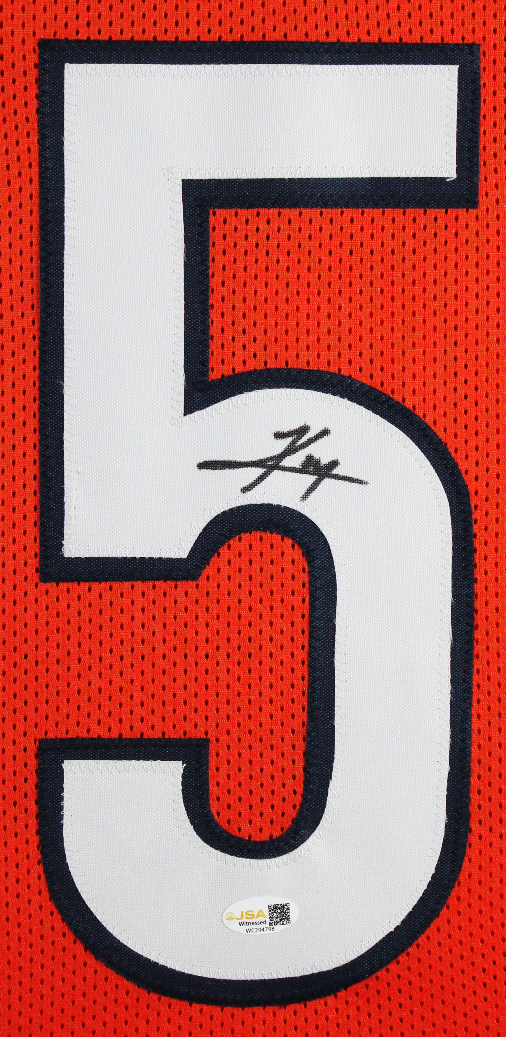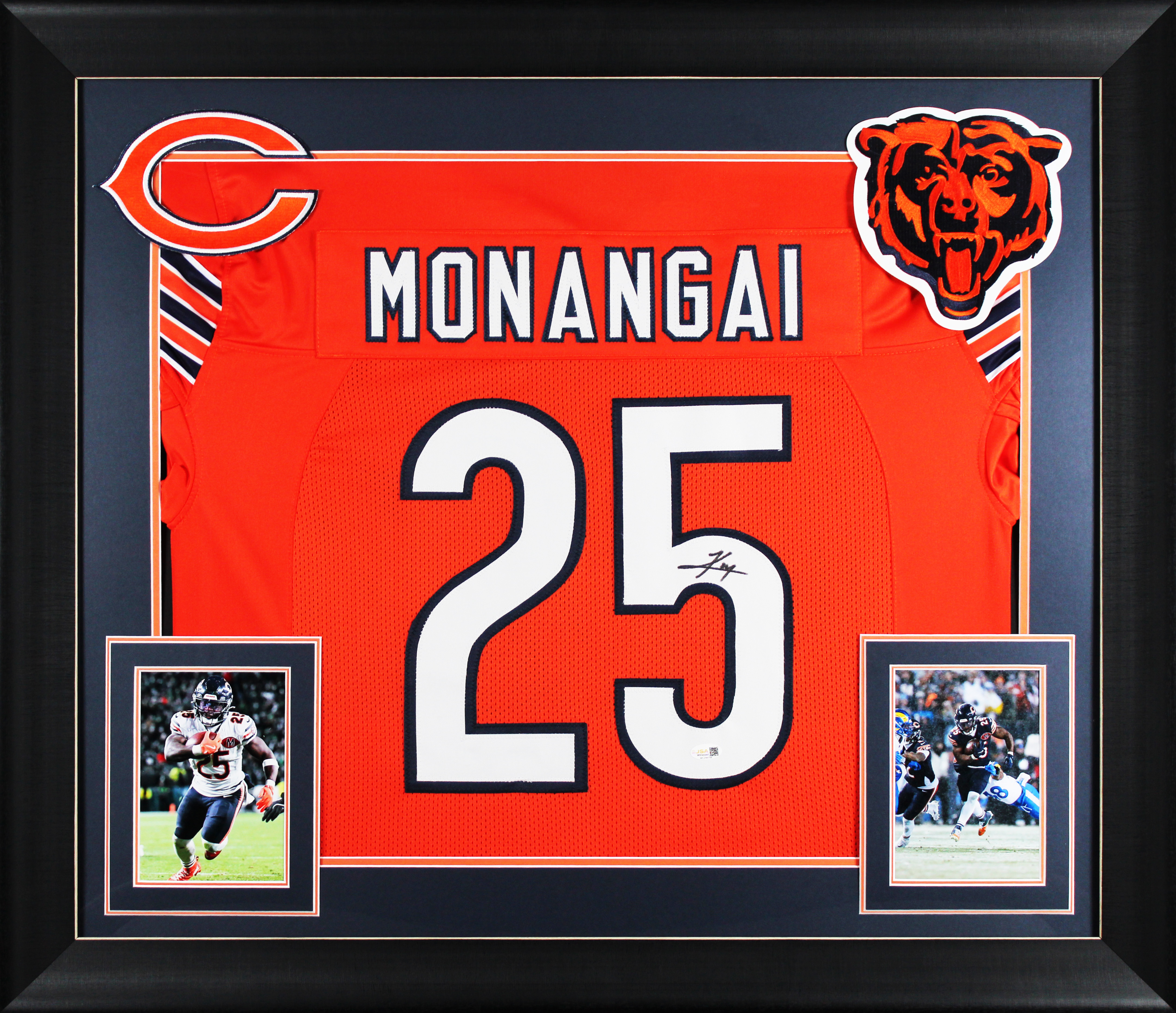 This Autographed Orange Pro Style Framed Jersey has been Personally Signed by Kyle Monangai of the Chicago Bears. This item is 100% Authentic to include a hologram by James Spence Authentication Services. This item will come with an affixed James Spence Authentication Services (JSA) authentication sticker, which includes a scannable QR code to verify authenticity. Please note that JSA no longer provides serial-numbered COA cards with witnessed items, and the attached JSA sticker will serve as the complete authentication for this item. This is a JSA Witnessed Protection Program item which means a JSA representative was present when this item was being signed. We have multiples of this same item. While the photographs are representative of this item, the size, placement and strength of the signature may vary. Each item is hand signed, therefore, each autograph is unique. This item has been professionally framed to overall dimensions of approximately 32 x 37 inches. This is a X-Large sized, non-branded, custom-stitched Framed Jersey. This jersey will be framed to order, it will take approximately 4-5 business days from purchase date for it to ship.