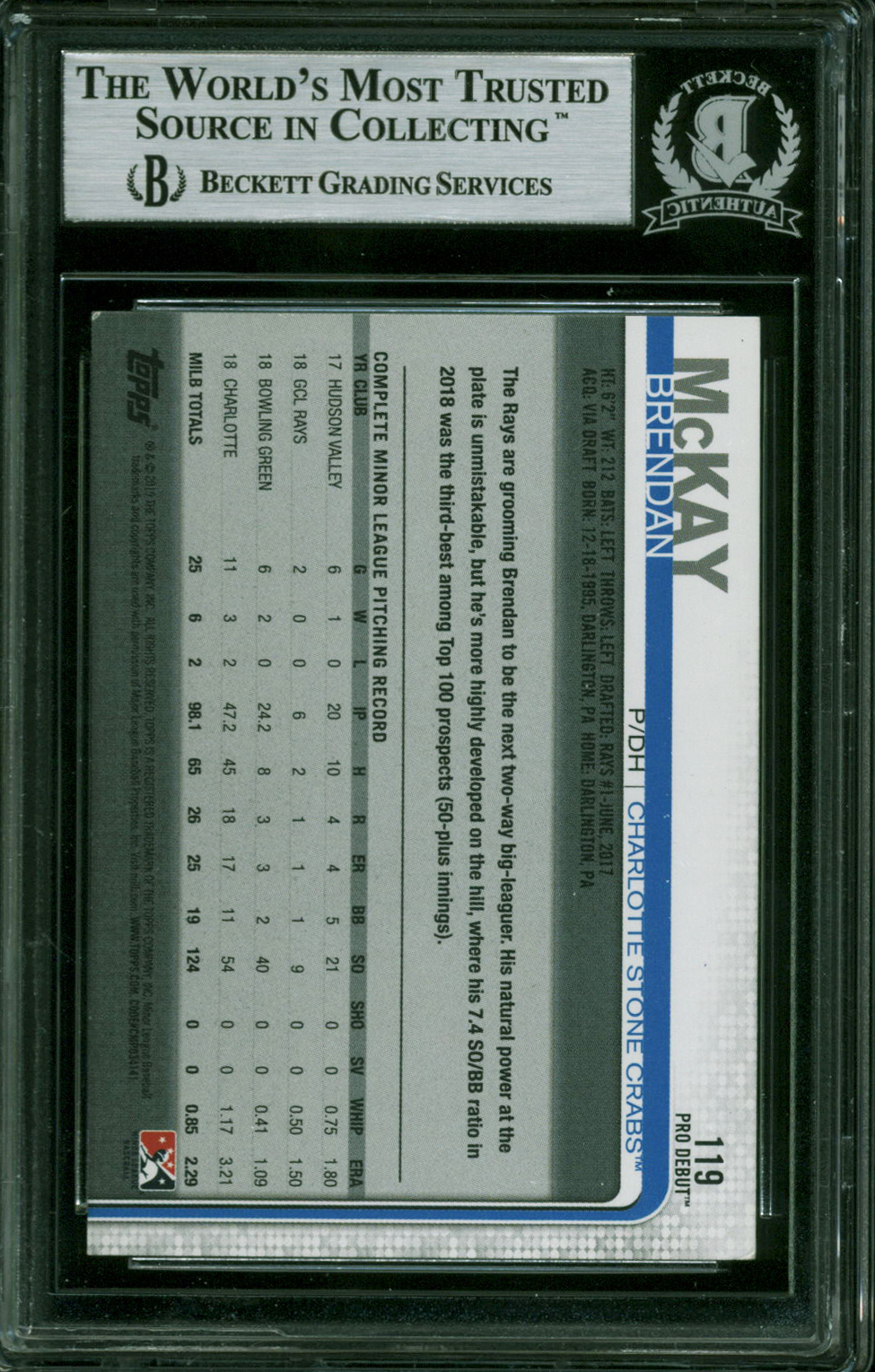 This Autographed 2019 Topps Pro Debut #119 Rookie Card has been Personally Signed by Brendan McKay of the Tampa Bay Rays. This item is 100% Authentic, it comes slabbed and authenticated by Beckett Authentication Services. The authenticity can be verified on Beckett Authentication Services website.