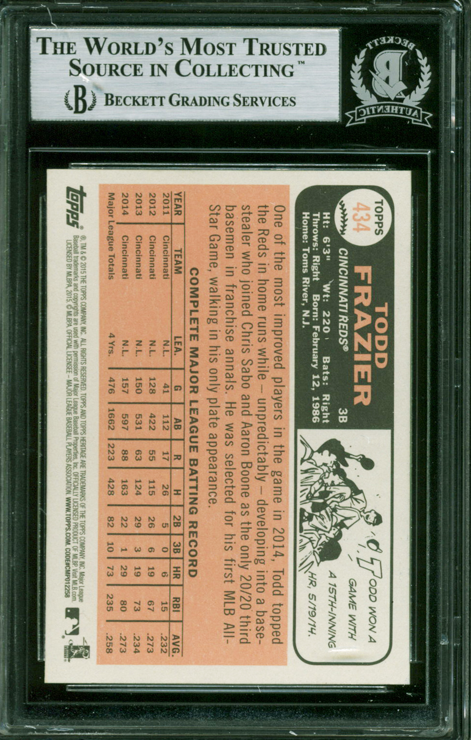 This Autographed 2015 Topps Heritage #434 Card has been Personally Signed by Todd Frazier of the Cincinnatti Reds. This item is 100% Authentic, it comes slabbed and authenticated by Beckett Authentication Services. The authenticity can be verified on Beckett Authentication Services website.