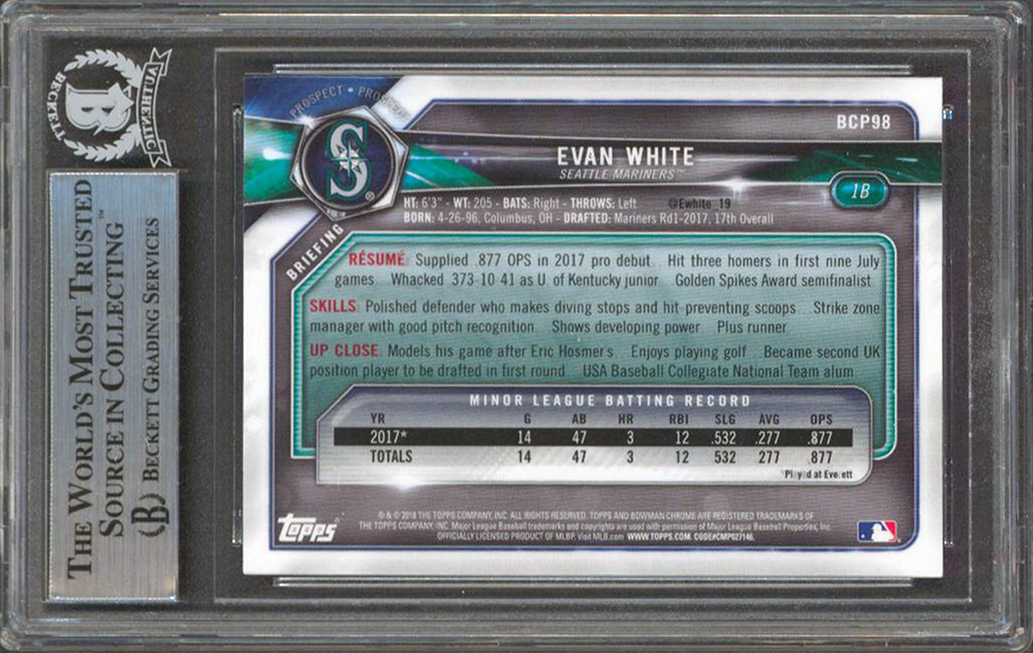 This Autographed 2018 Bowman Chrome Prospects #BCP98 Card has been Personally Signed by Evan White of the Seattle Mariners. This item is 100% Authentic, it comes slabbed and authenticated by Beckett Authentication Services. The authenticity can be verified on Beckett Authentication Services website.